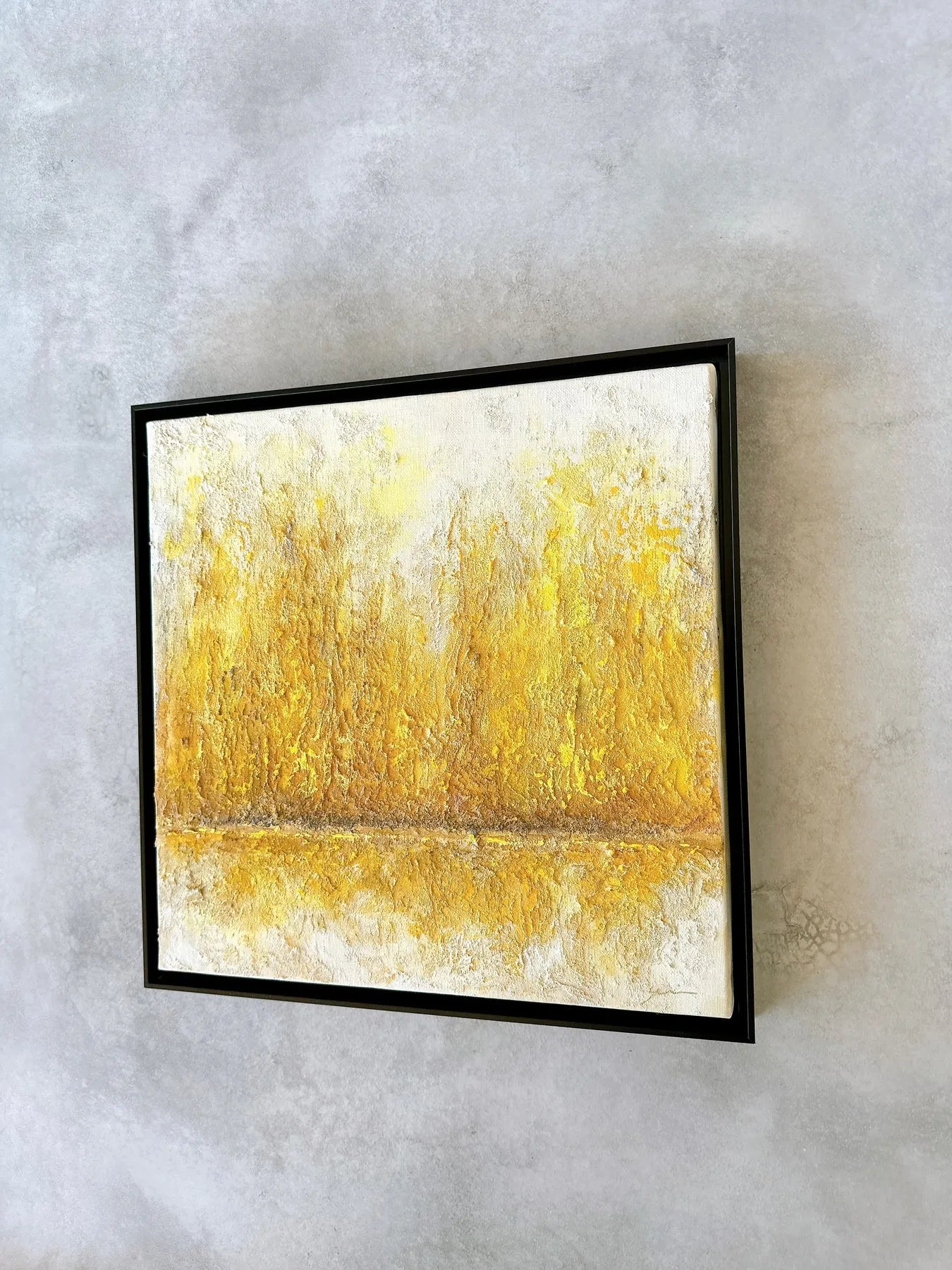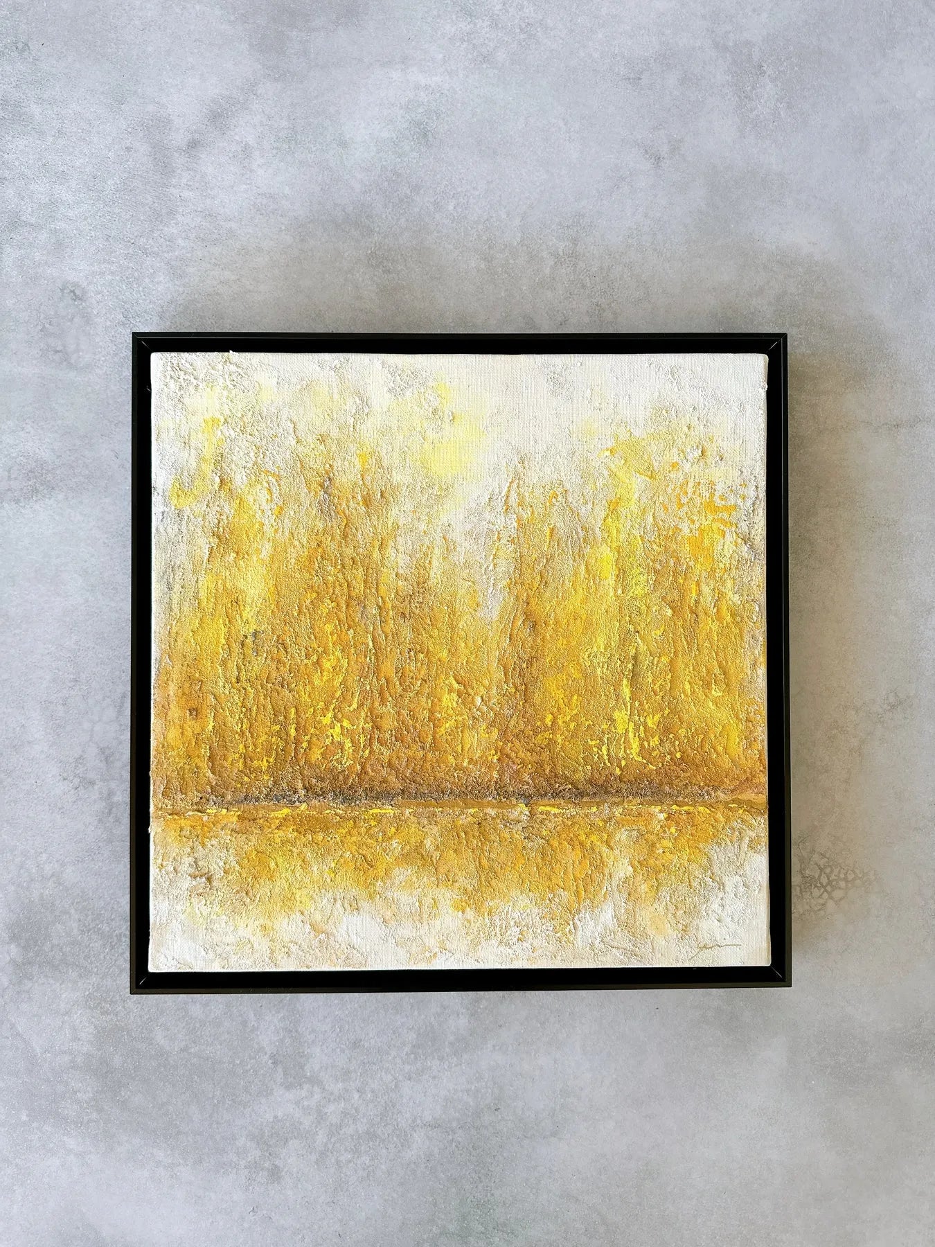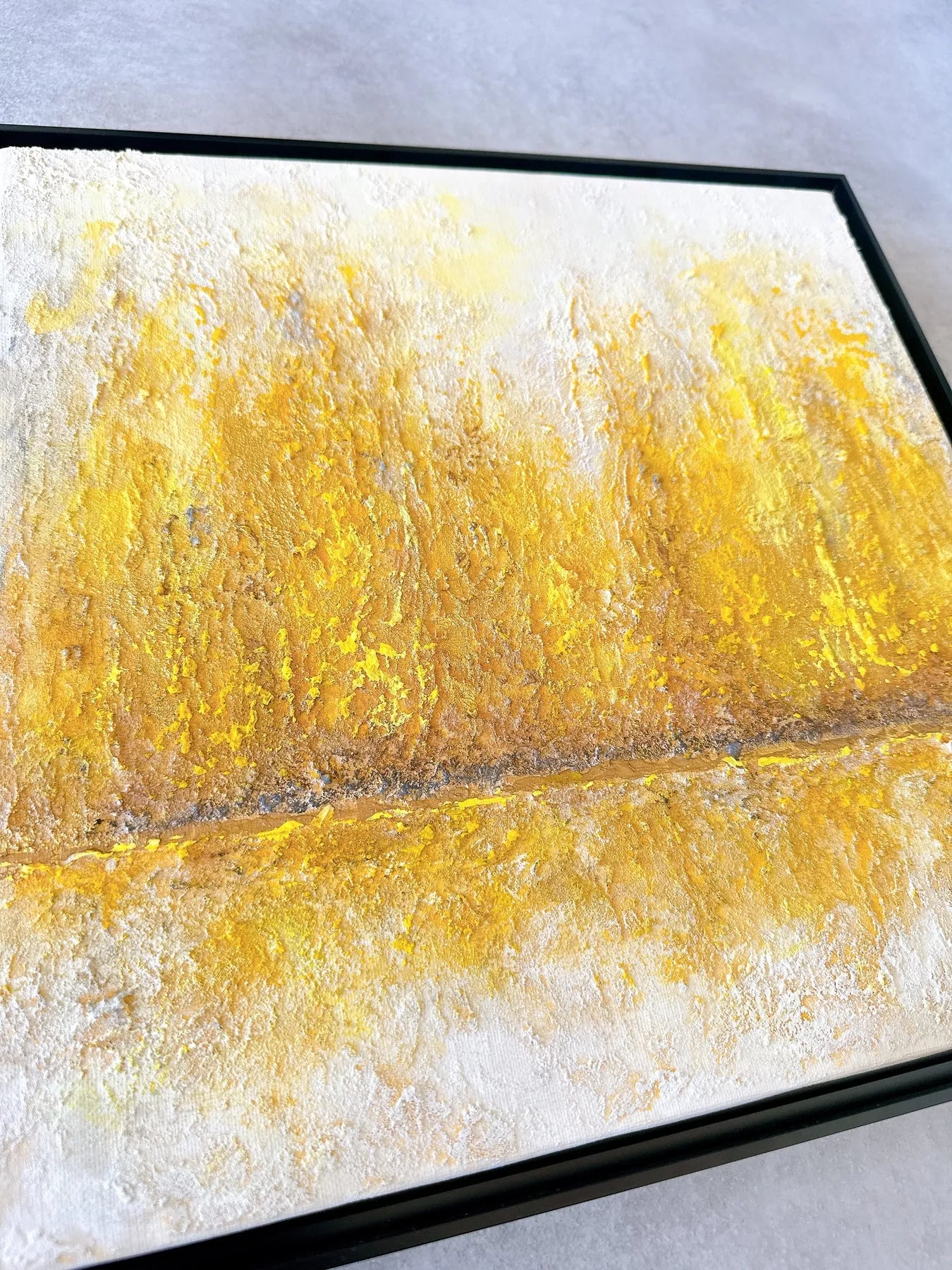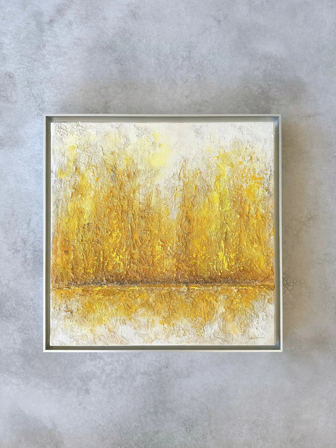 白の中に金色がにじみ、幾層にも重なった質感が静かな奥行きを生む一枚です。荒さを残した表面と、中央を走る水平のラインが、光と時間の積み重なりを感じさせます。リビングやワークスペースに飾ることで、空間に穏やかな明るさと芯のある落ち着きが生まれ、視線を静かに受け止めてくれます。ミニマルなインテリアや無機質な空間にも、温度を添える抽象作品です。