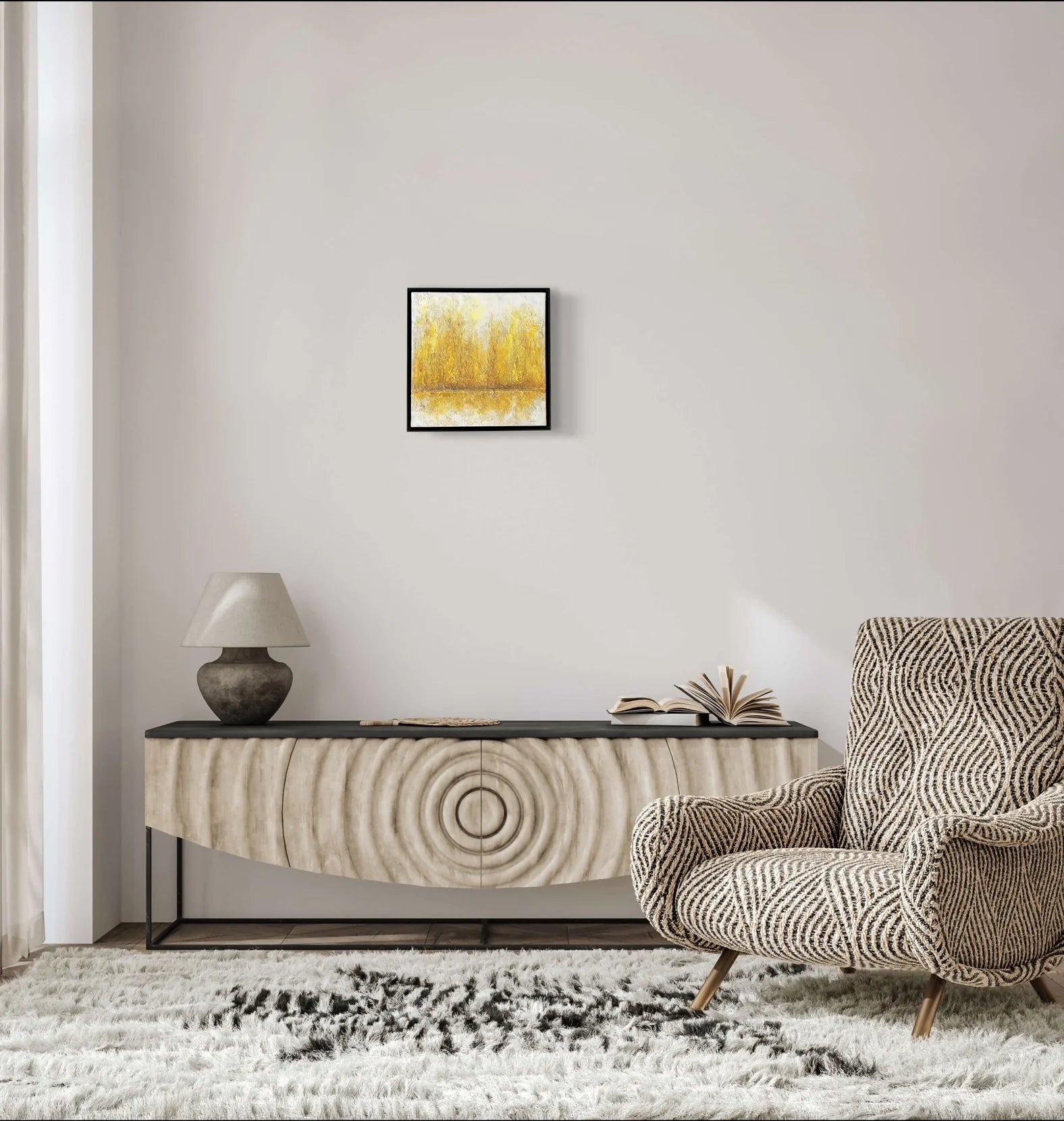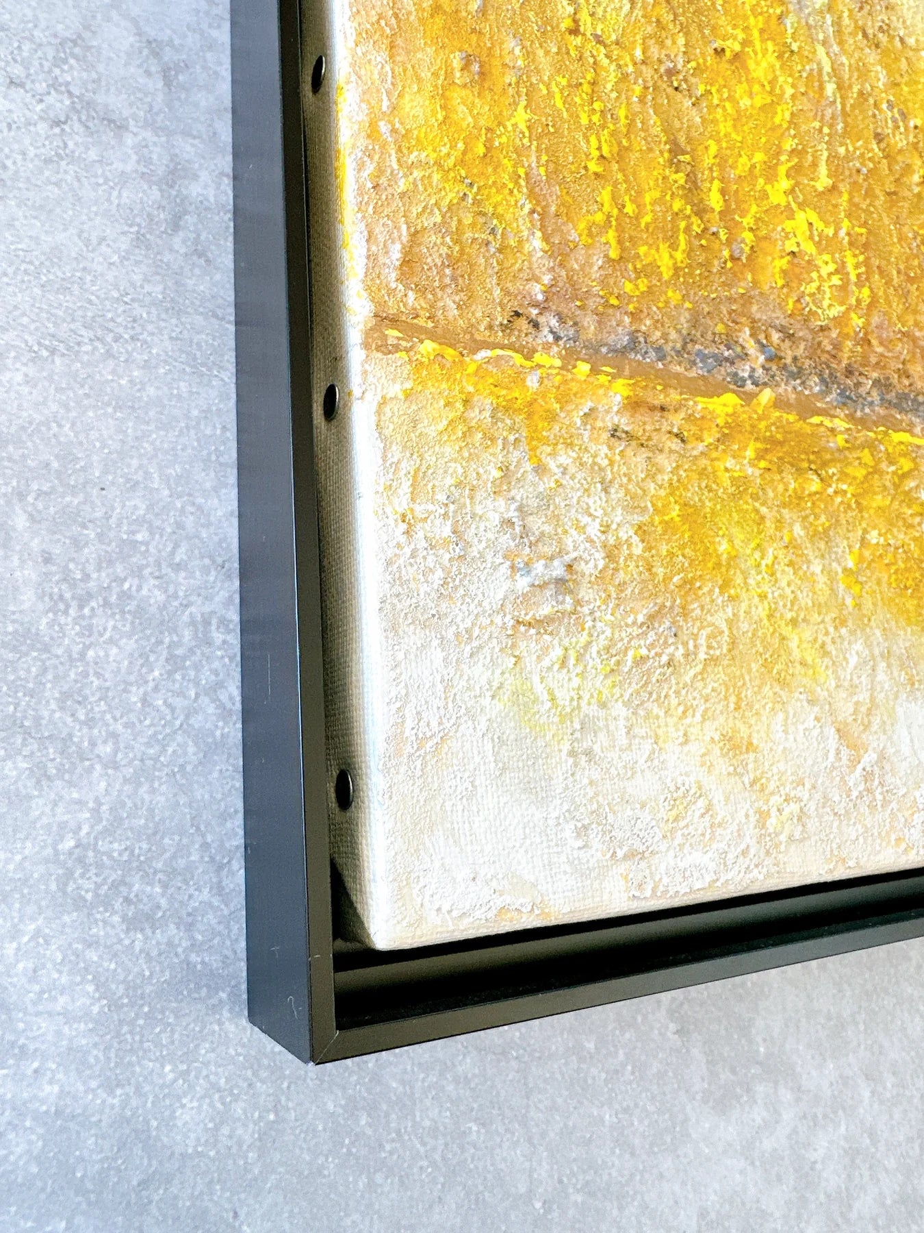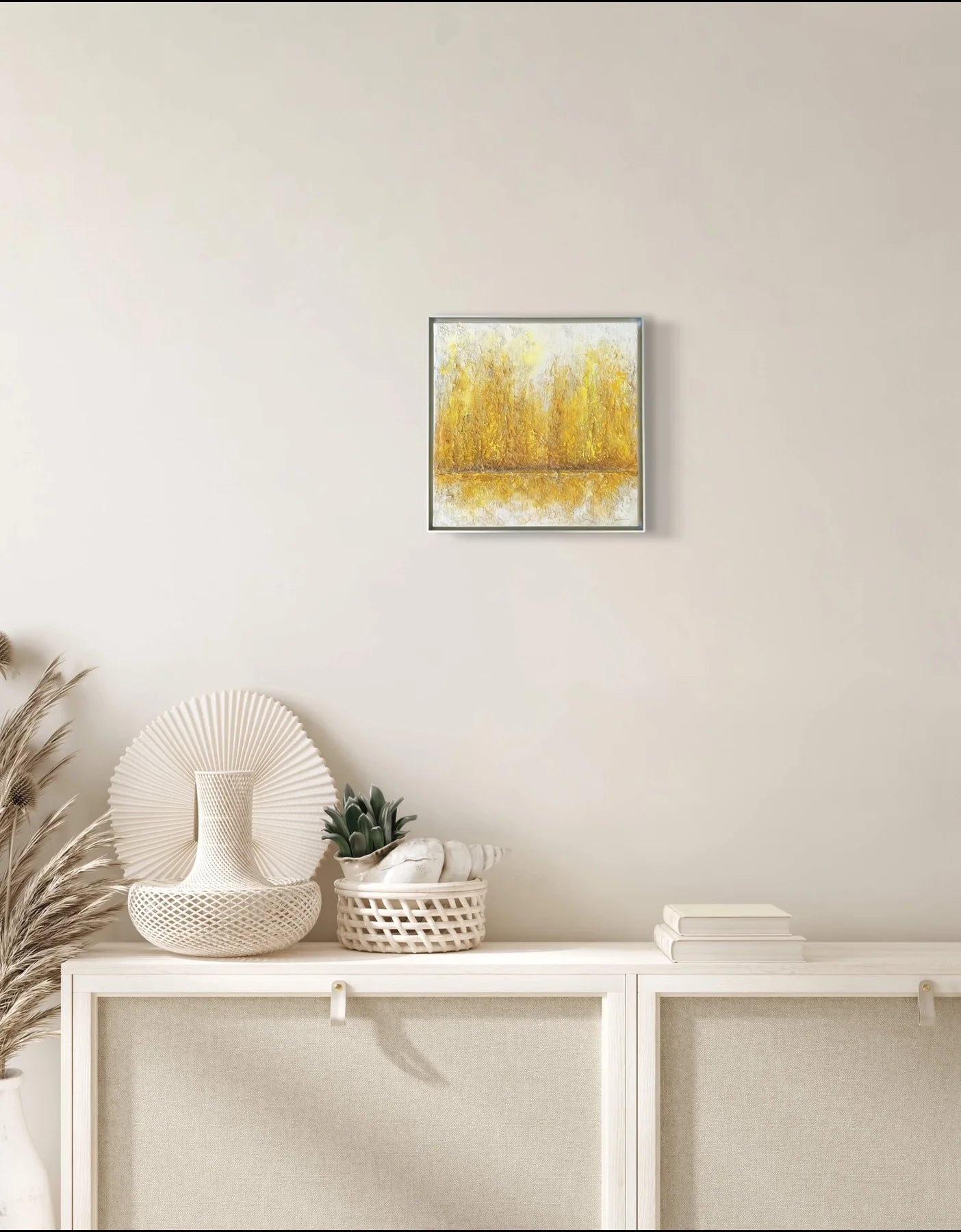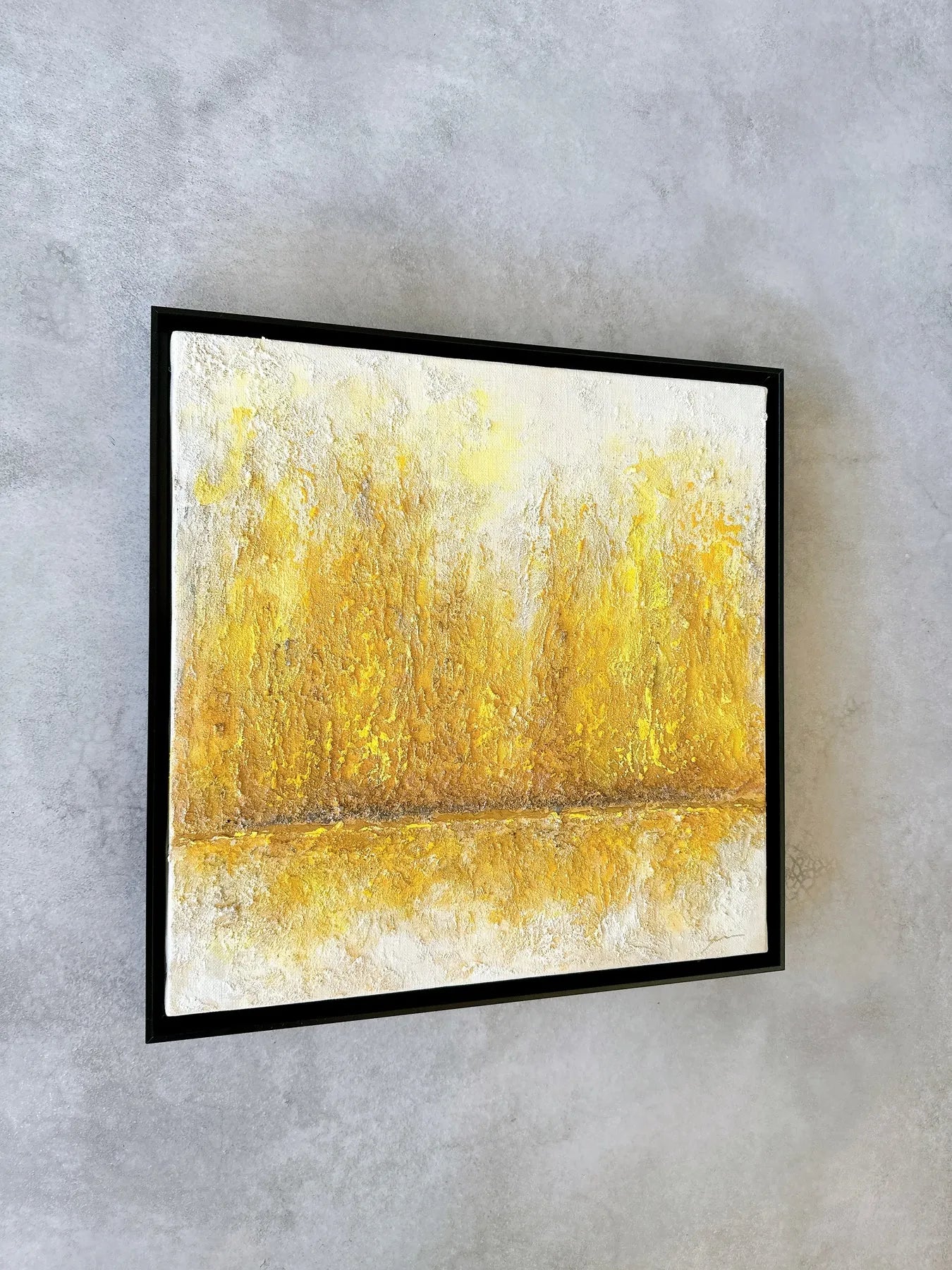 白の中に金色がにじみ、幾層にも重なった質感が静かな奥行きを生む一枚です。荒さを残した表面と、中央を走る水平のラインが、光と時間の積み重なりを感じさせます。リビングやワークスペースに飾ることで、空間に穏やかな明るさと芯のある落ち着きが生まれ、視線を静かに受け止めてくれます。ミニマルなインテリアや無機質な空間にも、温度を添える抽象作品です。