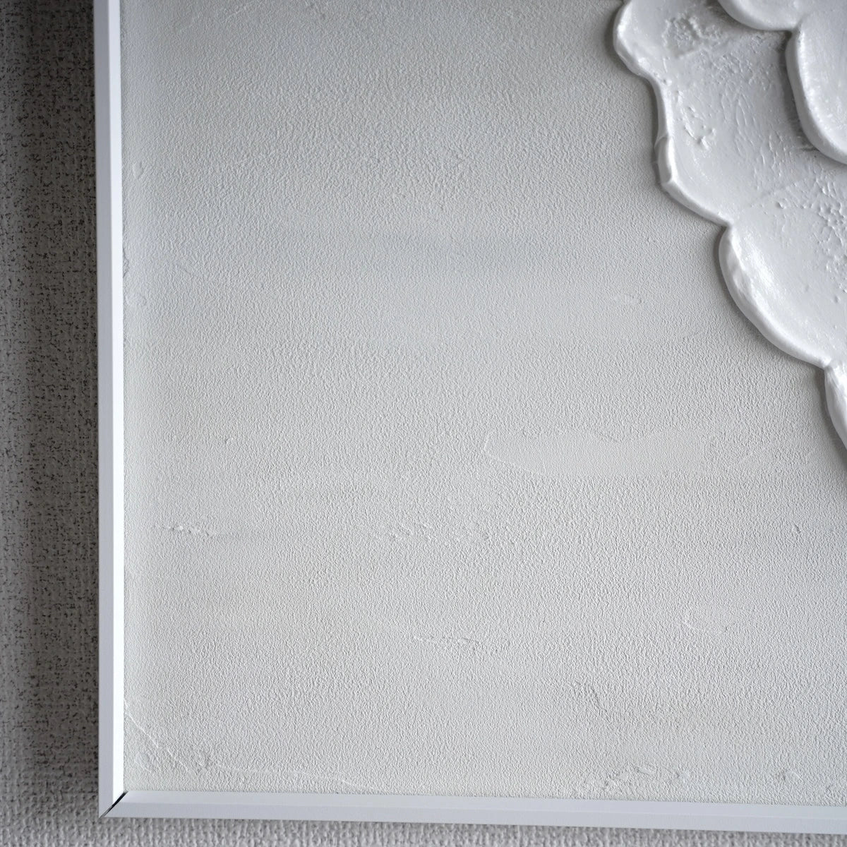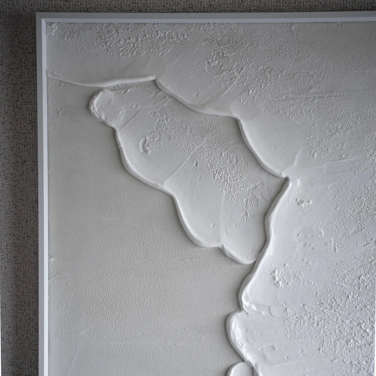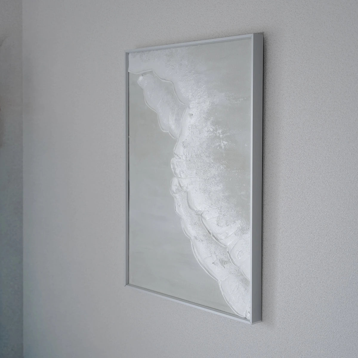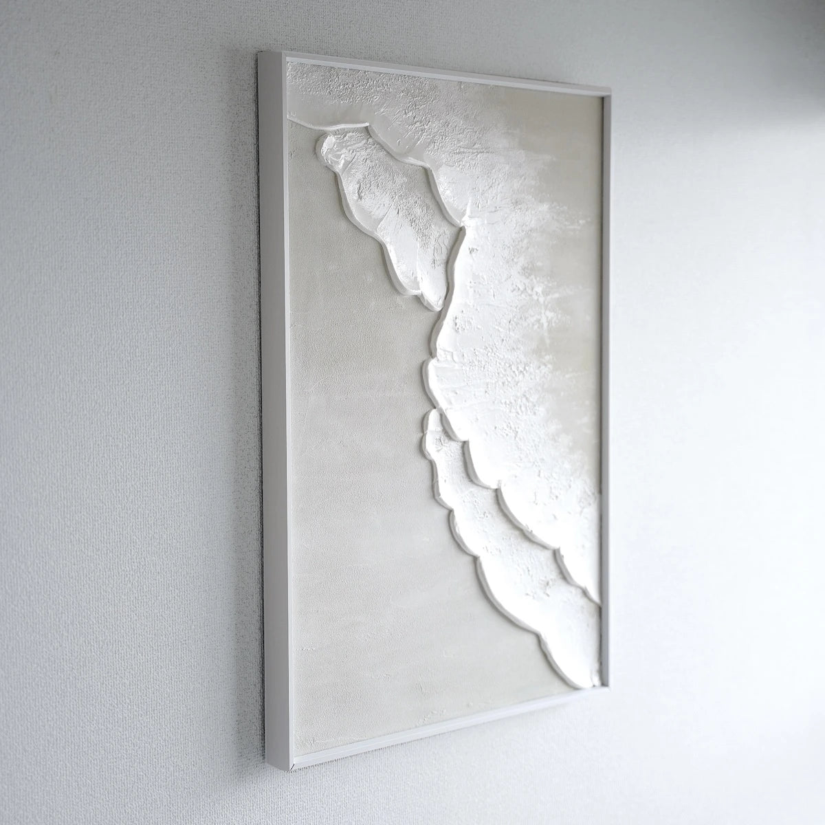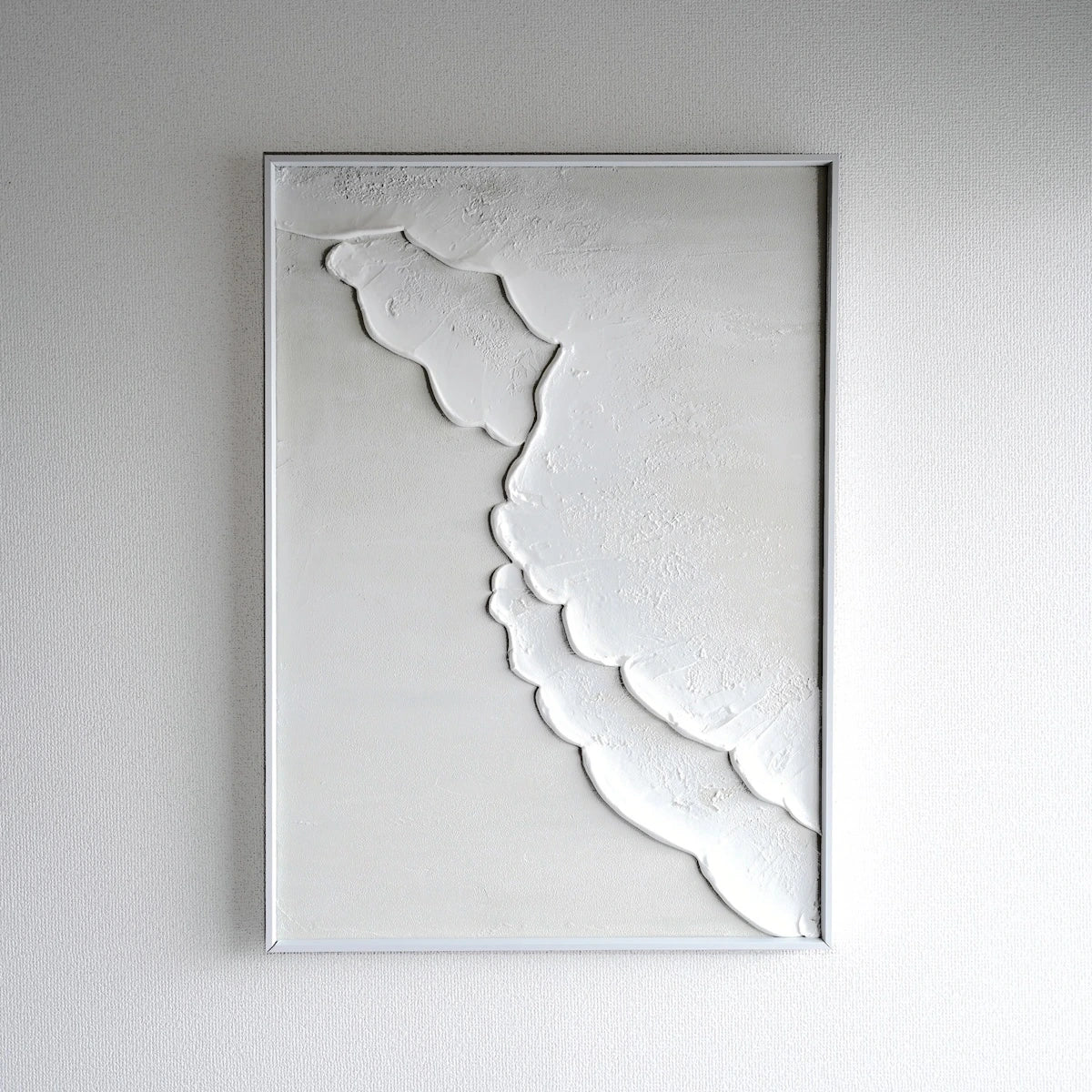 柔らかな起伏が壁に影を落とし、白のグラデーションが雲の縁のように穏やかに広がります。飾る瞬間に生まれる澄んだ空気が部屋を包み、空間全体に静かな緊張感を添えてくれます。モノトーンのリビングや落ち着いた寝室にも自然と寄り添い、整った雰囲気を優しく引き寄せます。