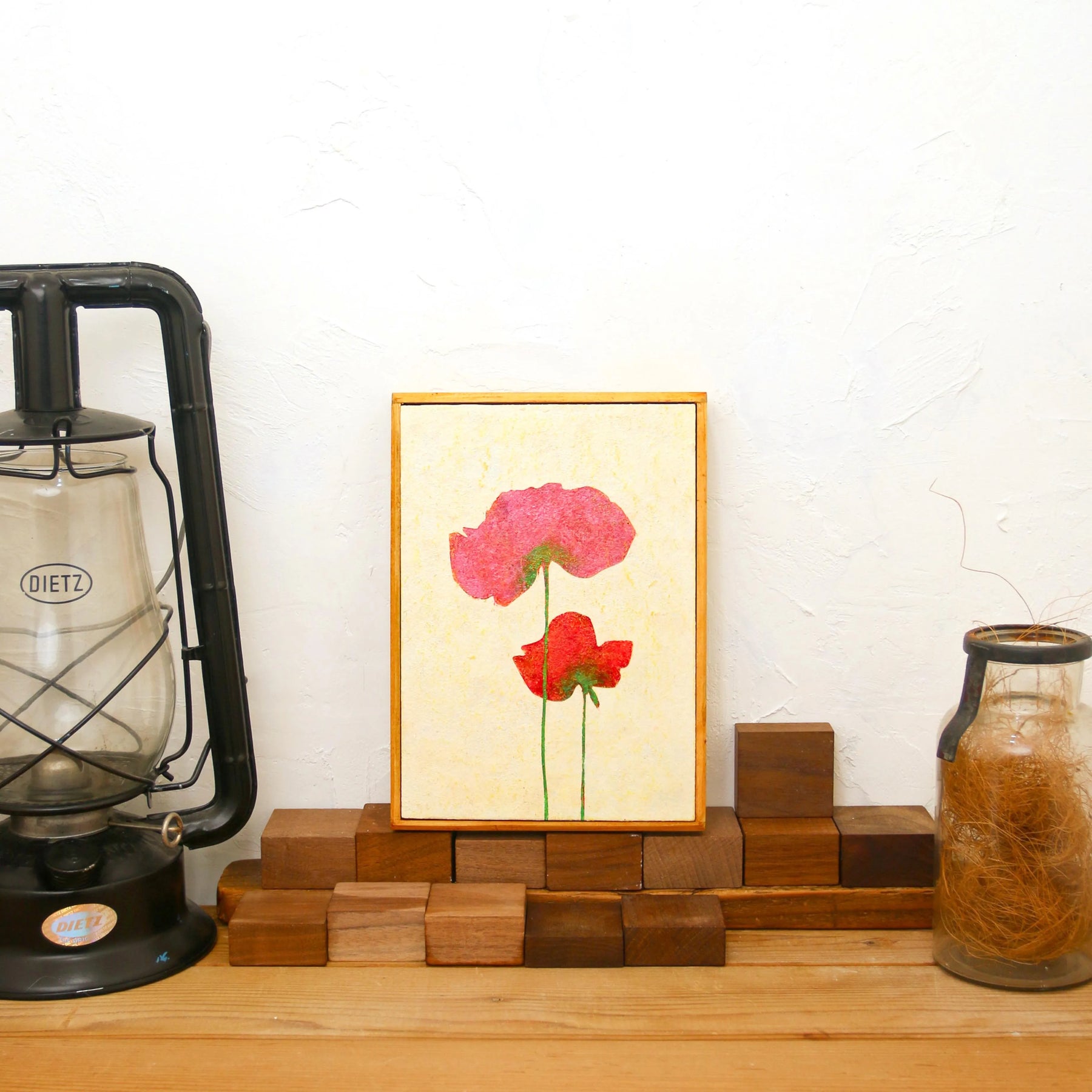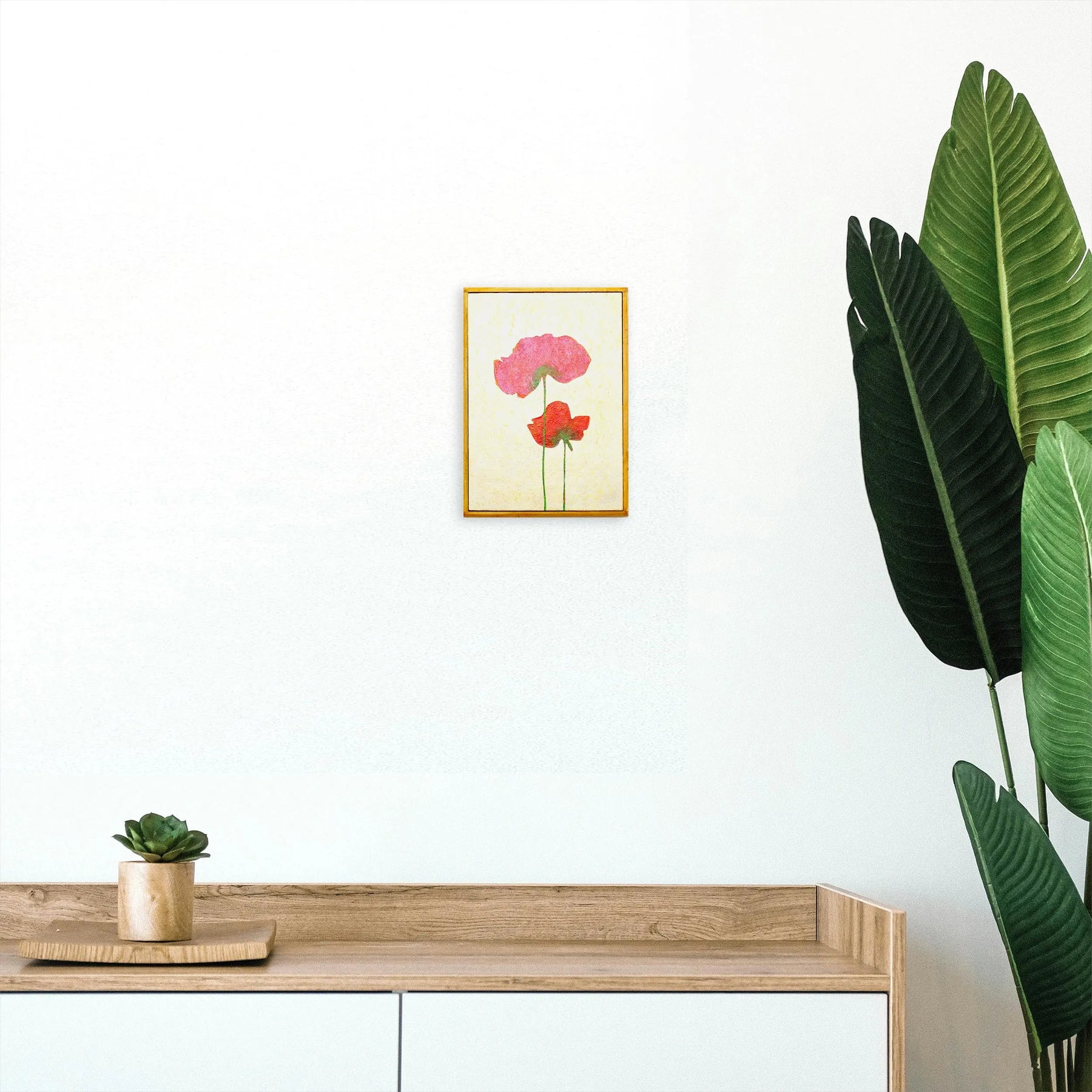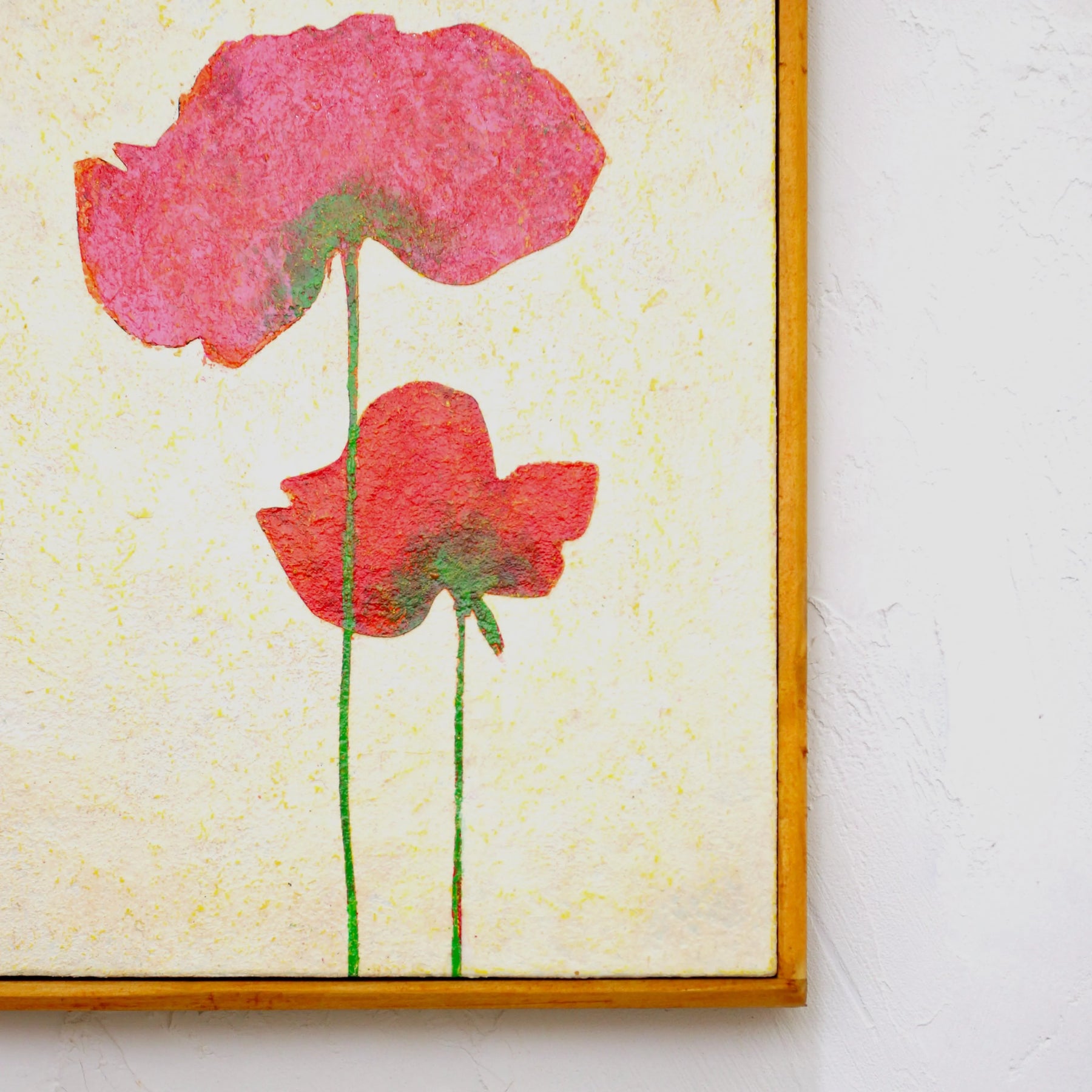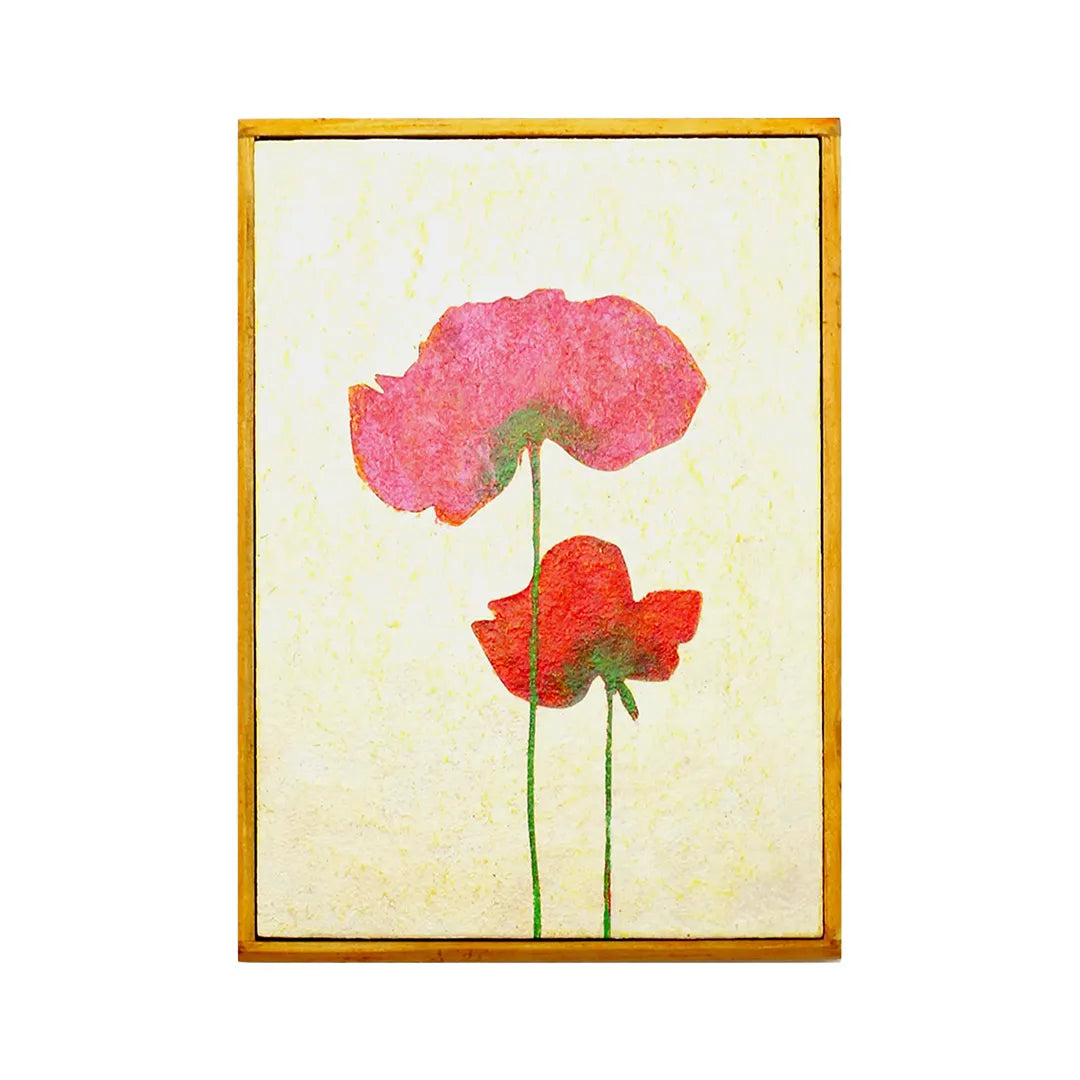 柔らかな和紙のような質感の中に、重なり合う二輪のポピーが、体温を感じさせるほど鮮やかに咲き誇っています。繊細な輪郭から溢れ出す色彩は、日常の何気ない幸福を映し出し、眺めるほどに心が穏やかな温度で満たされるでしょう。この温もりのある一作を飾ることで、室内には慈しみの空気が広がり、暮らしに安らかな和みを灯します。寝室や玄関に、素朴な木製家具と合わせるのが最適です。
