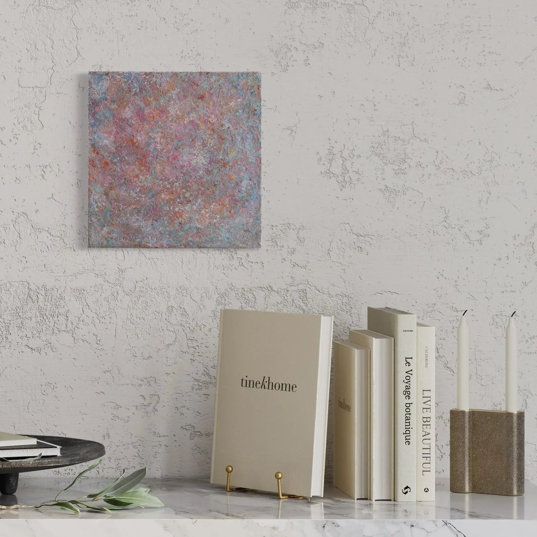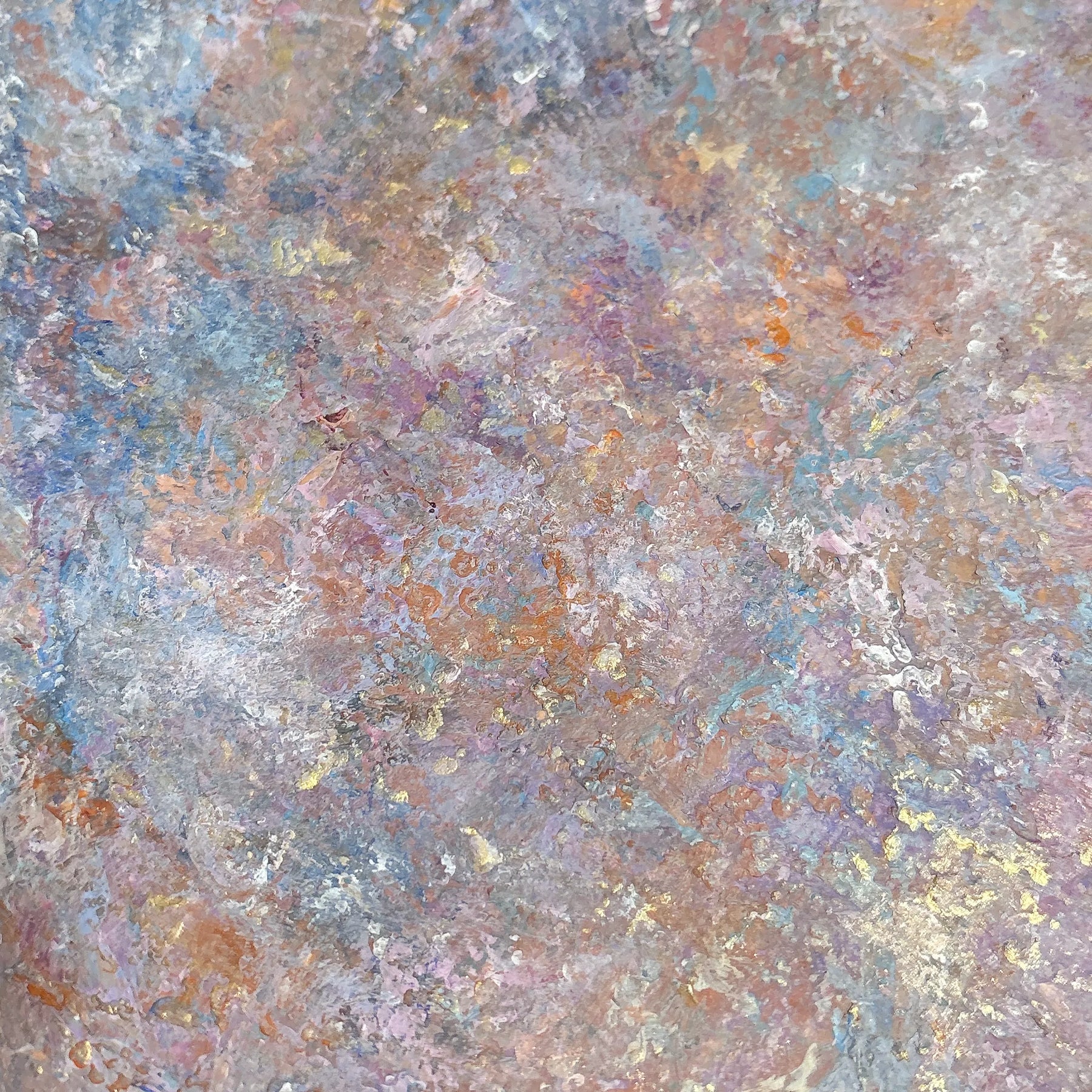 優しく重なり合うピンクや水色、そして暖かな大地の色彩が、和紙のような柔らかなマチエールの上に広がり、心の奥底にある懐かしい風景を呼び覚まします。幾重にも塗り重ねられた色彩の層は、過ぎ去った豊かな時間を封じ込めたようで、眺めるほどに穏やかな充足感に包まれるでしょう。この温もりのある一作を飾ることで、室内には慈しみの空気が広がり、暮らしに安らかな和みを灯します。