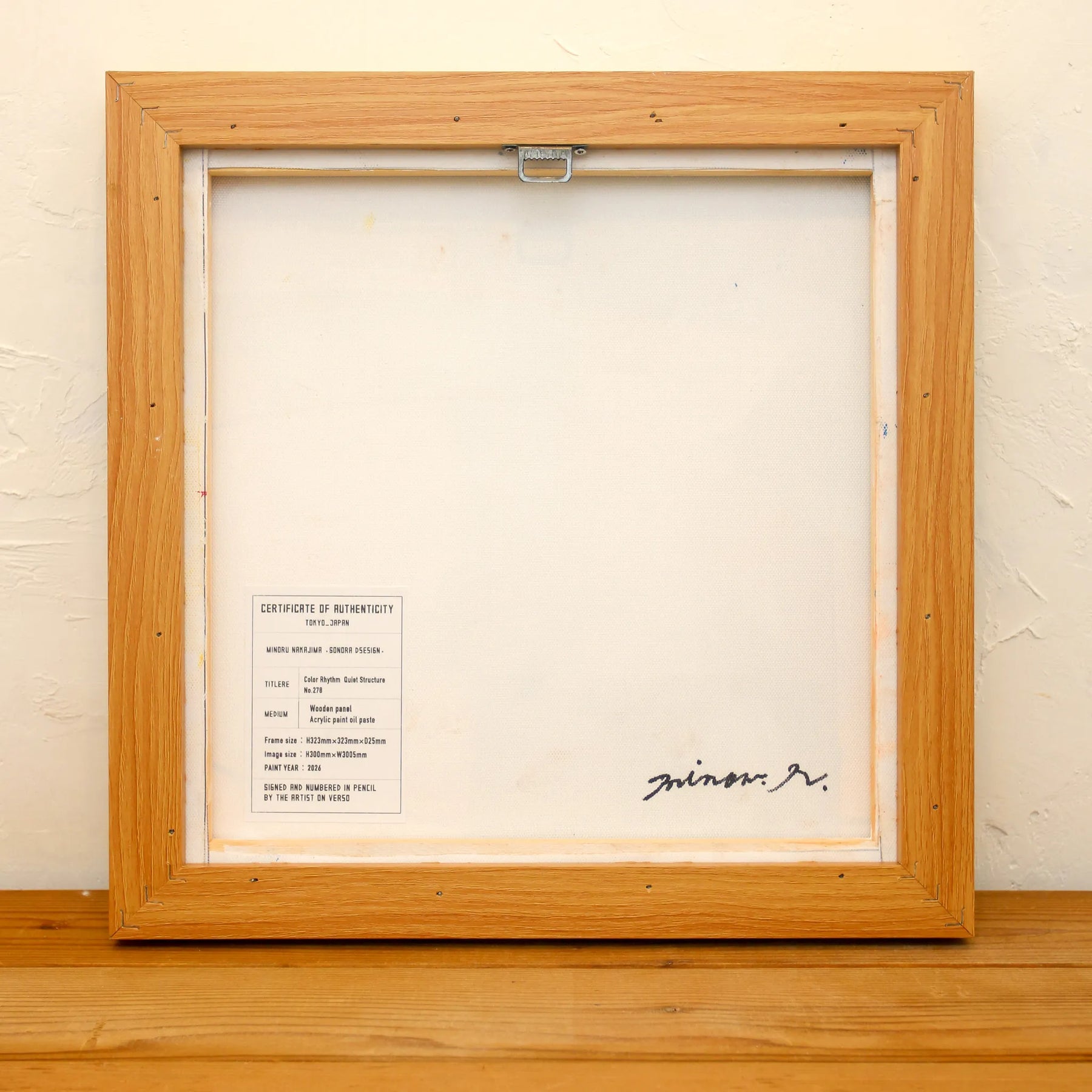 色と形が、静かにリズムを刻んでいく。 重ねた色のズレや、線の緊張感の中に、 偶然とコントロールのあいだを行き来する感覚を残しました。 主張しすぎないけれど、ふと視線を引き留める。 そんな「静かな構造」を意識した一枚です。