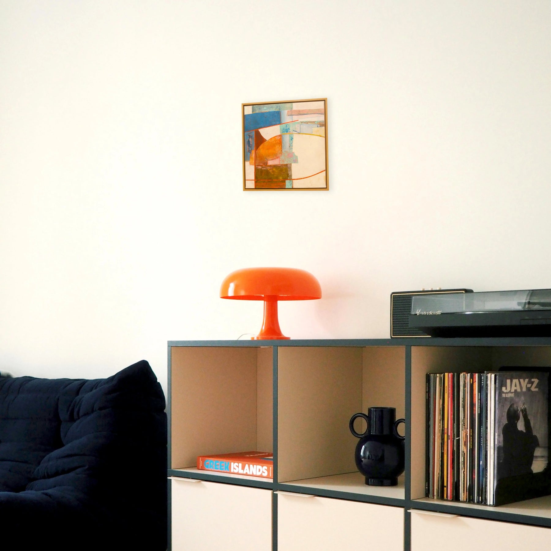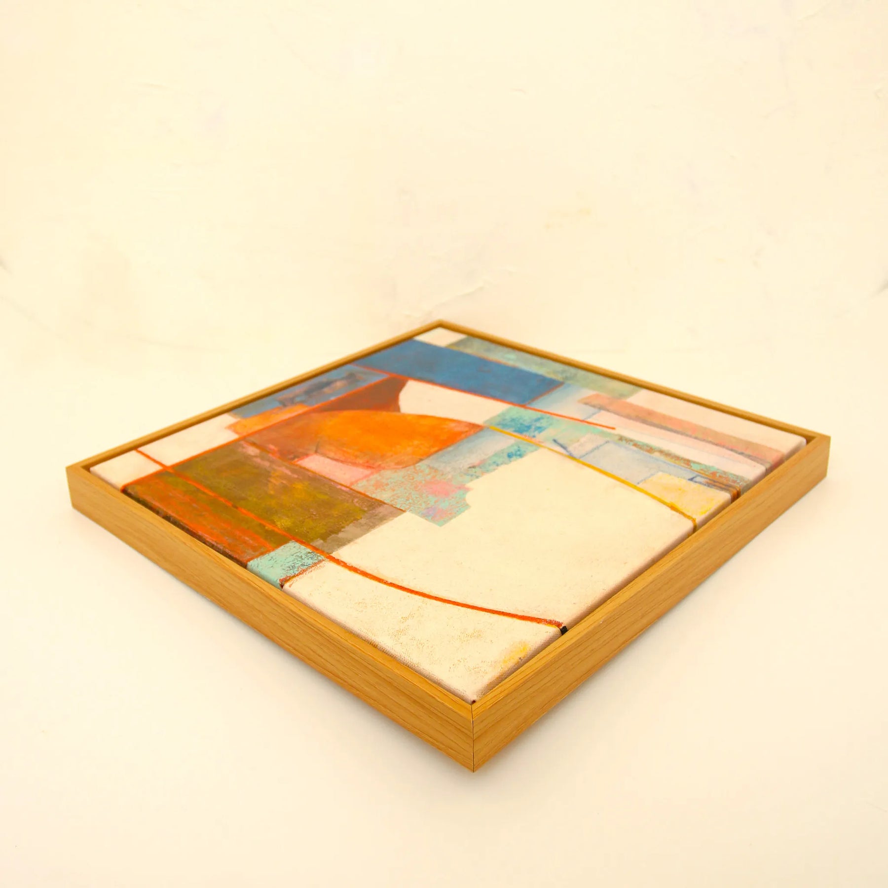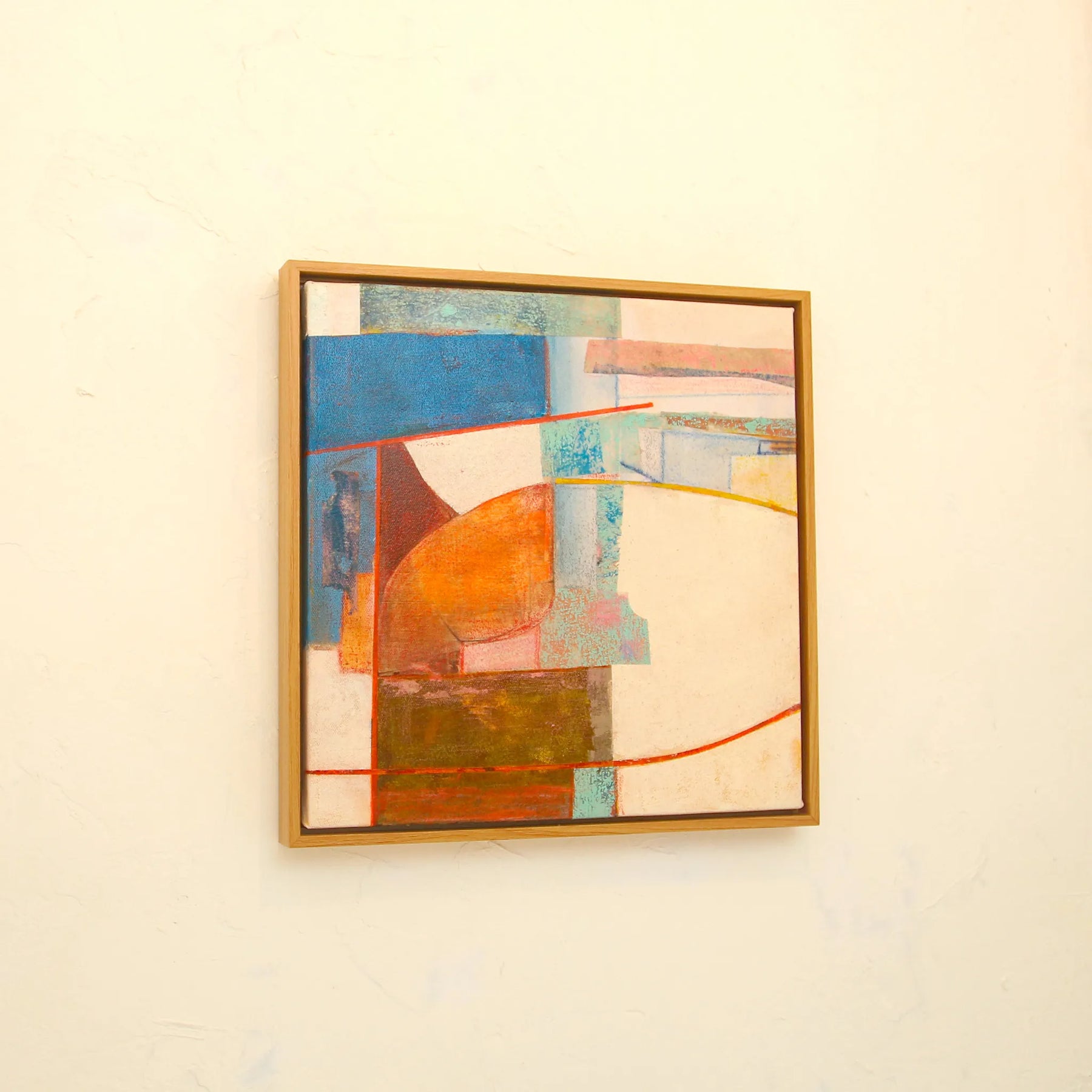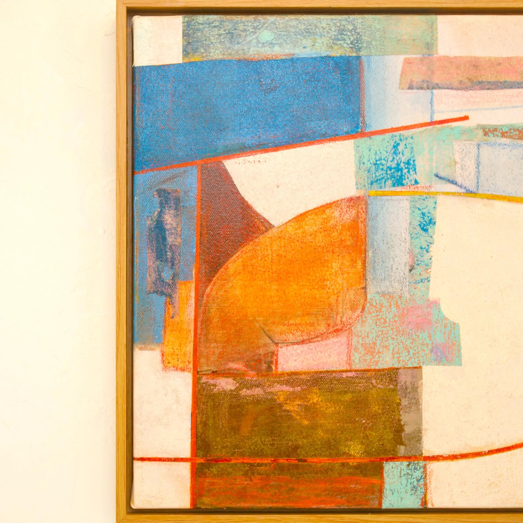 鮮やかなオレンジや深みのある青が、窓から差し込む陽光のように重なり合い、心地よい活気をもたらします。直線と曲線が織りなす構成は、どこか懐かしい街角の風景を切り取ったようで、眺めるたびに心が弾む楽しさに満ちています。この絵を壁に掛けるだけで、部屋の空気がぱっと明るく塗り替えられ、毎日の暮らしに前向きな活力が湧いてくるはずです。ダイニングや玄関のアクセントとして、明るい木目の家具とも素敵に調和します。