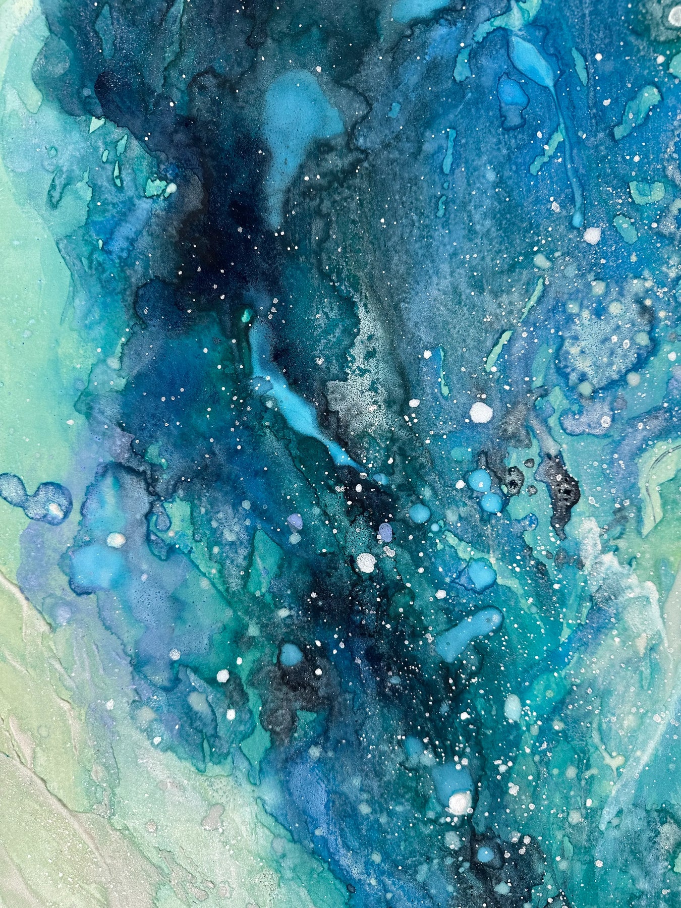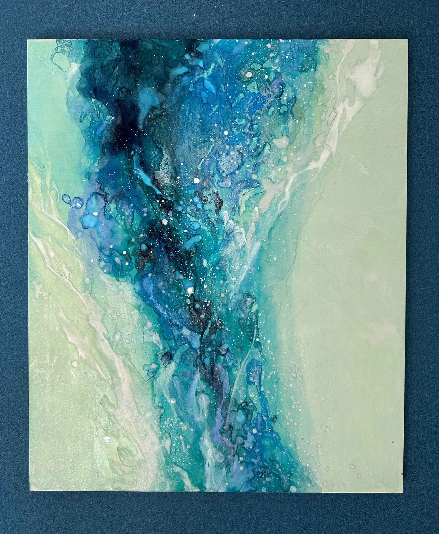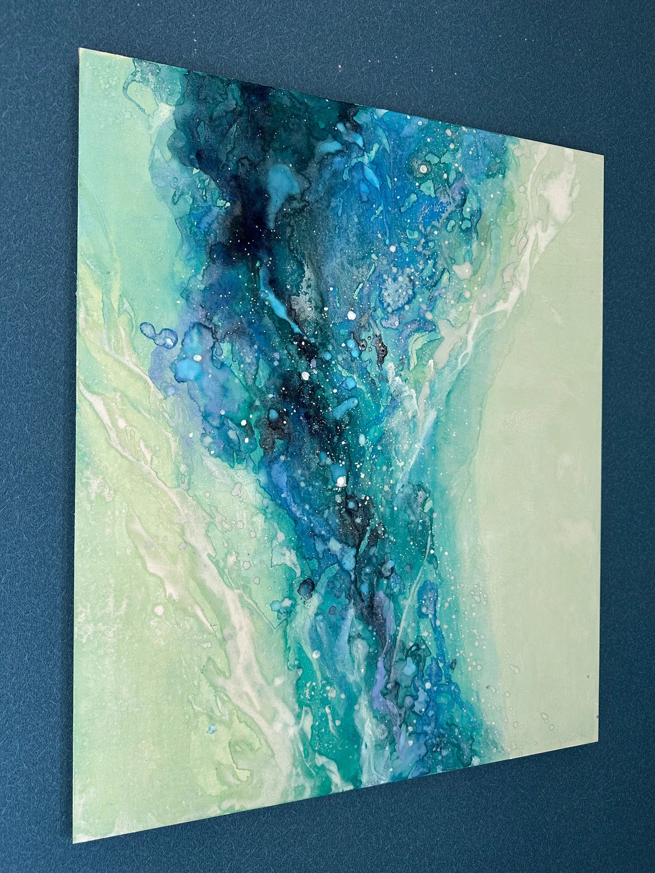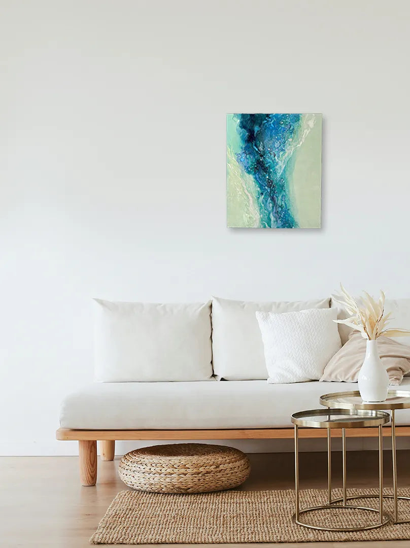 水と空が交わるように、碧と藍が織りなす抽象の流れは、まるで深海を静かに漂う感覚を呼び起こします。粒のような白が星のしずくにも見え、心に涼やかな余韻を残します。壁にそっと飾れば、空間に流れと透明感が生まれ、静かな躍動を感じさせてくれます。シンプルな木の家具や無機質なインテリアにも寄り添い、書斎やアトリエにも穏やかに映えます。