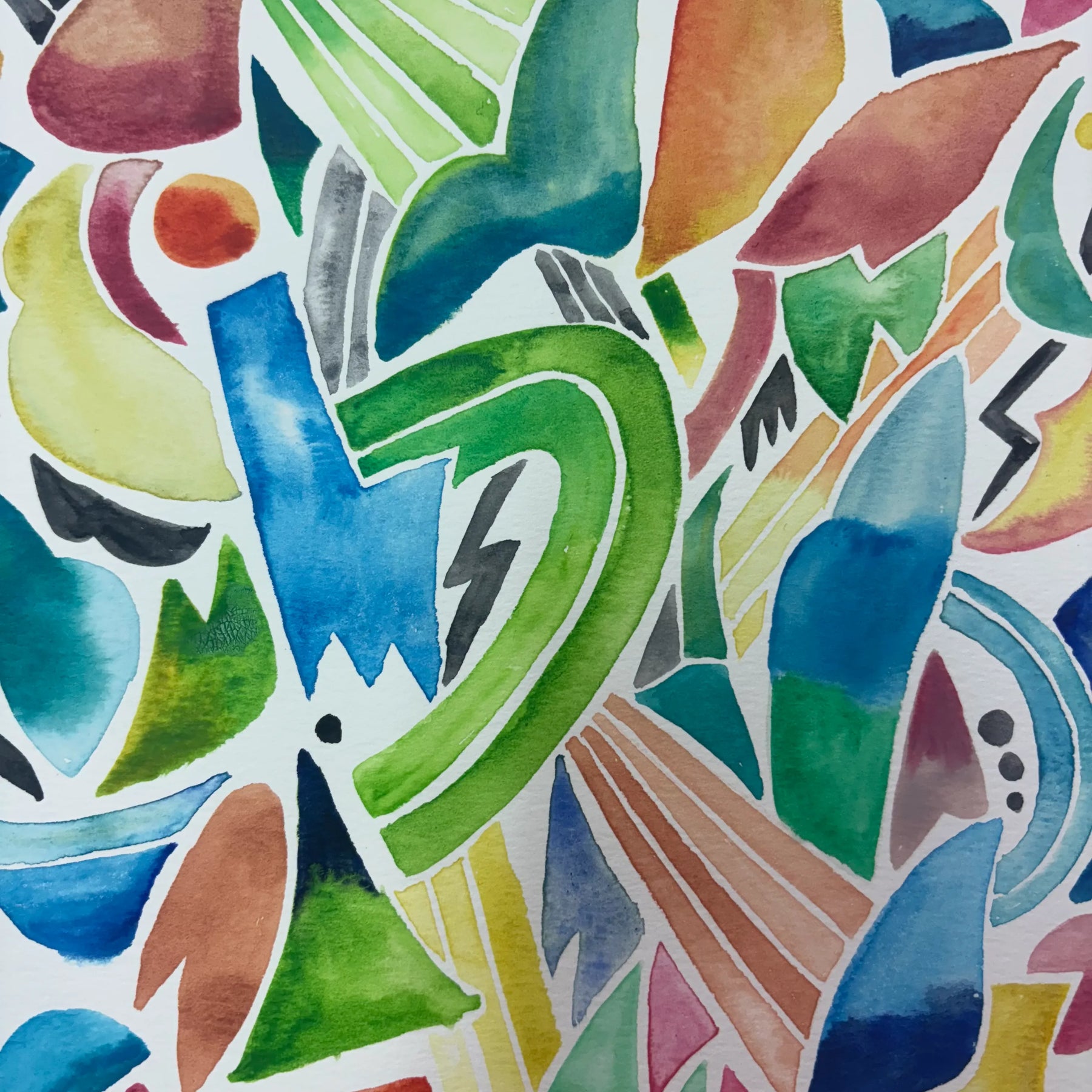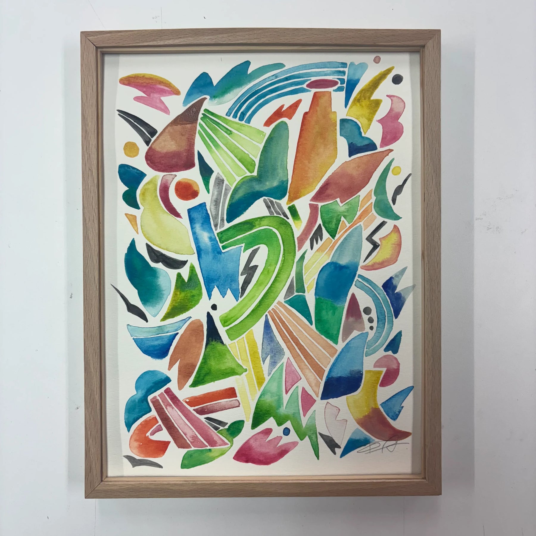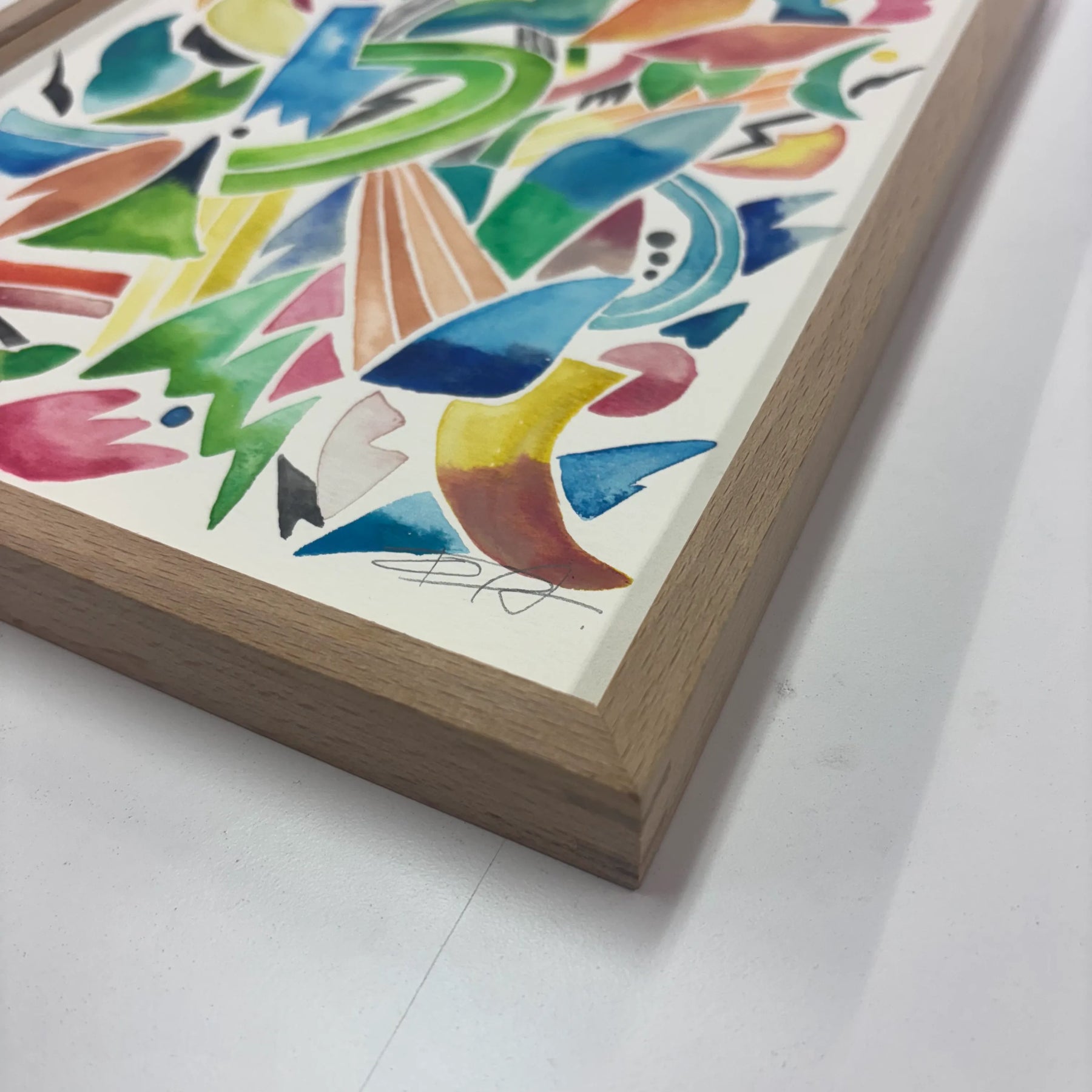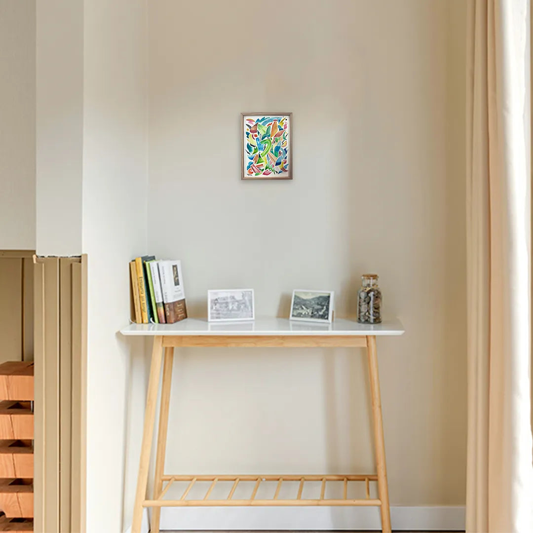 鮮やかな色形が跳ねるように散り、筆致の速さが画面に風を起こします。直線と曲線が交差し、祝祭の断片を拾い集めたような高揚が広がります。壁に掛けると視線が巡り、部屋に軽快な動きが生まれます。リビングや階段の壁面に添えると、木枠や白壁と調和し、日常の時間に弾みを与えます。