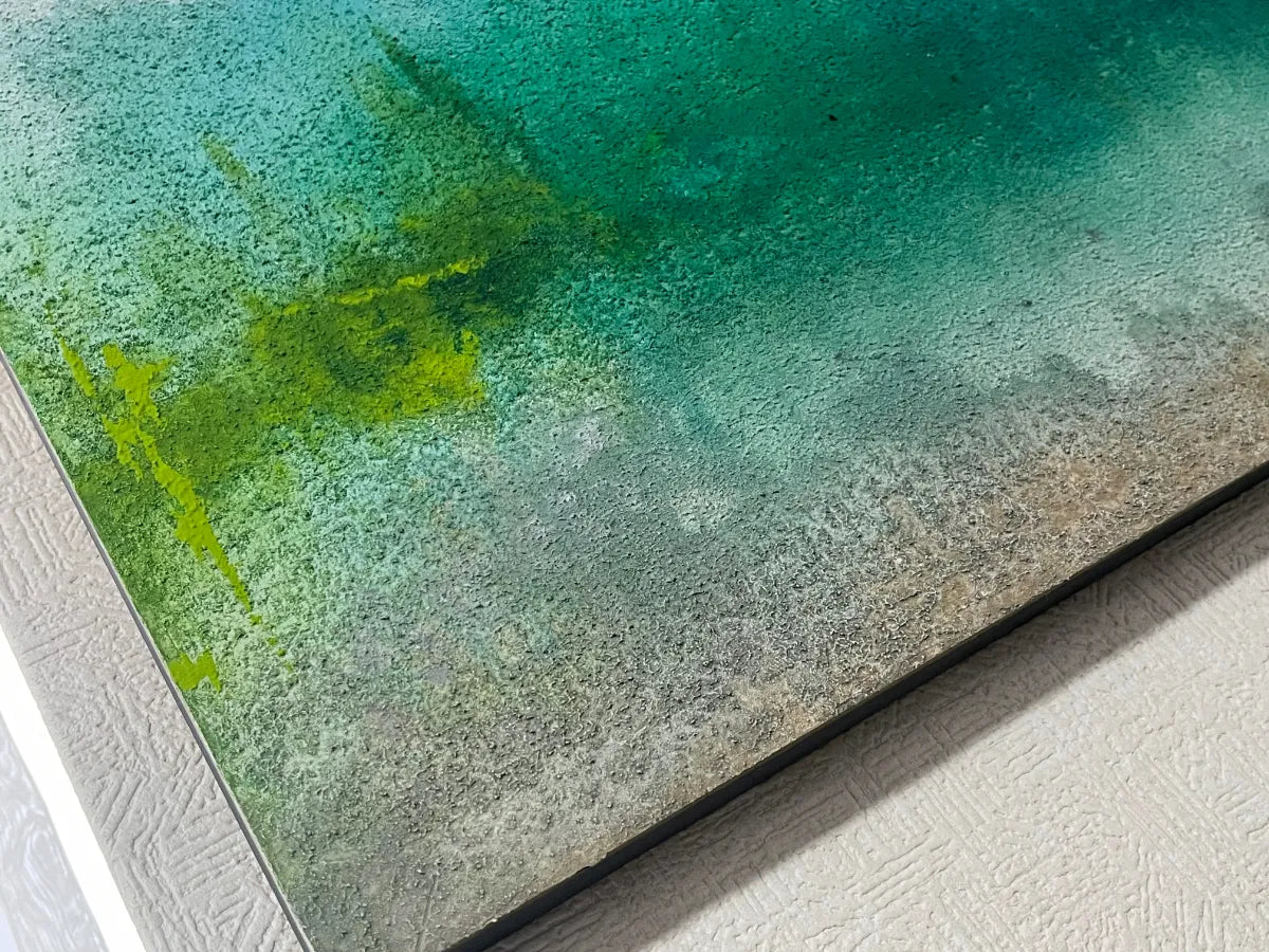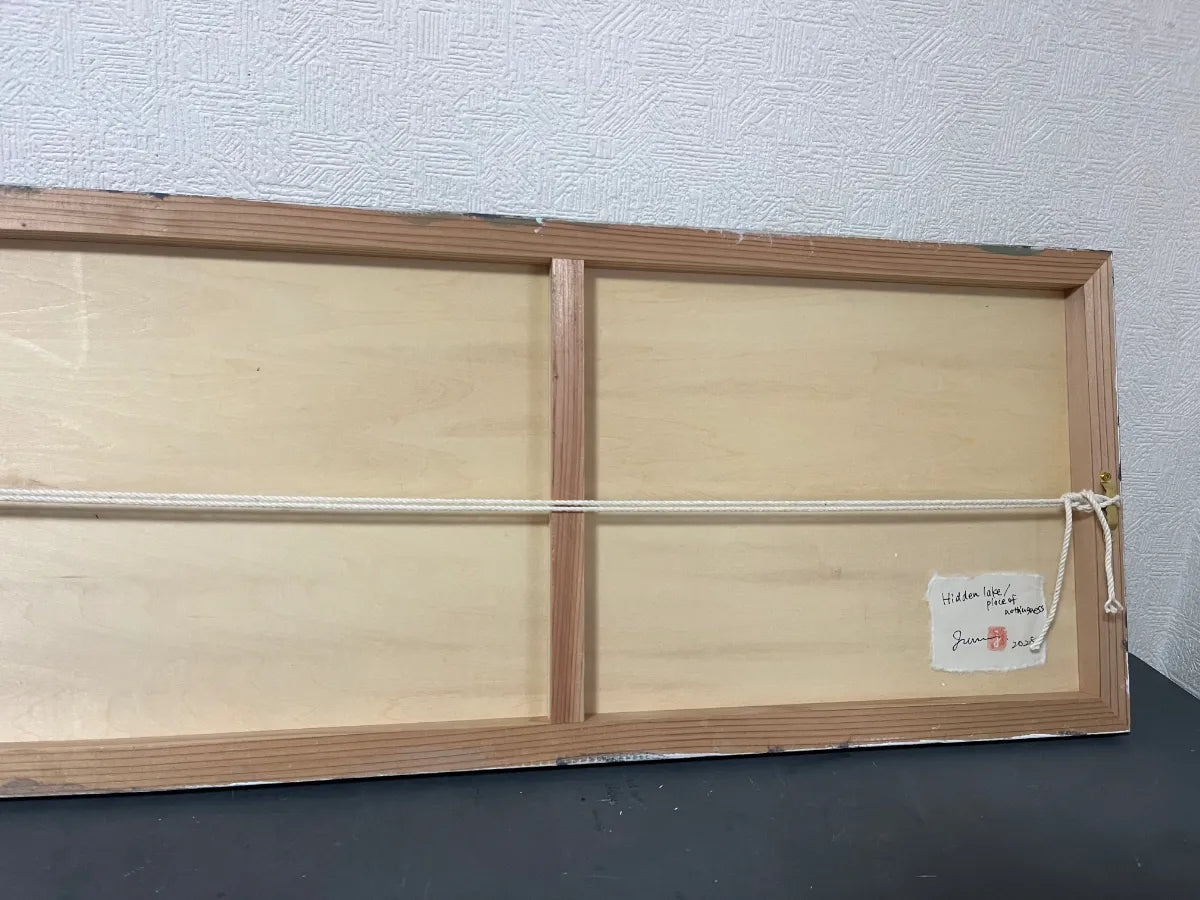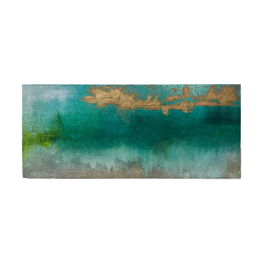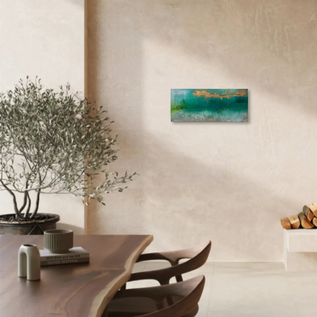 深いエメラルドグリーンの揺らぎに、鈍く光る金色の質感が重なり、静まり返った湖畔や太古の情景を連想させます。滲み出すような色彩のグラデーションは、眺めるほどに意識を深い場所へと誘い、心に潤いをもたらしてくれるでしょう。この作品を一点飾ることで、壁面に幻想的な奥行きが生まれ、日々の喧騒を忘れさせる特別な静寂が部屋に満ちていきます。落ち着いた照明の寝室やリビングの特等席で、真鍮の小物や深い色味の木製家具と美しく調和します。