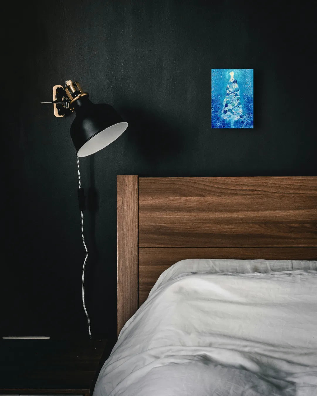 厚く重ねられた青の絵肌の中に、ツリーの輪郭が静かに立ち上がる作品です。ナイフ跡や絵具の凹凸が光を受けて揺らぎ、時間帯や距離によって表情が変化します。装飾的でありながら物語を語りすぎない佇まいは、見る人の記憶や感情を自然と重ね合わせてくれます。空間に飾ることで、静けさの中にほのかな温度と奥行きを生み、季節を問わず心を落ち着かせる存在となる一枚です。