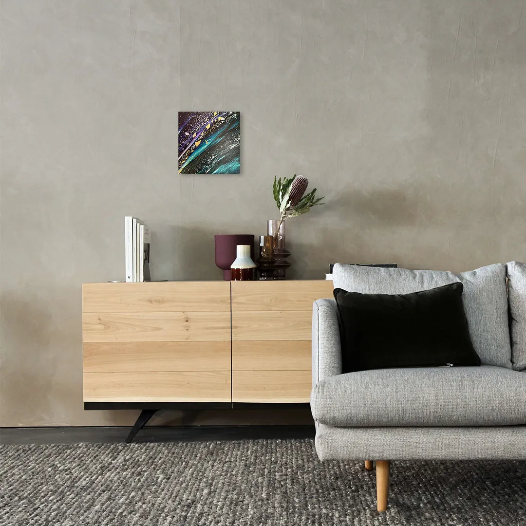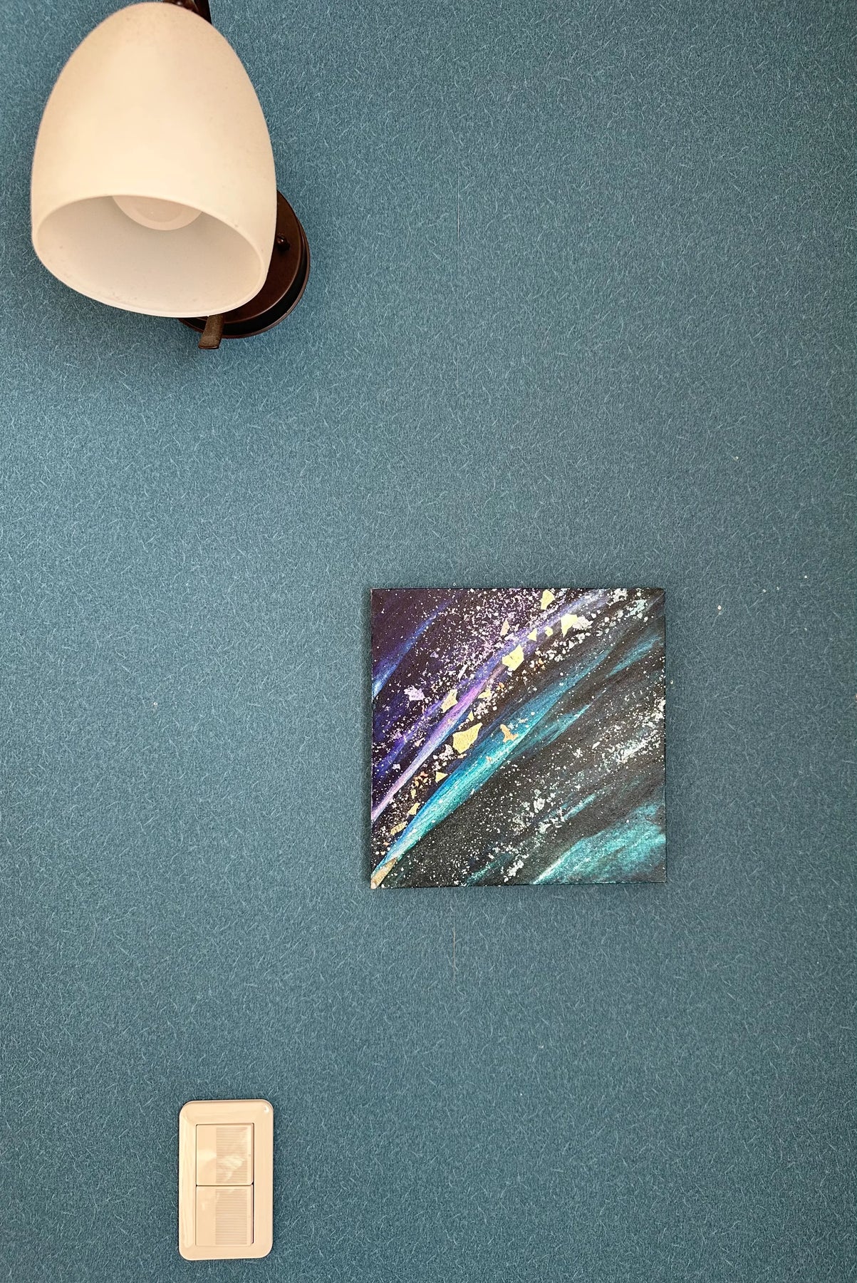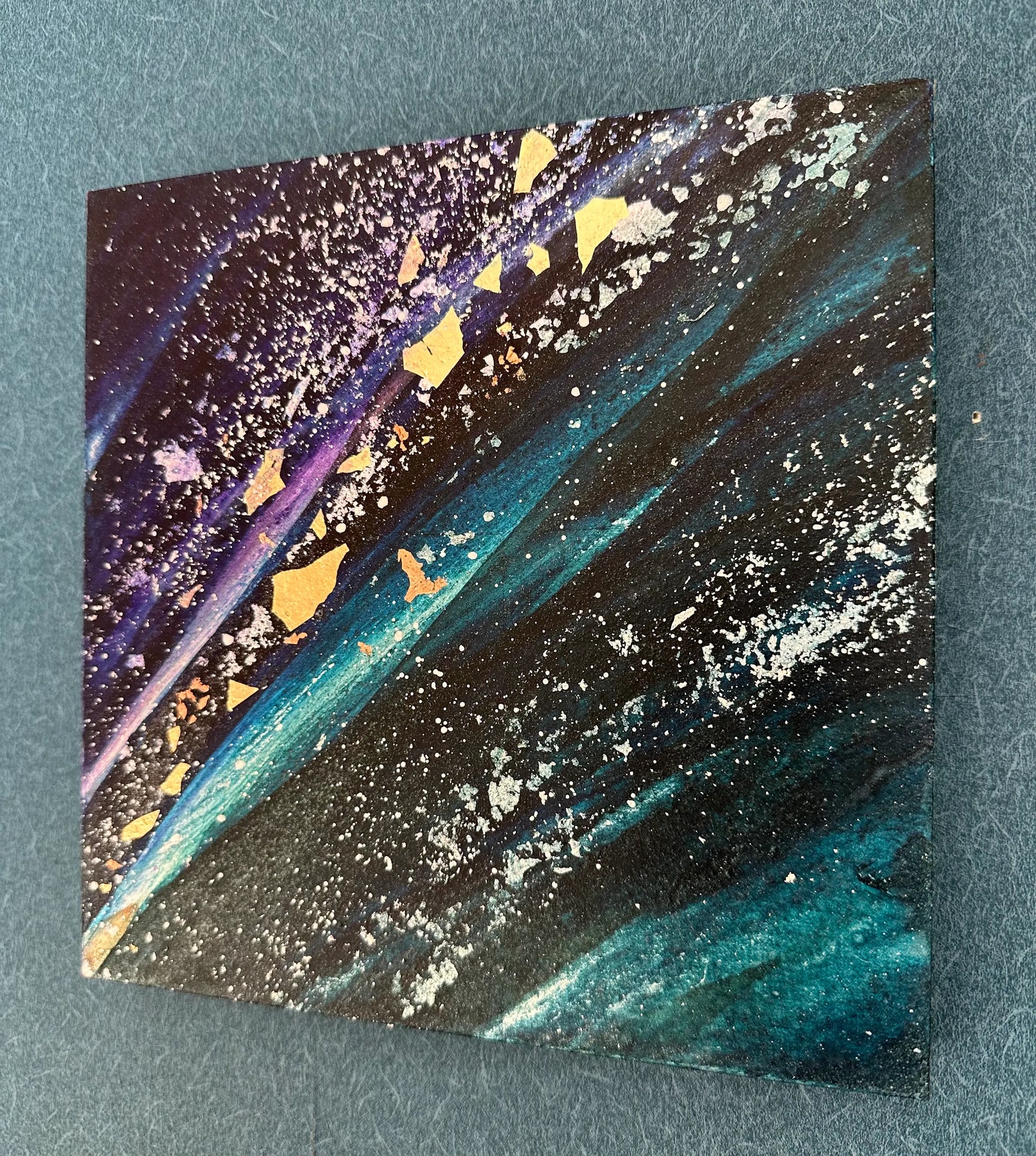 深い藍色と鮮やかな碧が斜めに走り、星屑のような白い粒子と黄金の破片が、果てしない宇宙の広がりを想起させます。激しくも優美な色彩の奔流は、眺めるほどに魂を遠くへ運び、日々の喧騒を忘れさせてくれるでしょう。この神秘的な一作を飾ることで、壁面に奥行きのある輝きが宿り、空間を洗練された知性で刷新します。