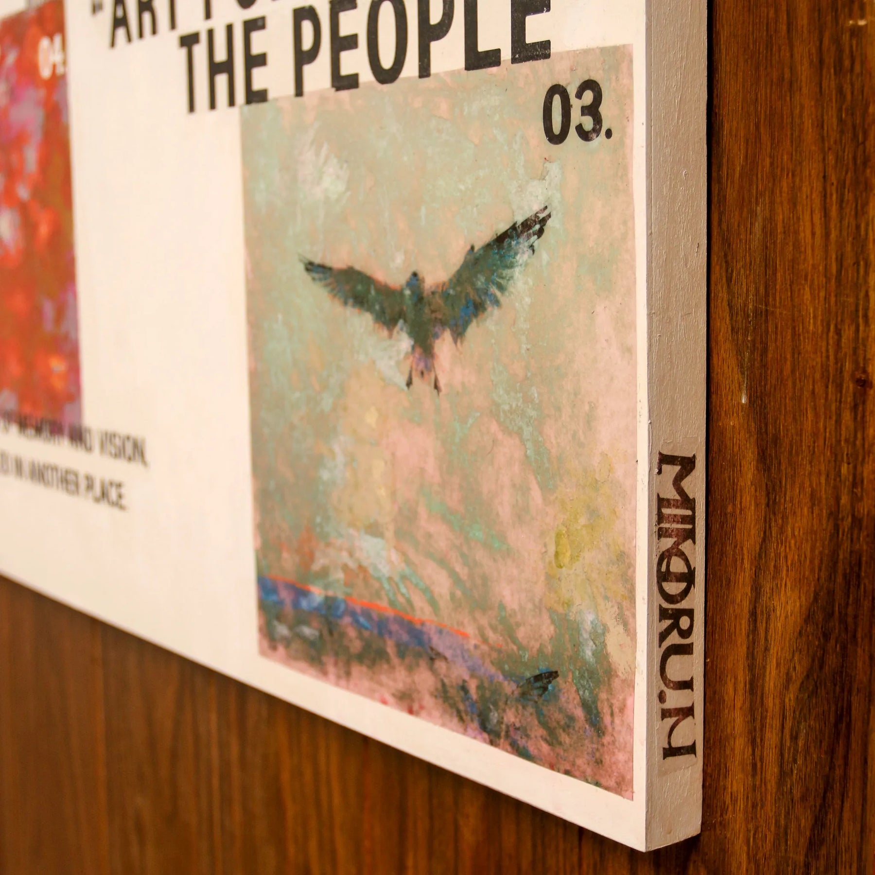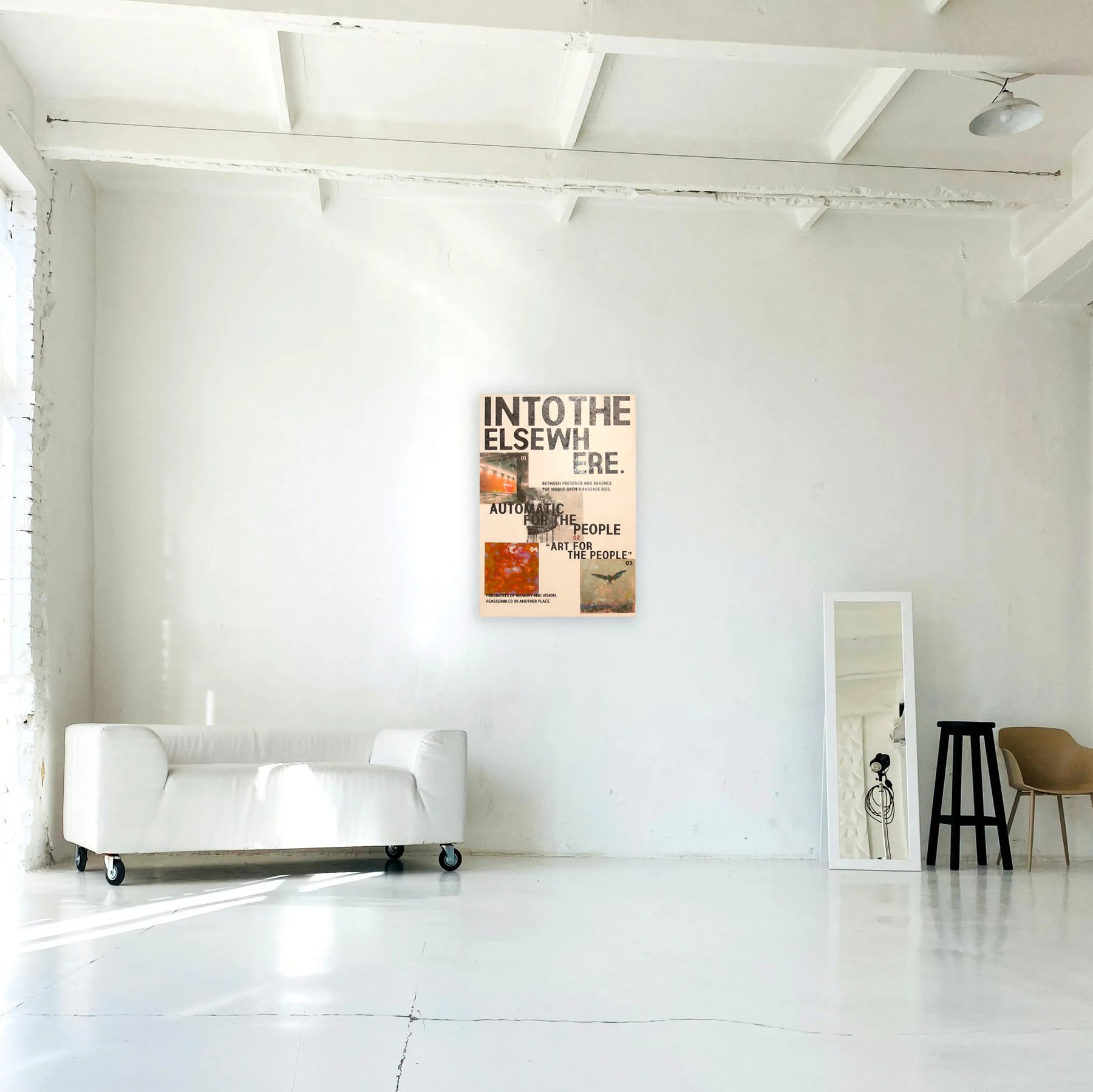 重ねられた文字と断片的なイメージが、記号のように響き合いながら視線を誘います。読むという行為と見るという感覚が交錯し、意味がほどけていく瞬間に新たな風景が立ち上がります。壁に掛けると、空間に静かなリズムと思索の気配が生まれ、日常の中に軽やかな緊張感を添えます。モノトーンのリビングやシンプルな書斎にも自然に溶け込み、知的な印象を漂わせます。