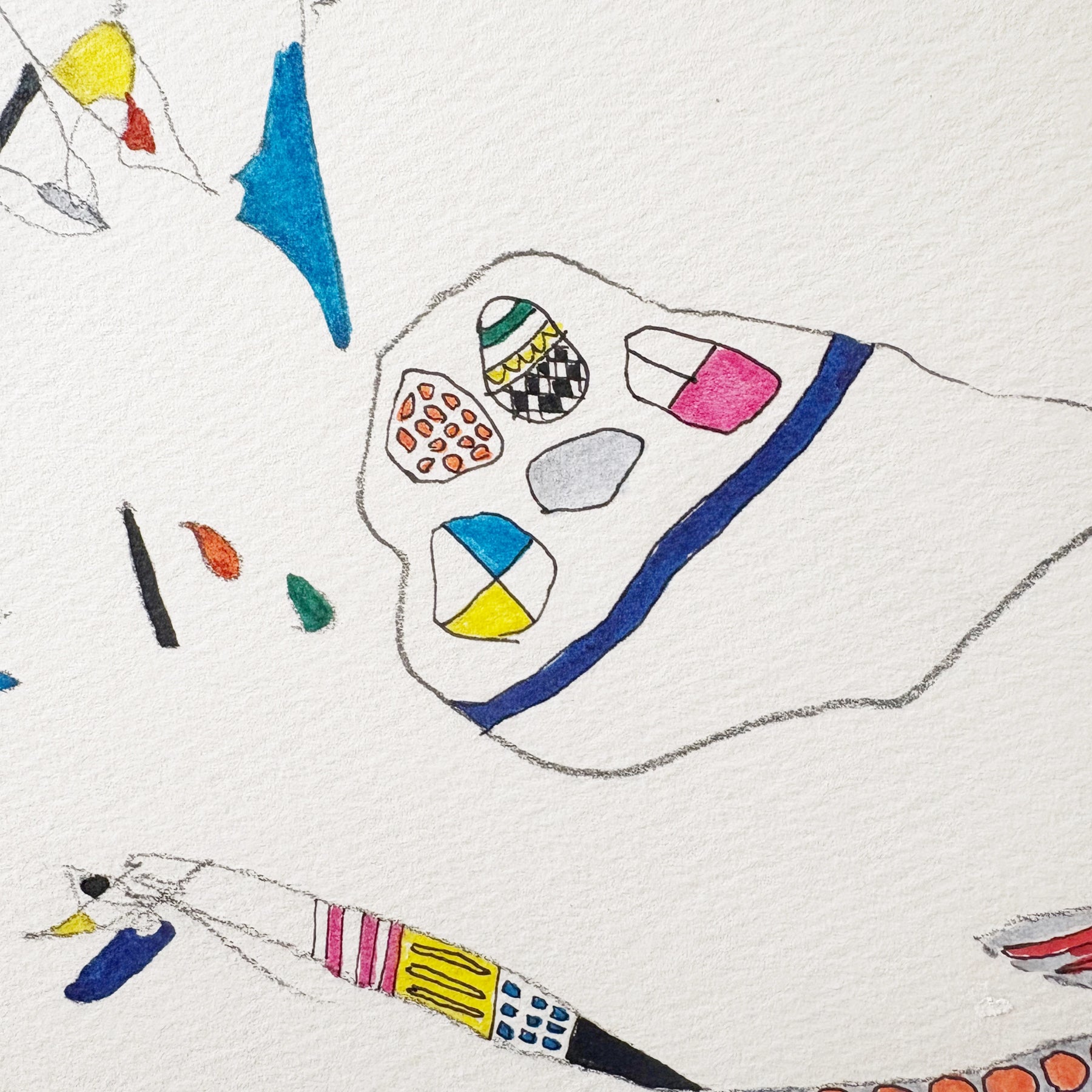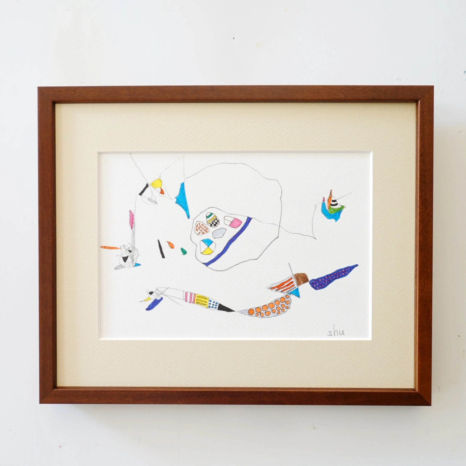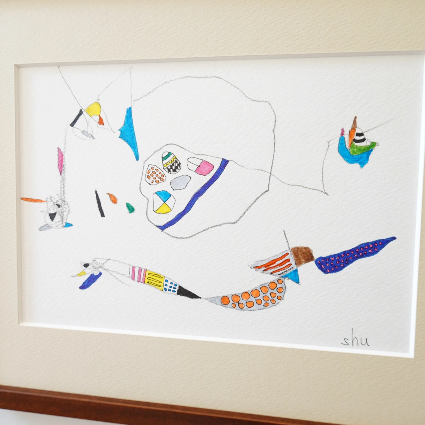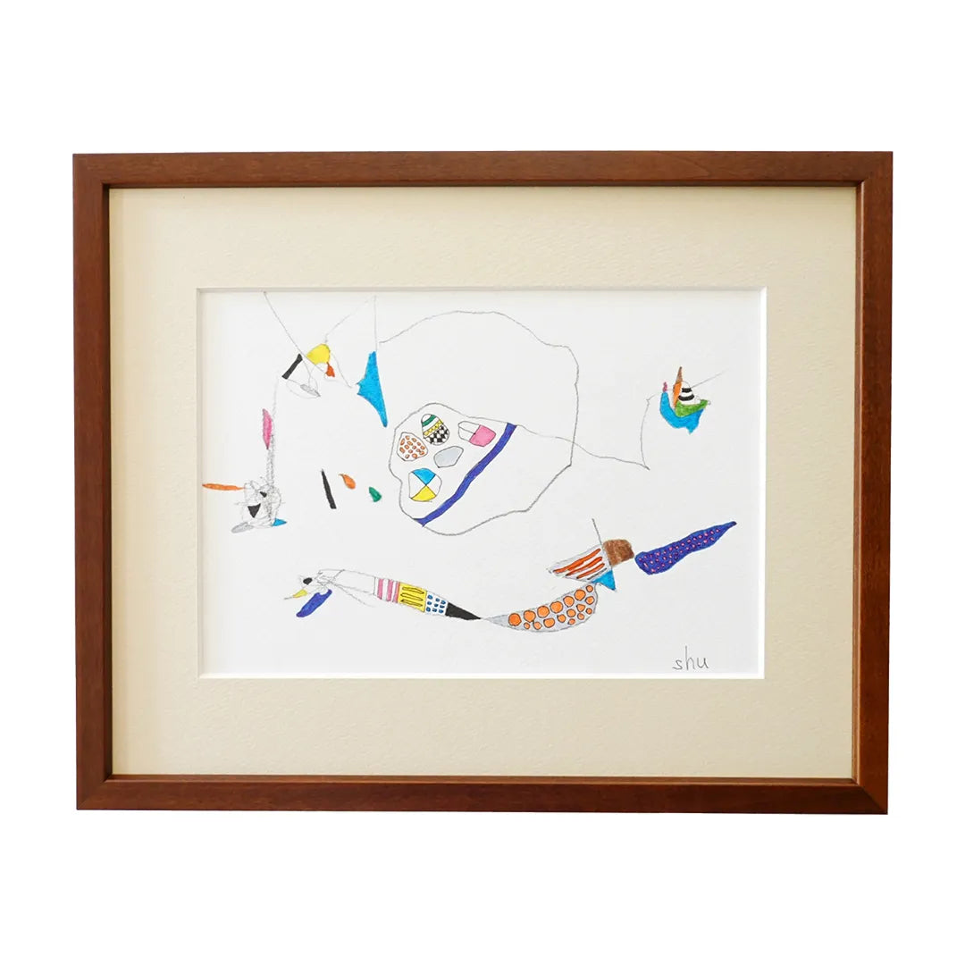絵の中に広がる色と線は、目に映る世界をやわらかく包み込みます。点と線が織りなす調和は、見る人の心に静かな旋律を響かせ、どこか遠くを想像させるようです。飾ることで、空間に軽やかなリズムが生まれ、穏やかな動きをもたらします。書斎やリビングルームに飾ると、落ち着きと共に温かい雰囲気を添えてくれるでしょう。