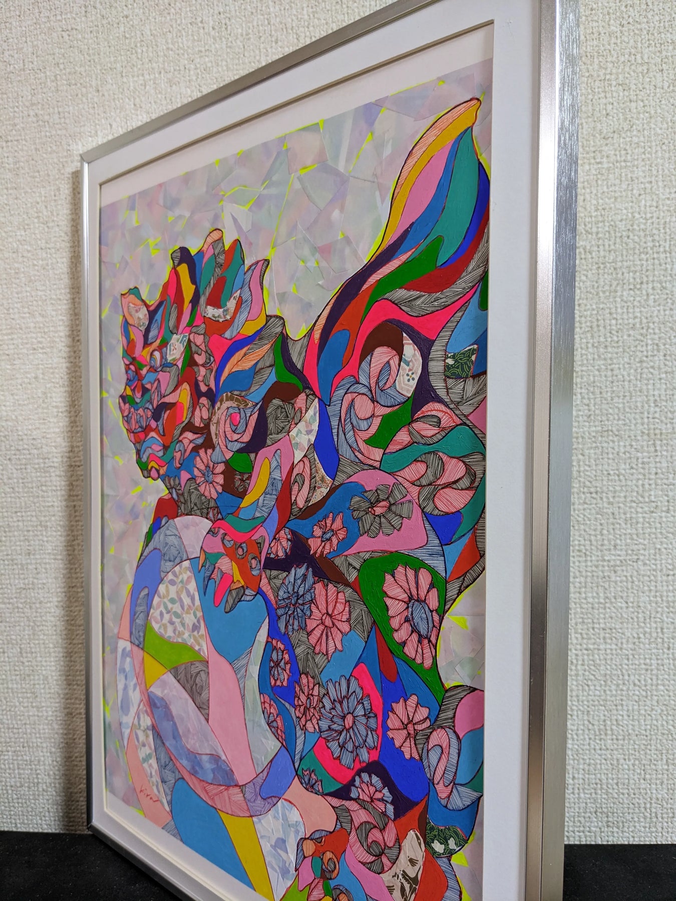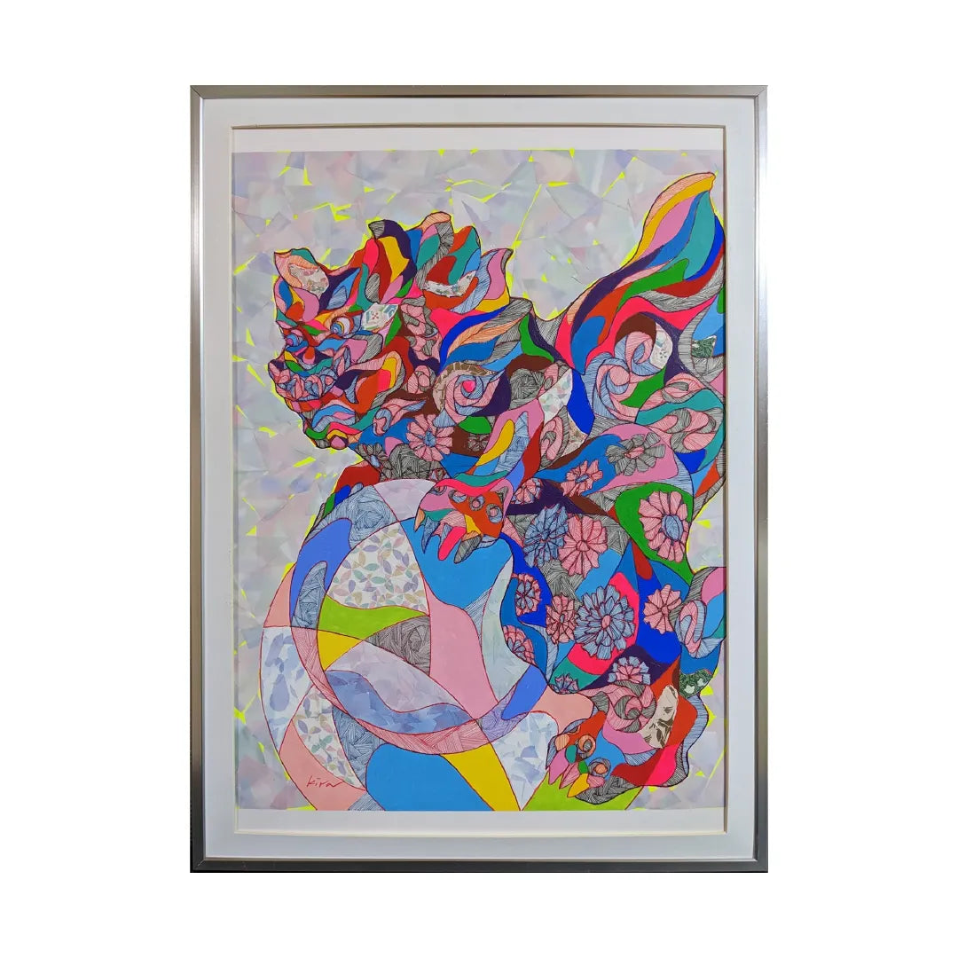 重なり合う鮮やかな色面に花模様が溶け込み、伝統的な獅子像を現代的に再構築したような一枚です。細かな線描と力強い色彩が共存し、静止した姿の中にも流れるような動きを感じさせます。背景の淡いトーンが主役のモチーフを際立たせ、空間全体に華やかで凛とした空気を広げてくれます。和洋どちらのインテリアにも相性が良く、飾るだけで空間の印象を大きく変えてくれる存在感ある作品です。