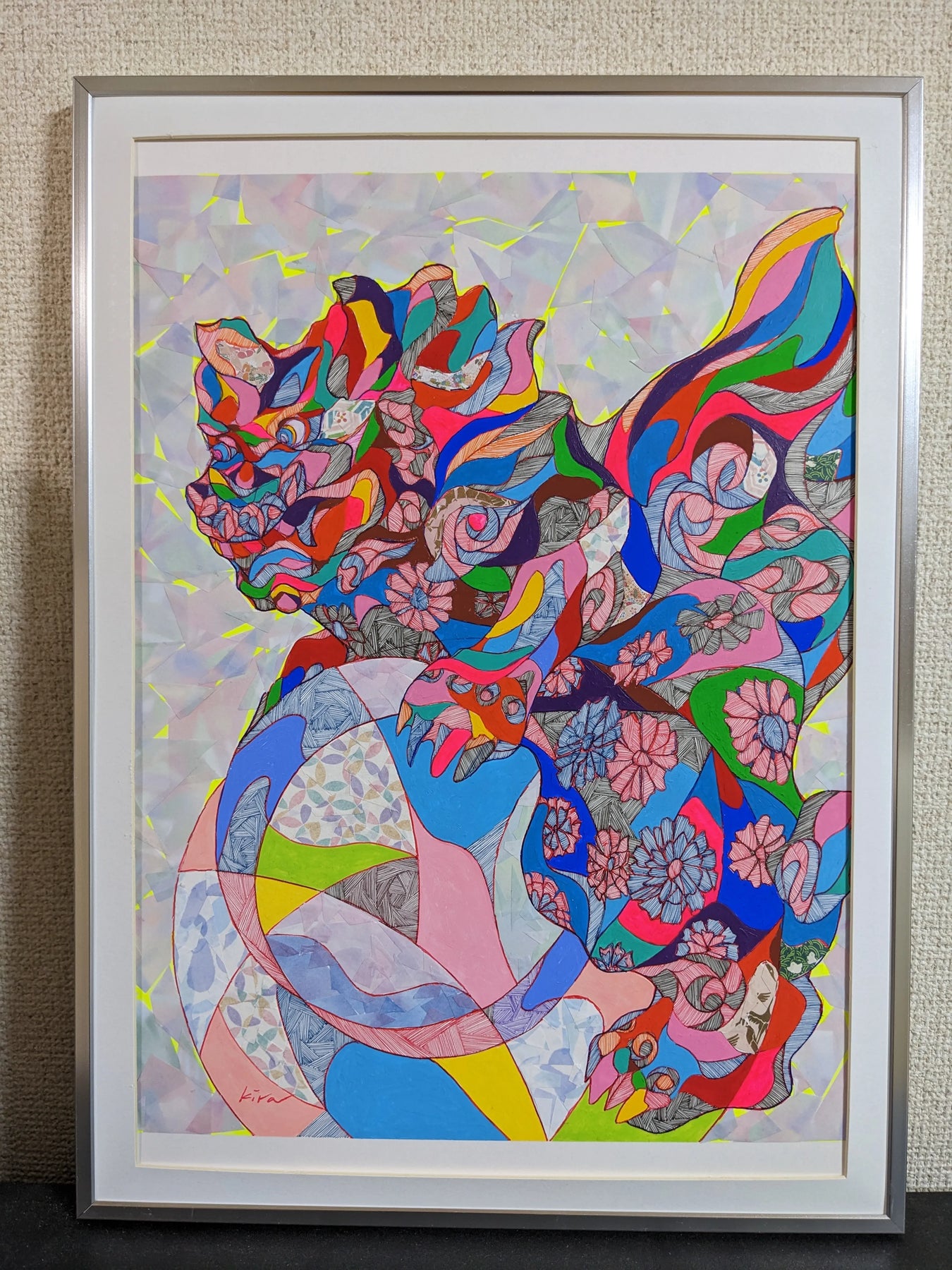 カラフルに描いた「狛犬」は、日本の伝統をアート的に表現した作品です。この狛犬は、多彩な色使いで見る人に親しみと温かさを感じさせ、空間を明るく彩ることと想います。 ボールペン、コラージュで立体感を演出し、アクリルで表情を引き出しています。 アルミ製の額も付いていますので、そのまま部屋に飾ることができます。透明性の高いアクリル板とマット付きです。 絵のサイズはA3で、オリジナル原画の1点ものです