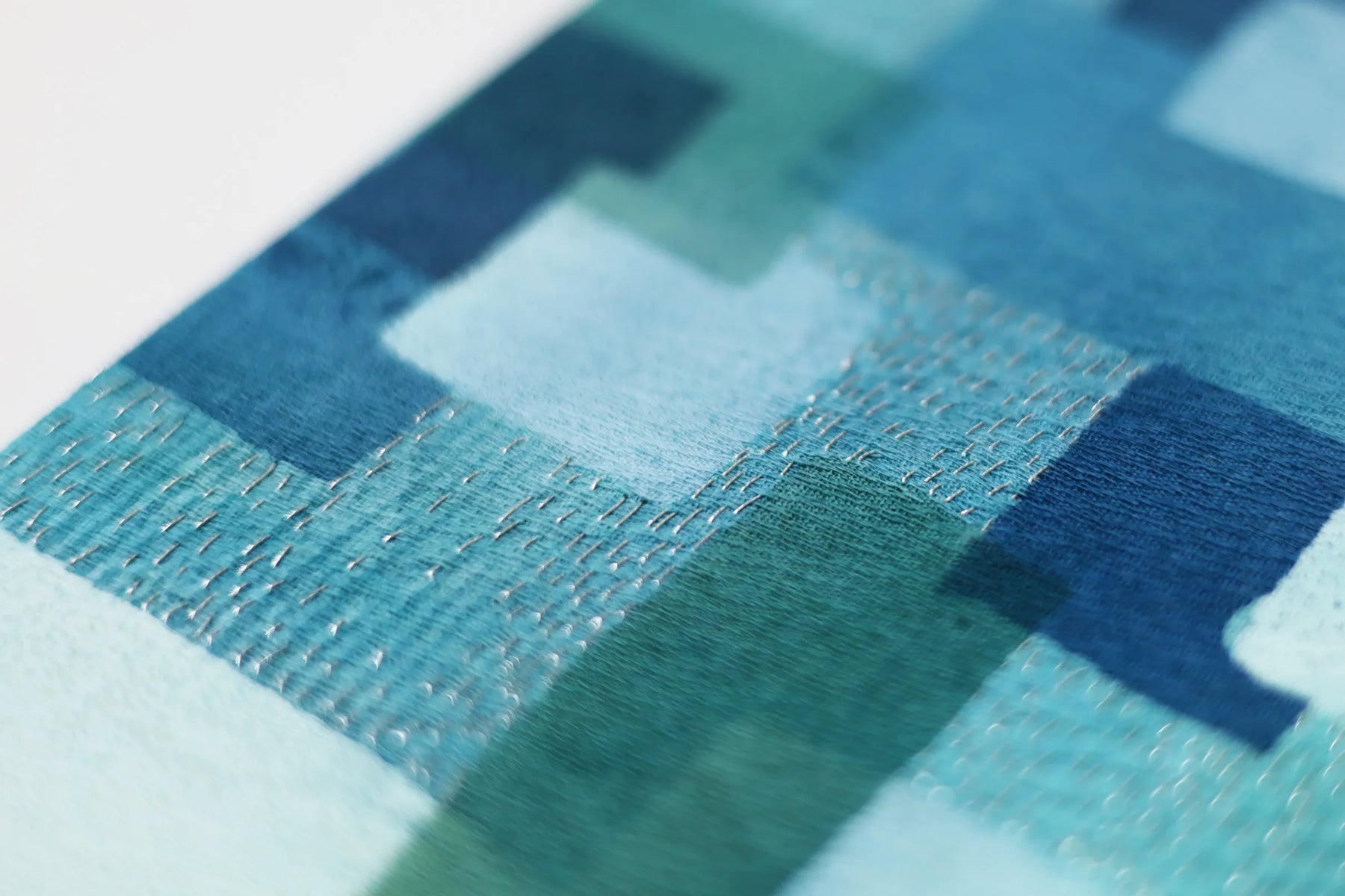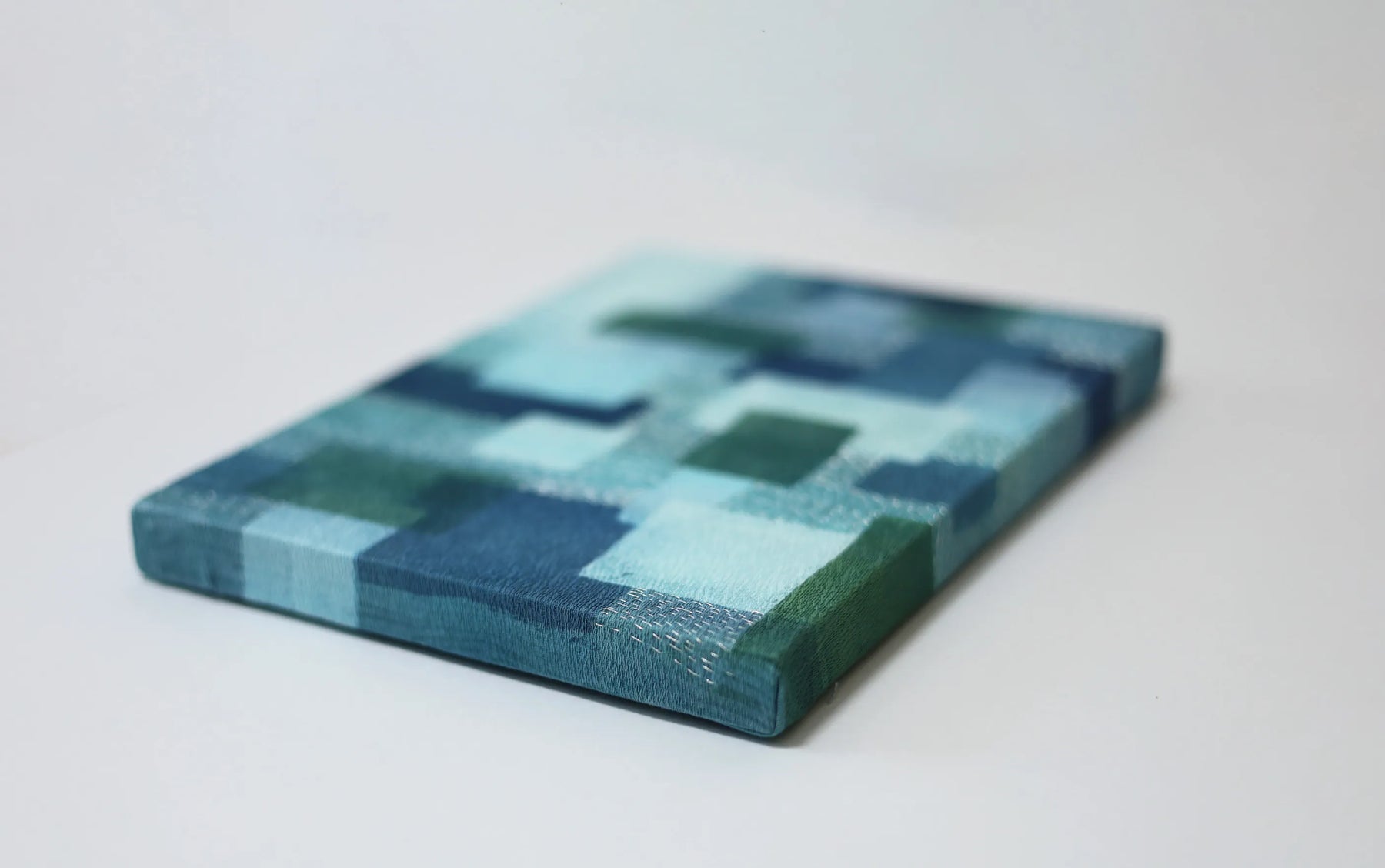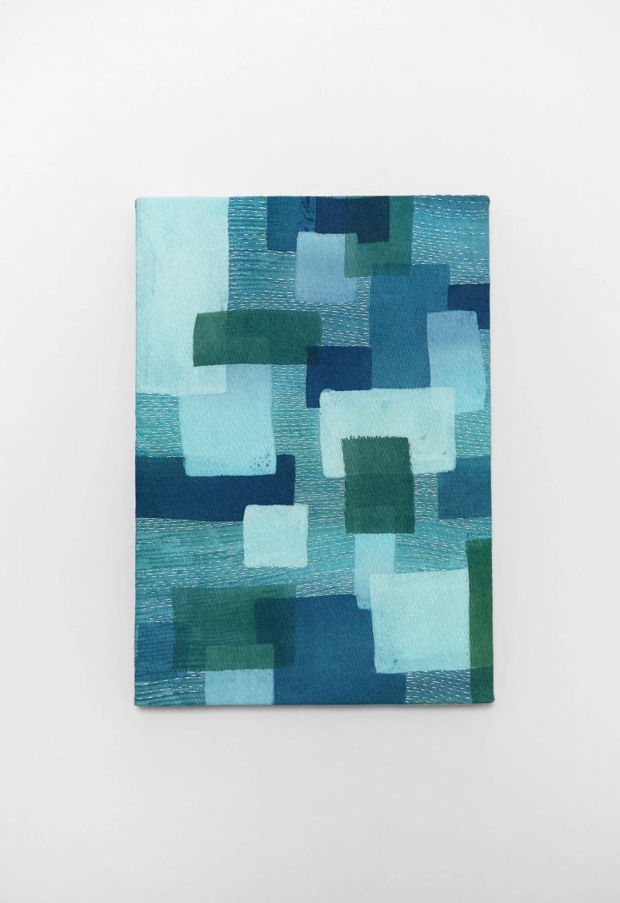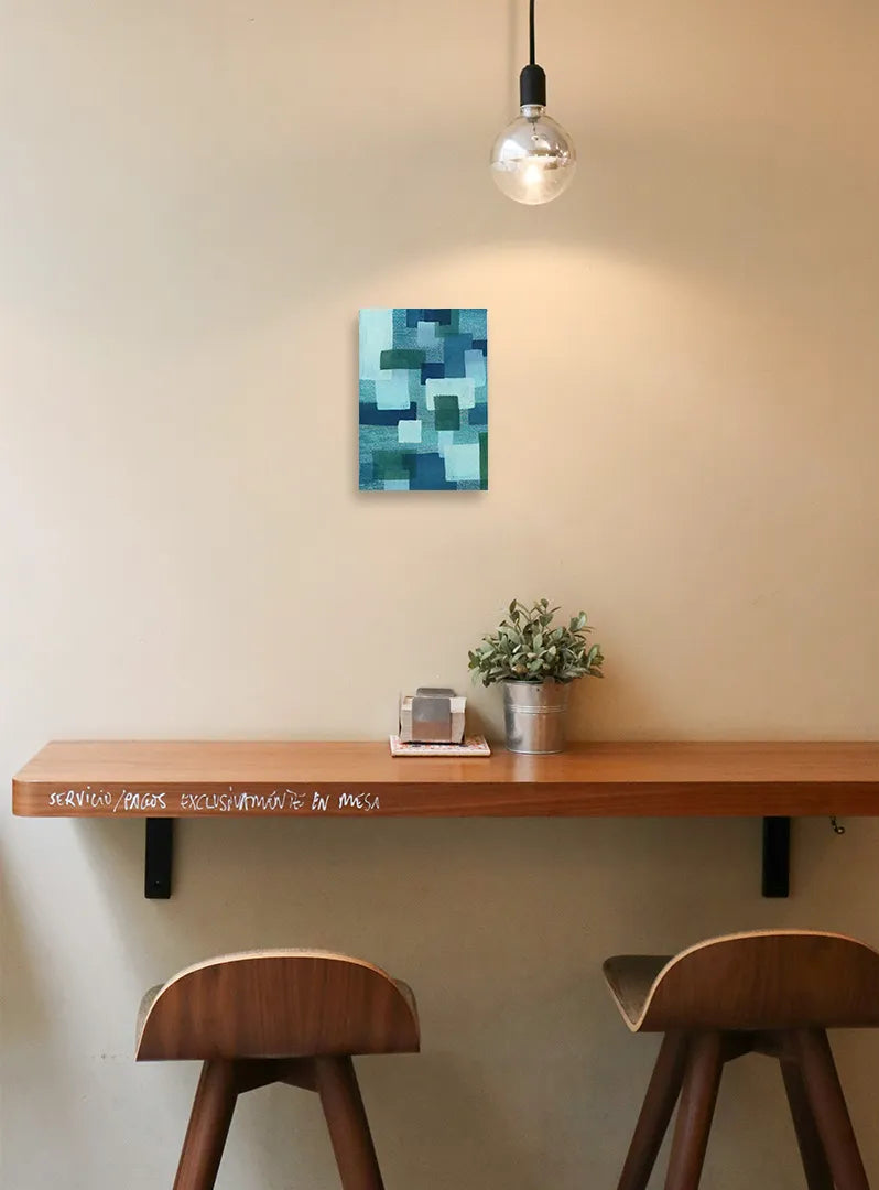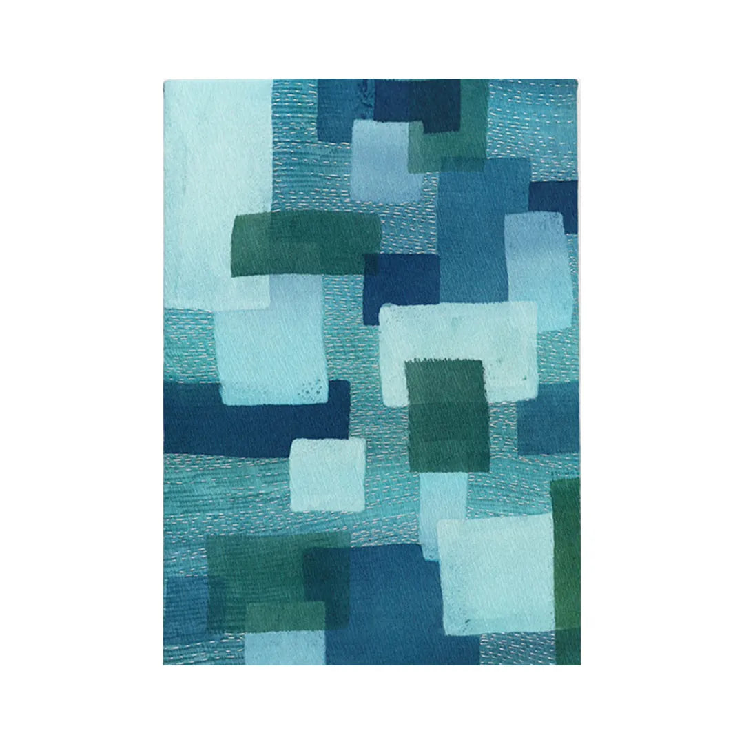 さまざまな青が重なり、静かに揺れる水面のような広がりを感じます。透明な光が差し込むたびに、奥行きがゆるやかに変化し、見る人の心に穏やかな波紋を描きます。壁に掛けると、空間に清涼な気配が流れ、時間が少し緩むようです。窓辺や書斎、北欧調の木の家具とともに置くと、落ち着きと清潔感がやわらかく調和します。