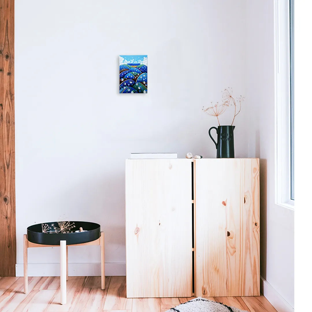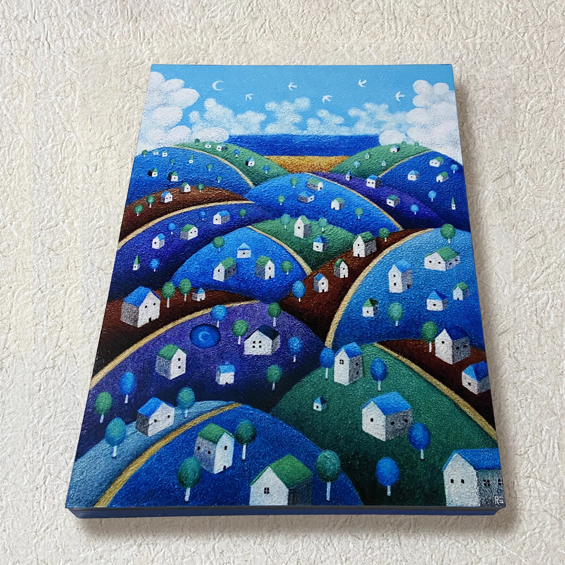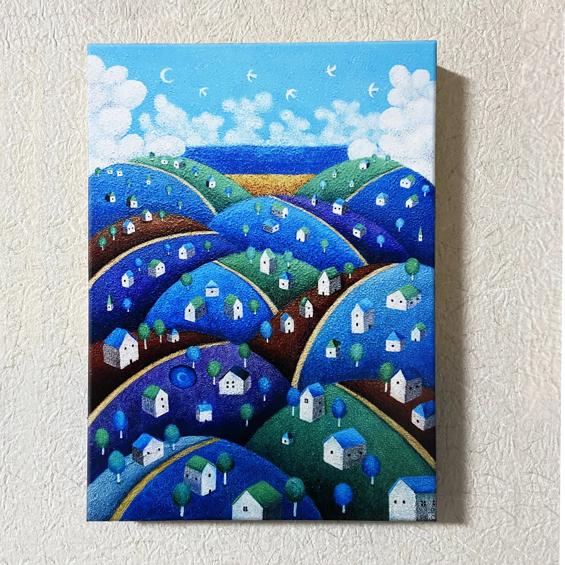 波打つ青い丘に小さな家々が寄り添い、空には白い鳥と三日月が浮かぶ、まるでおとぎ話のワンシーンのような情景です。深い紺色と鮮やかな緑の色彩が、見る人の心に深い安らぎと豊かな物語を届けてくれるでしょう。お部屋に飾ることで、壁面に幻想的な窓が生まれたかのように、日々の暮らしへ穏やかな安らぎをもたらします。寝室やリビングのソファ横に添えれば、北欧風のインテリアとも心地よく響き合います。