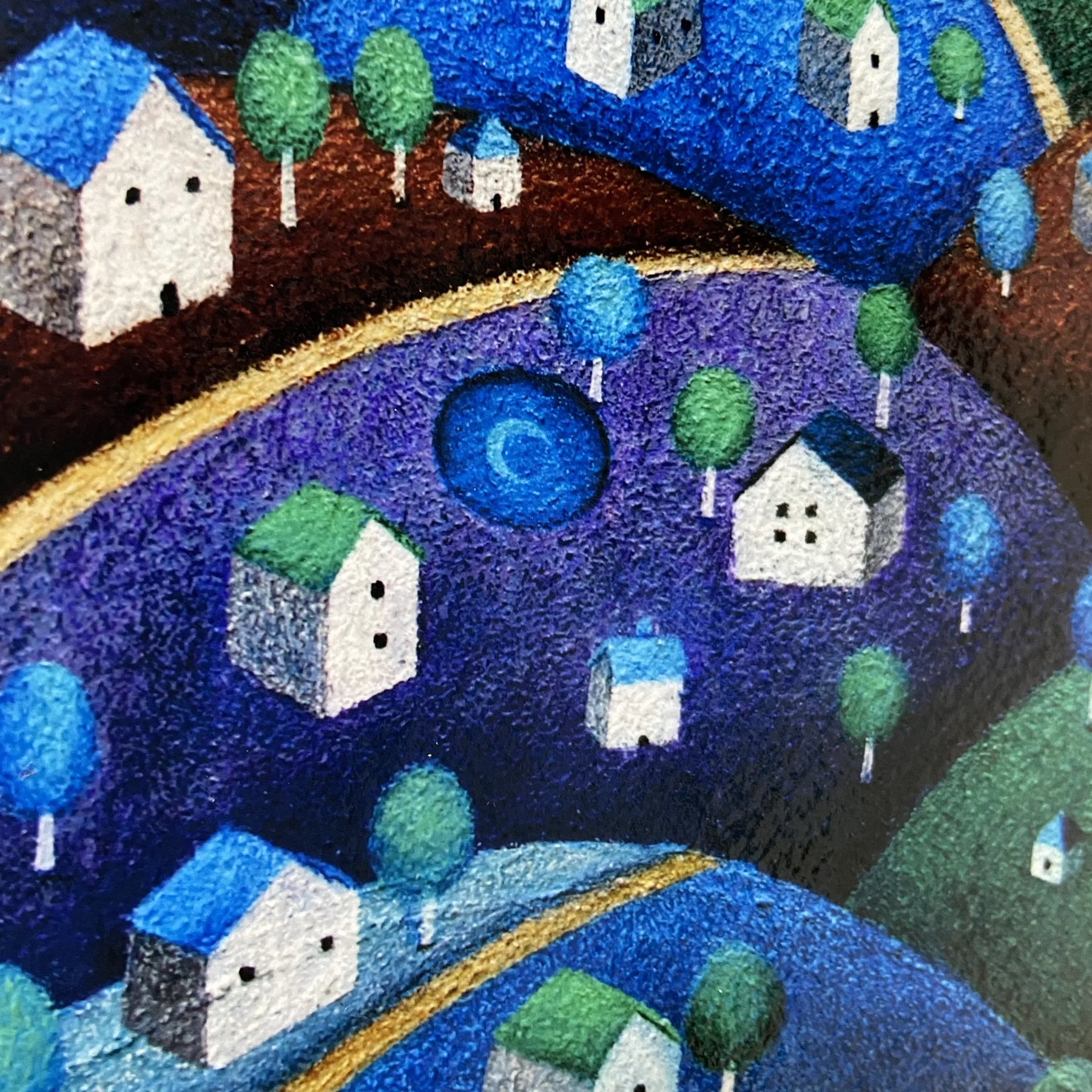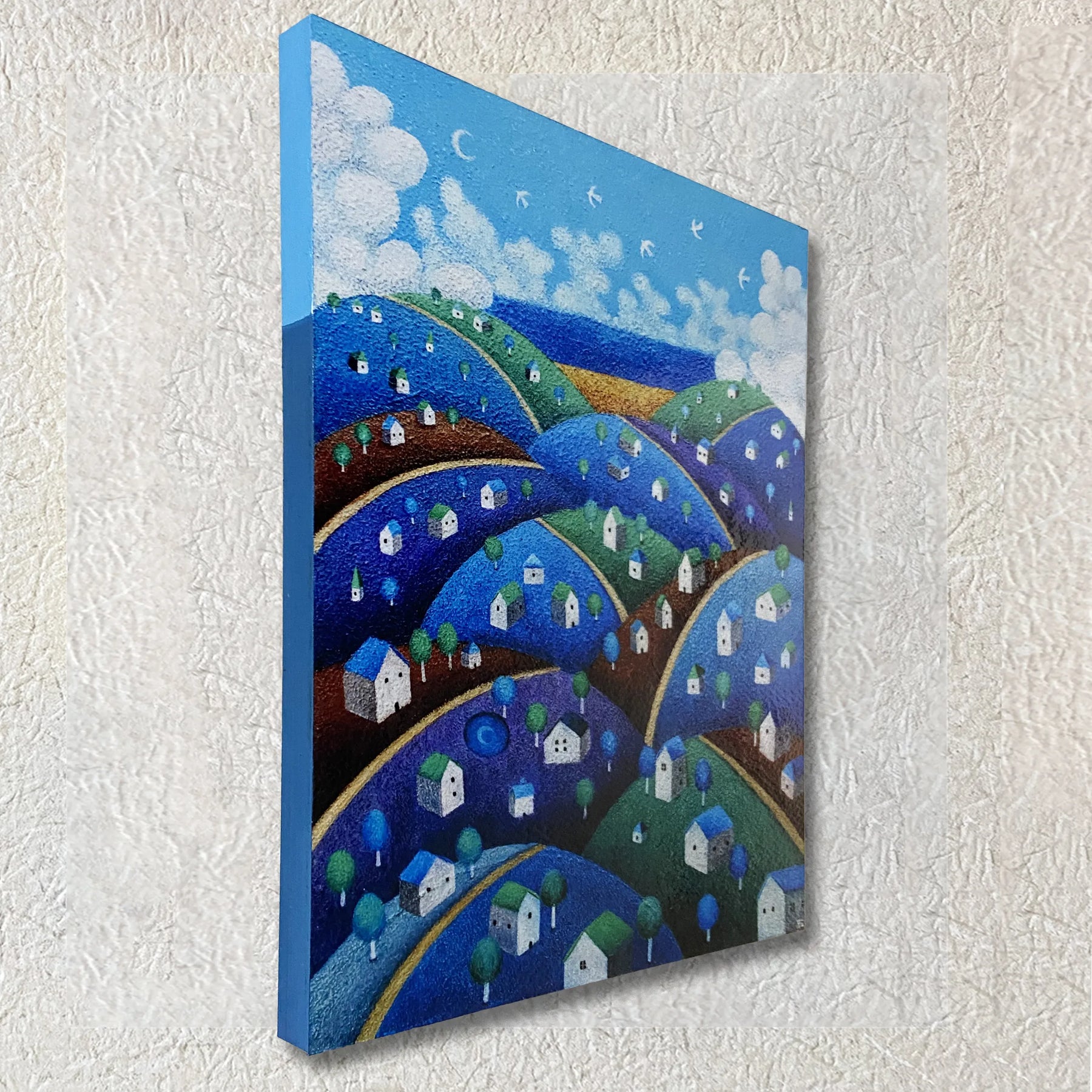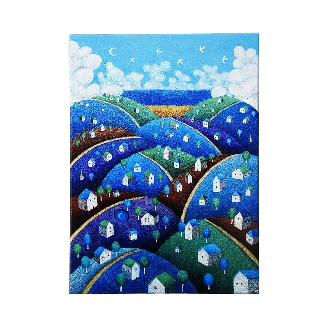 波打つ青い丘に小さな家々が寄り添い、空には白い鳥と三日月が浮かぶ、まるでおとぎ話のワンシーンのような情景です。深い紺色と鮮やかな緑の色彩が、見る人の心に深い安らぎと豊かな物語を届けてくれるでしょう。お部屋に飾ることで、壁面に幻想的な窓が生まれたかのように、日々の暮らしへ穏やかな安らぎをもたらします。寝室やリビングのソファ横に添えれば、北欧風のインテリアとも心地よく響き合います。