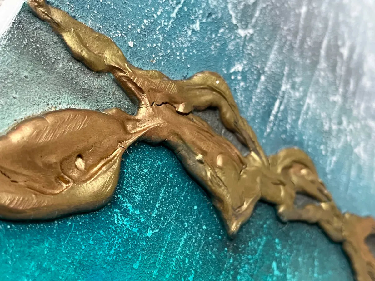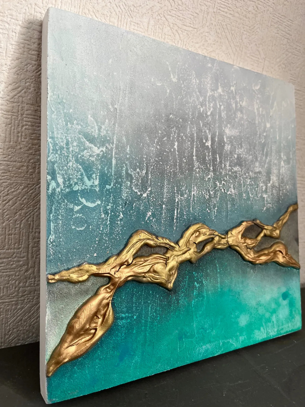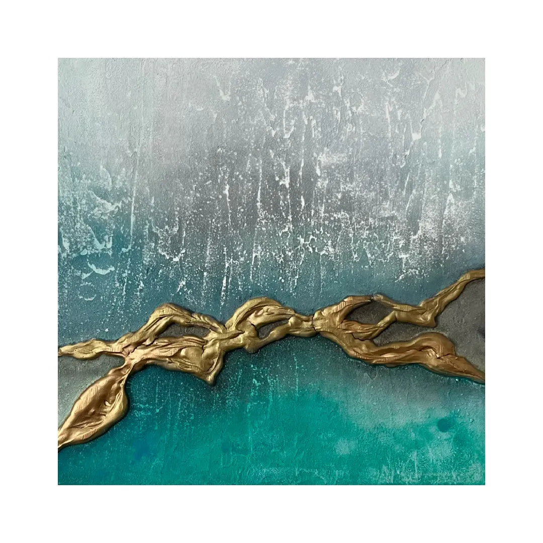 深い青緑の層を横切るように、金色のラインが有機的に連なった作品です。荒々しさと静けさが同時に漂う画面は、自然の地層や水面の境界を思わせ、時間の積層を感じさせます。盛り上がった金の質感は光を受けて陰影を生み、見る角度や距離によって印象が変化します。空間に飾ることで、壁に奥行きと緊張感のあるアクセントを与え、落ち着いた中にも強い存在感をもたらす一枚です。