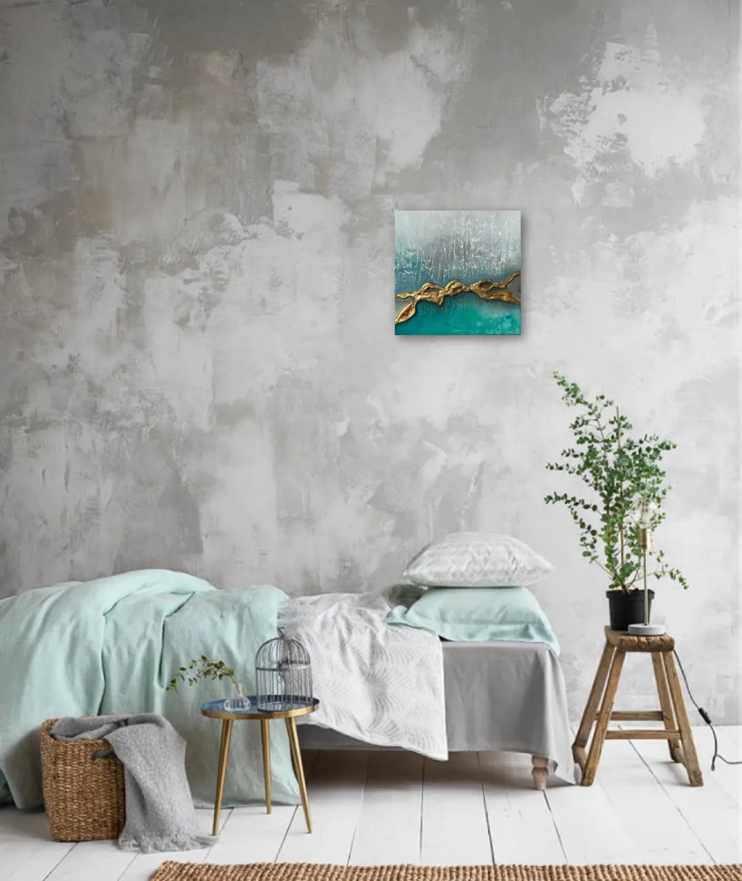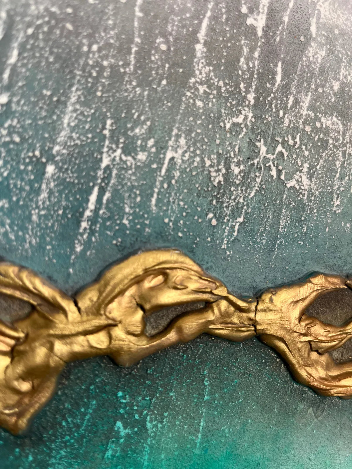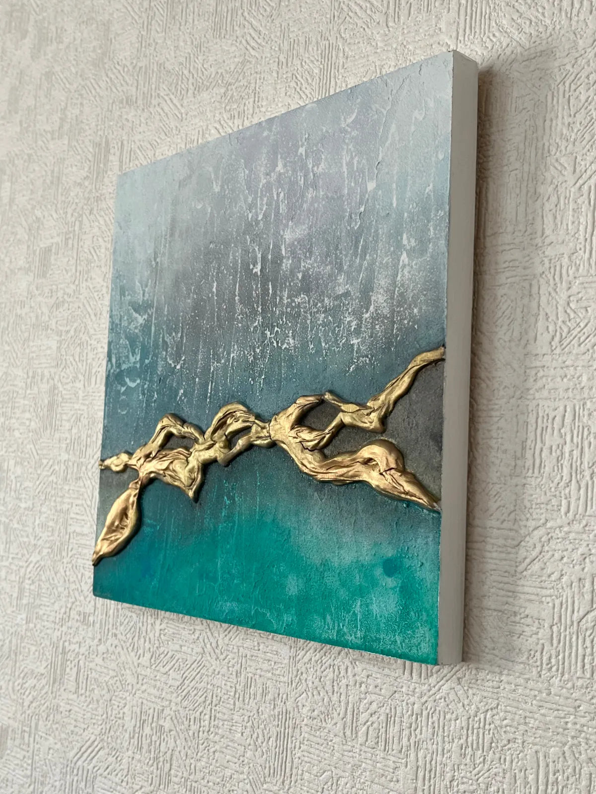 深い青緑の層を横切るように、金色のラインが有機的に連なった作品です。荒々しさと静けさが同時に漂う画面は、自然の地層や水面の境界を思わせ、時間の積層を感じさせます。盛り上がった金の質感は光を受けて陰影を生み、見る角度や距離によって印象が変化します。空間に飾ることで、壁に奥行きと緊張感のあるアクセントを与え、落ち着いた中にも強い存在感をもたらす一枚です。