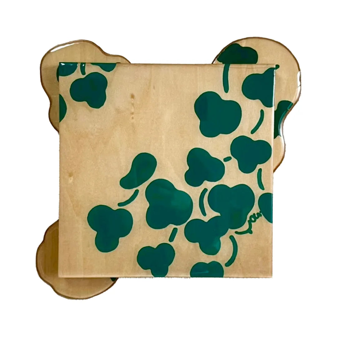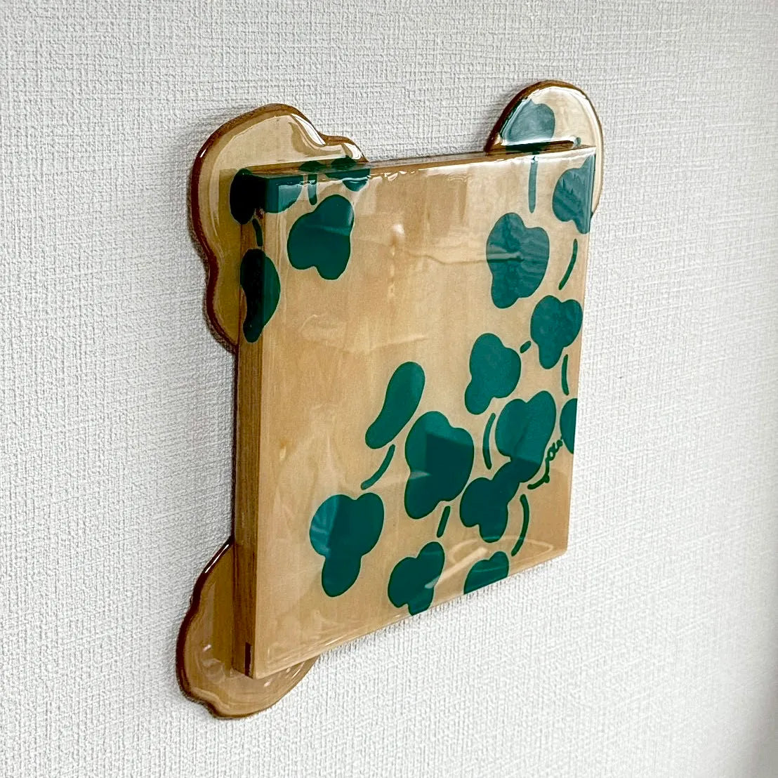 素地のぬくもりに、深い緑のかたちがゆるやかに広がり、軽やかな動きを感じさせます。眺めるほどに呼吸が整うような穏やかさです。飾ることで壁面にほどよいリズムが生まれ、空気がやわらぎます。リビングや玄関に置けば、ナチュラルな家具や布の質感とも自然に溶け込みます。