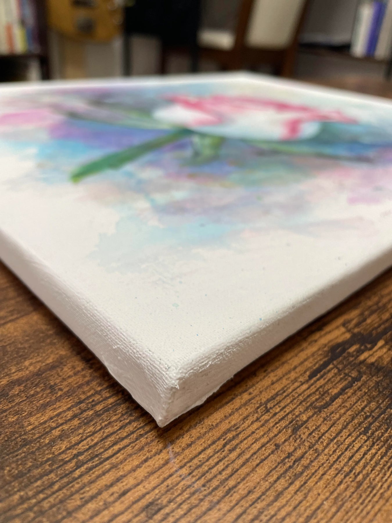 柔らかな紅が花びらにほどけ、滲む色彩が静かに揺れるようで、そっと耳を澄ませたくなる余韻が漂います。壁に掛けるだけで室内の空気がふわりと軽く変わり、書斎やベッドサイドにも自然と溶け込んで木目調の家具と心地よい調和を生みます。