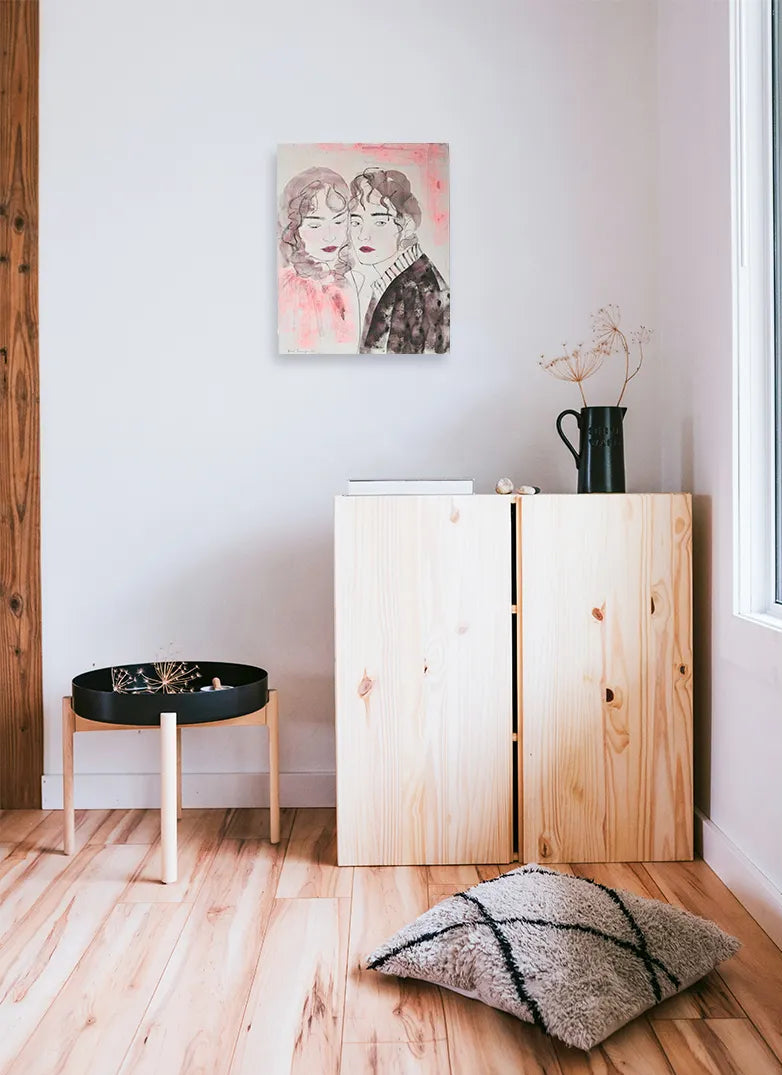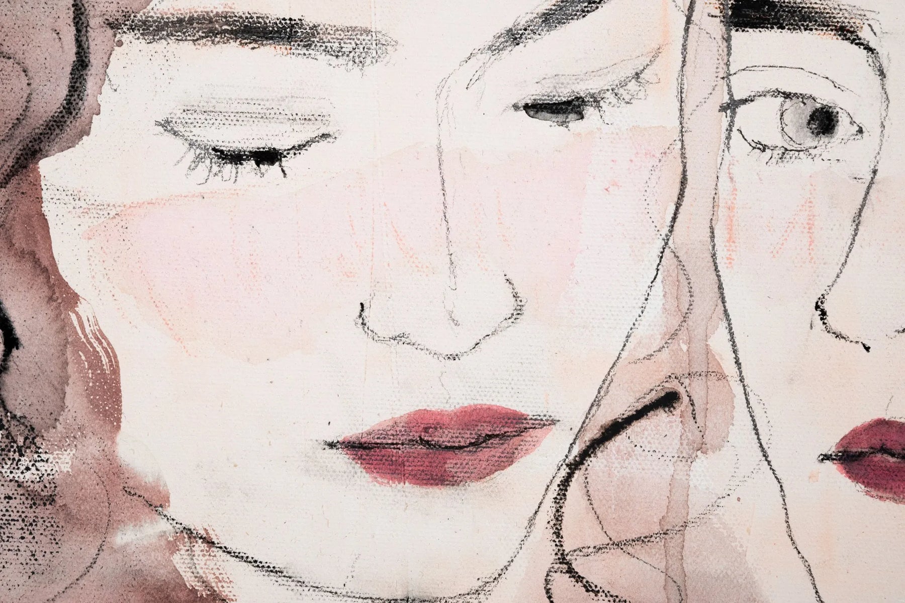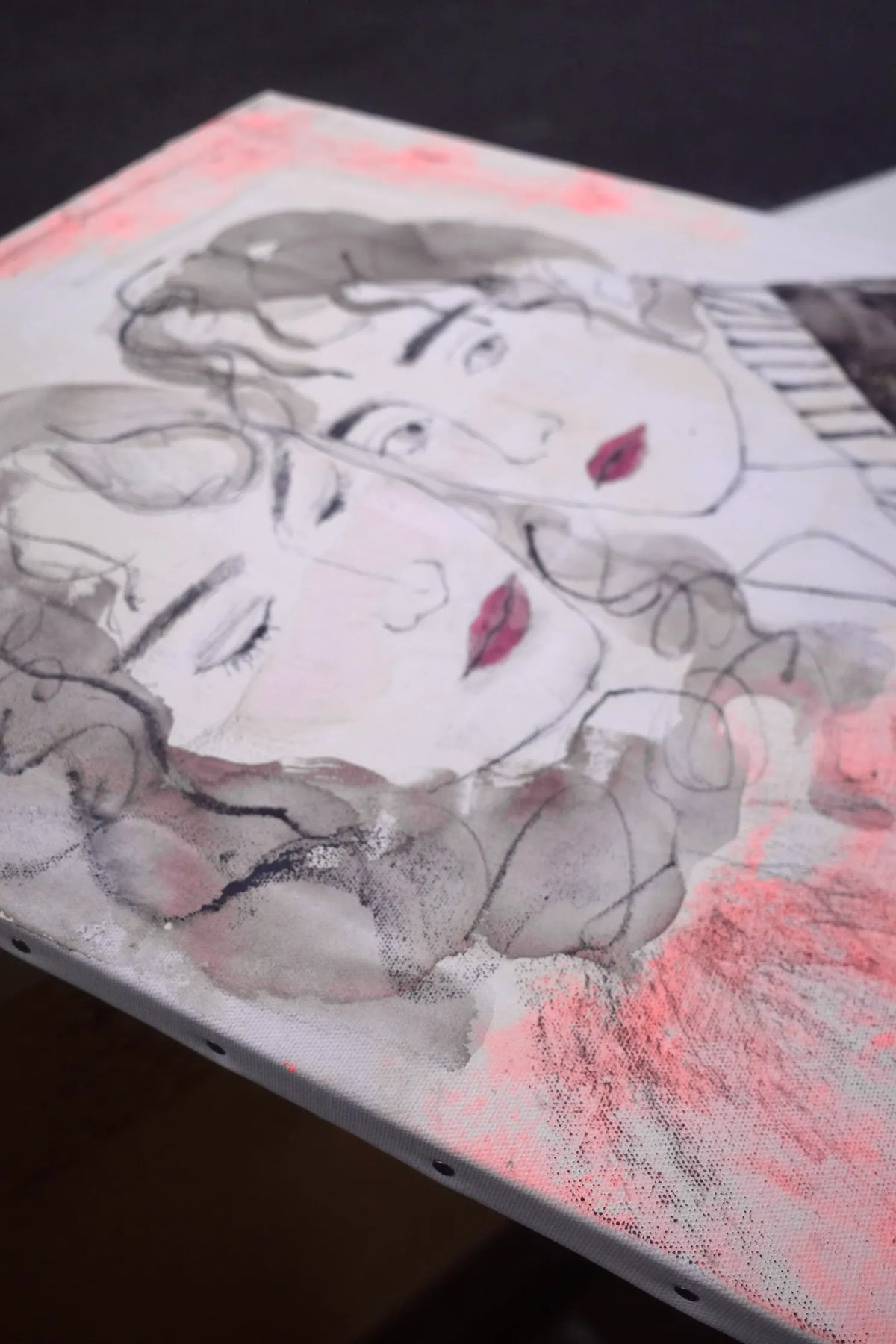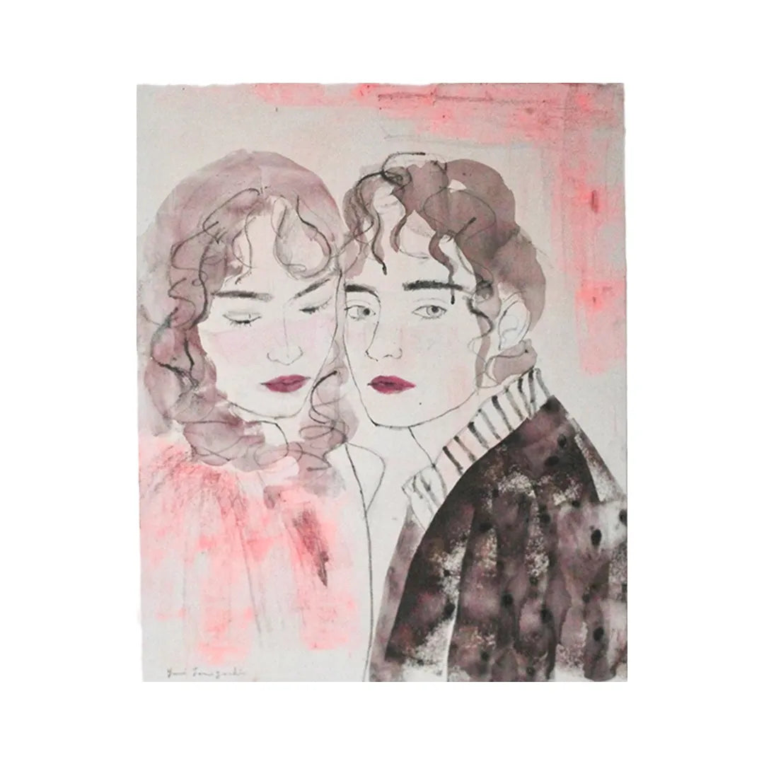 重なるように描かれた二人の表情が、言葉にならない距離感を伝えてきます。にじむ赤と線の揺らぎが、感情の残り香のように画面に漂い、視線を合わせない姿に静かな緊張が宿ります。飾ることで壁面に人の気配が生まれ、空間が少し内省的な表情へと変わります。書斎や廊下に置くと、モノトーンの家具やラフな素材とも響き合い、印象深いアクセントになります。