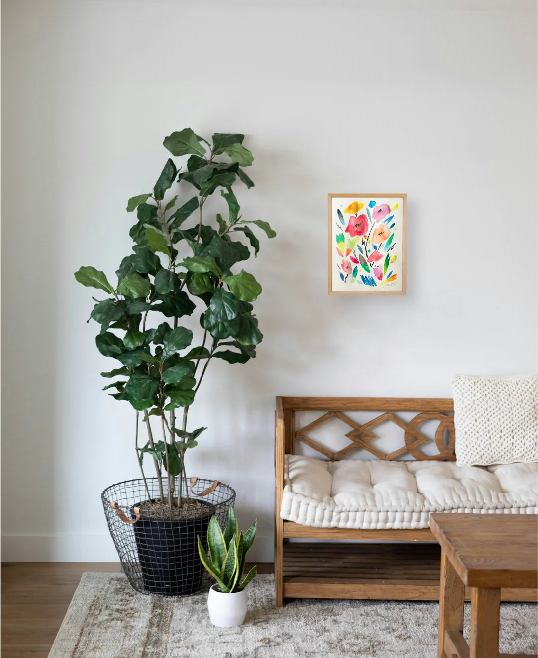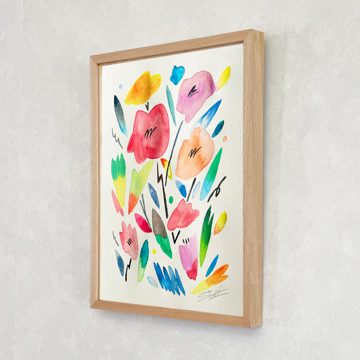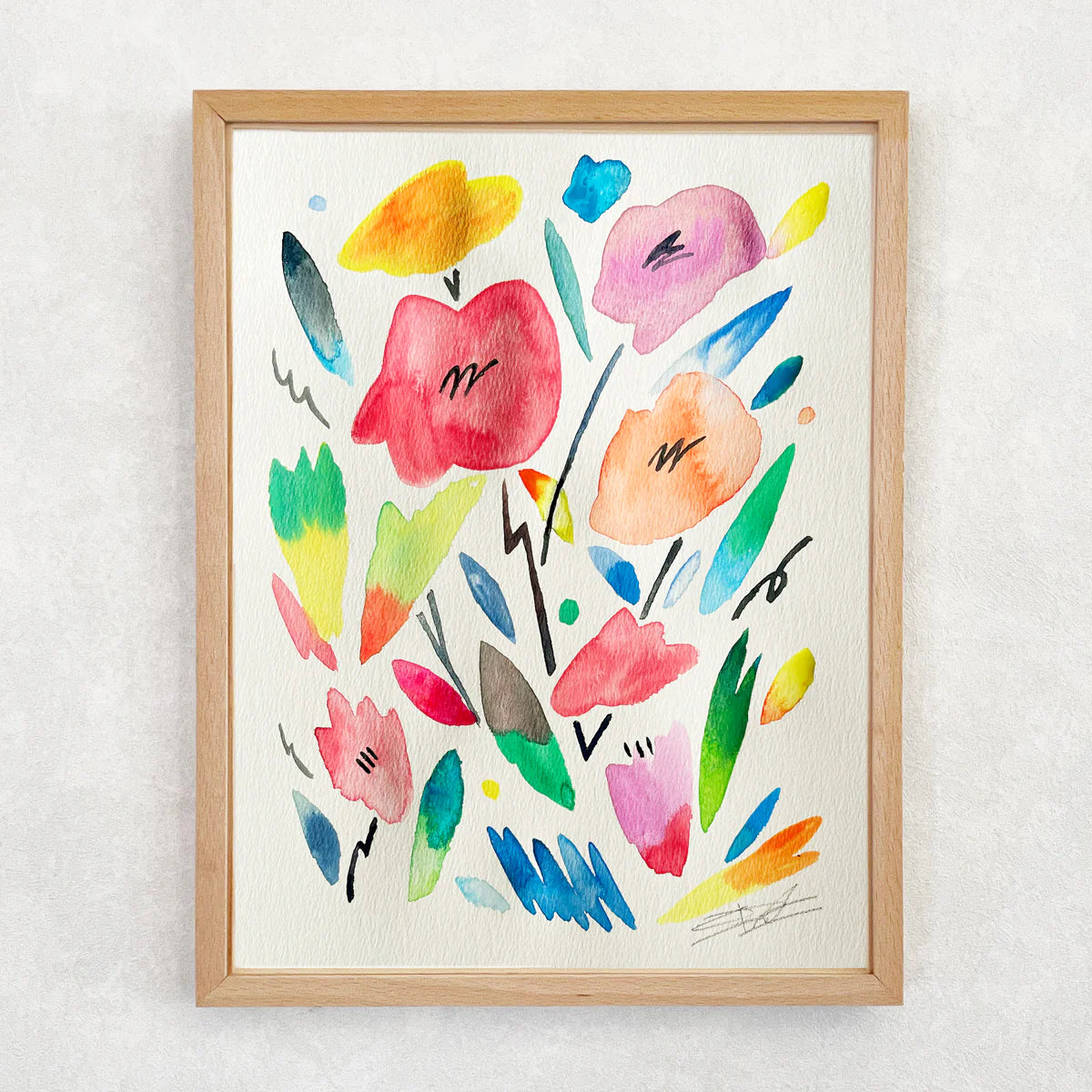 にじむように広がる色彩と、軽やかな線描がリズムよく配置された作品です。花のようにも感情のかけらのようにも見えるモチーフが、画面の中で互いに呼応し、楽しげな会話を交わしているような印象を与えます。水彩ならではの透明感と偶然性が、眺めるたびに新しい表情を生み、気持ちをやさしくほぐしてくれます。玄関やワークスペースなど、日常の一角に飾ることで、空間に明るい余韻と心地よいリズムをもたらしてくれる一枚です。