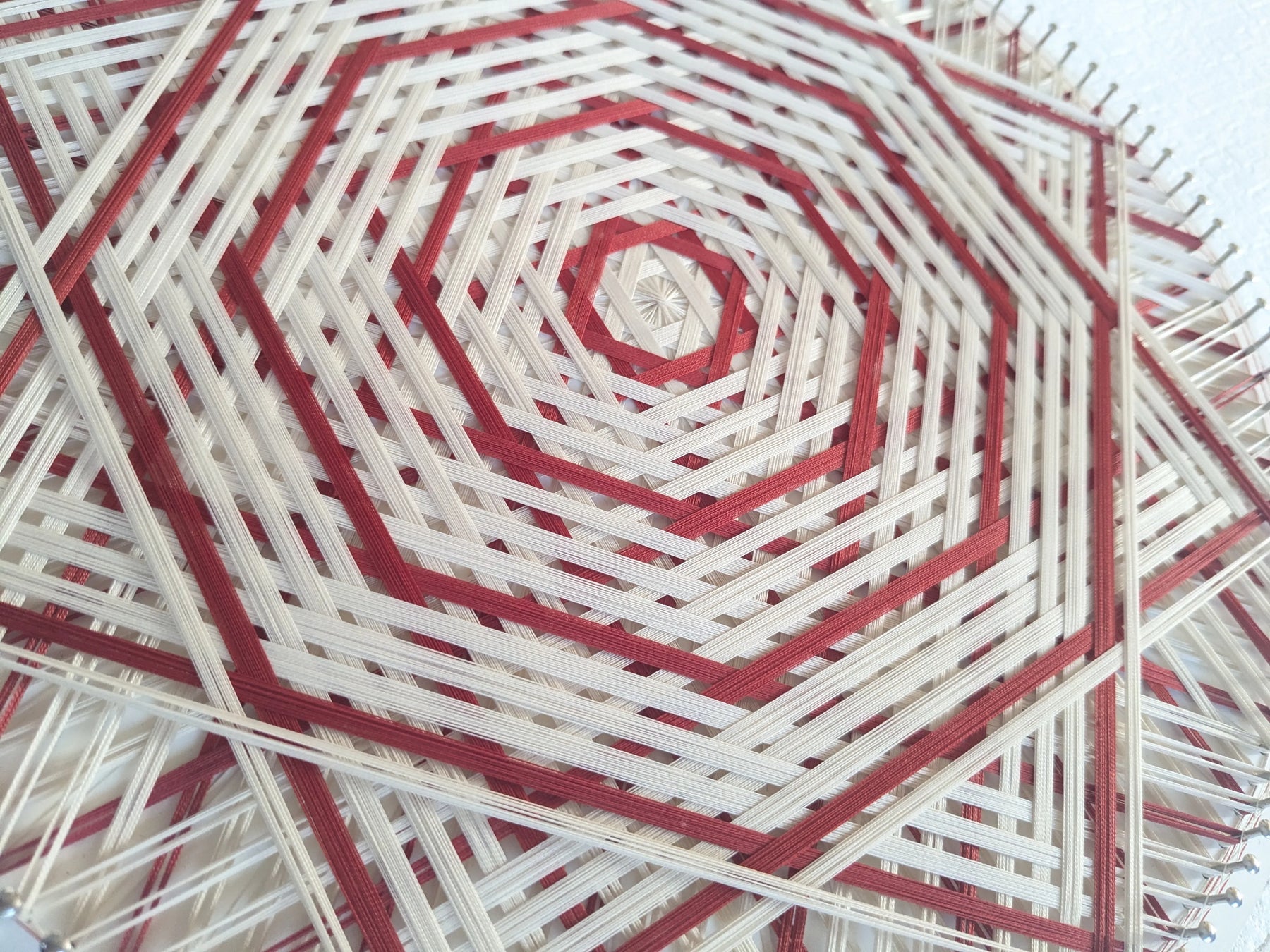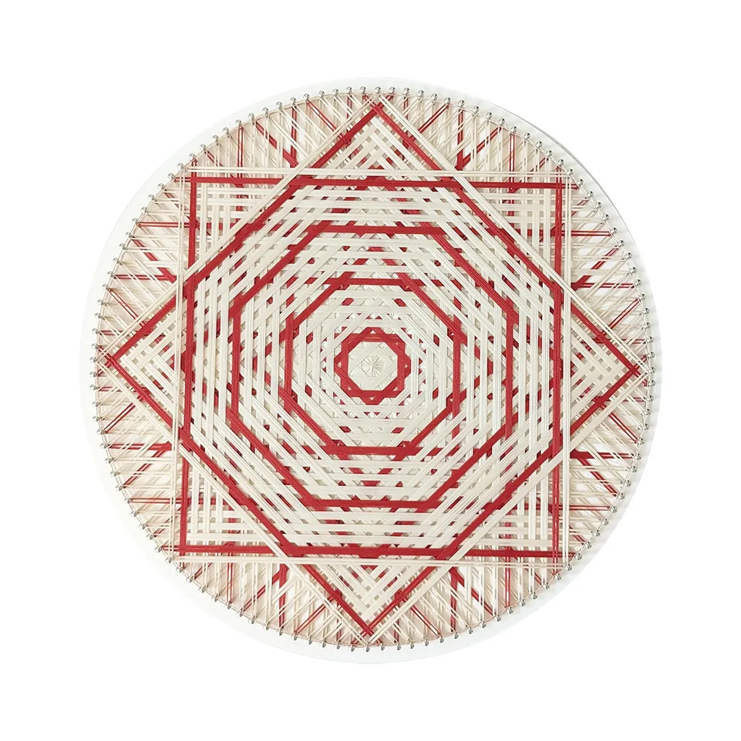清らかな白と鮮烈な赤の糸が、幾重にも重なる八角形の層を成し、神聖な儀式のような厳かな秩序を描き出しています。緻密な網目は中心へ向かうほどに密度を増し、眺めるほどに背筋が伸びるような清々しい活力を与えてくれるでしょう。この端正な一作を飾ることで、室内には晴れやかな品格が宿り、空間を凛とした空気感で刷新します。
