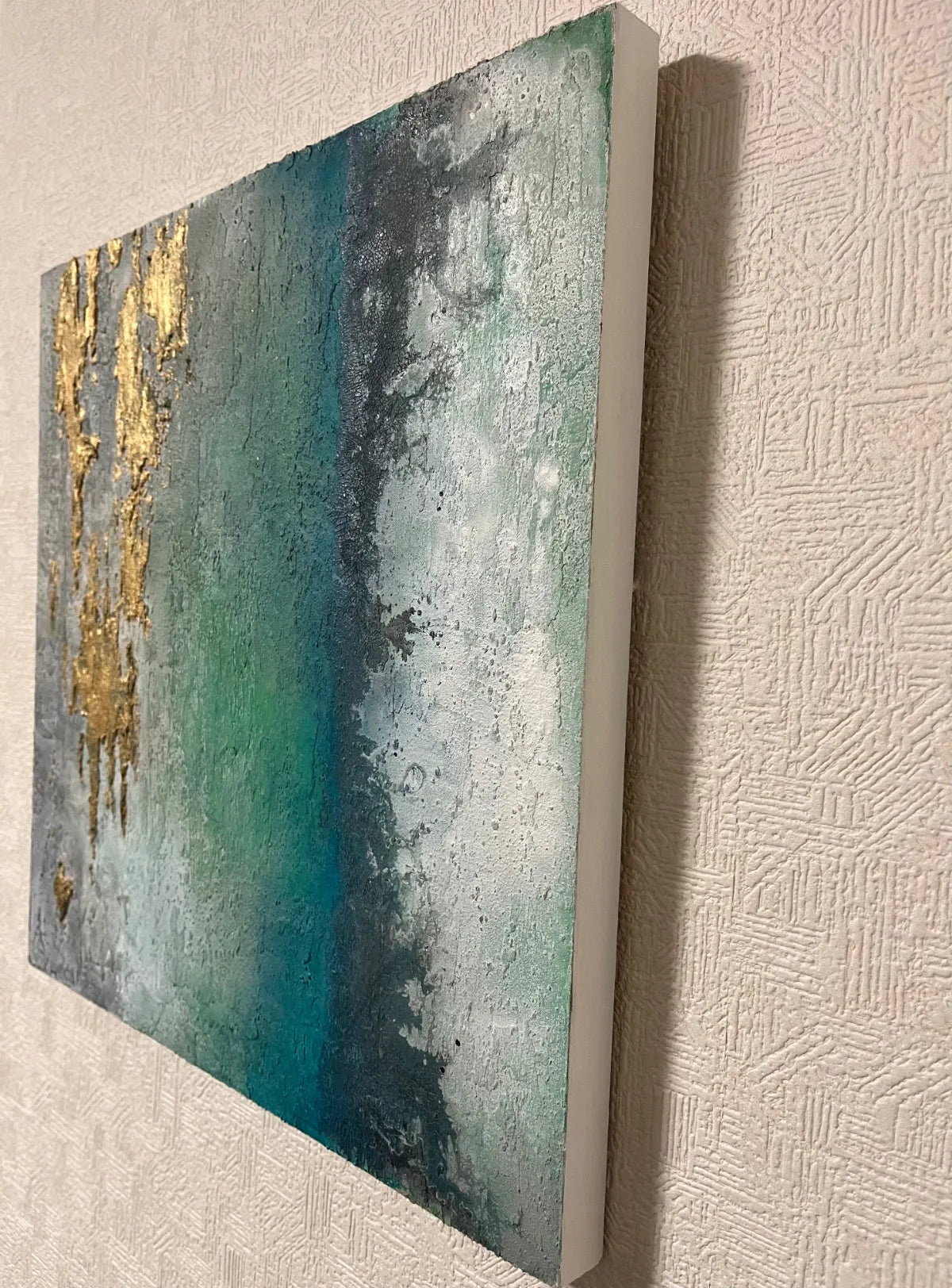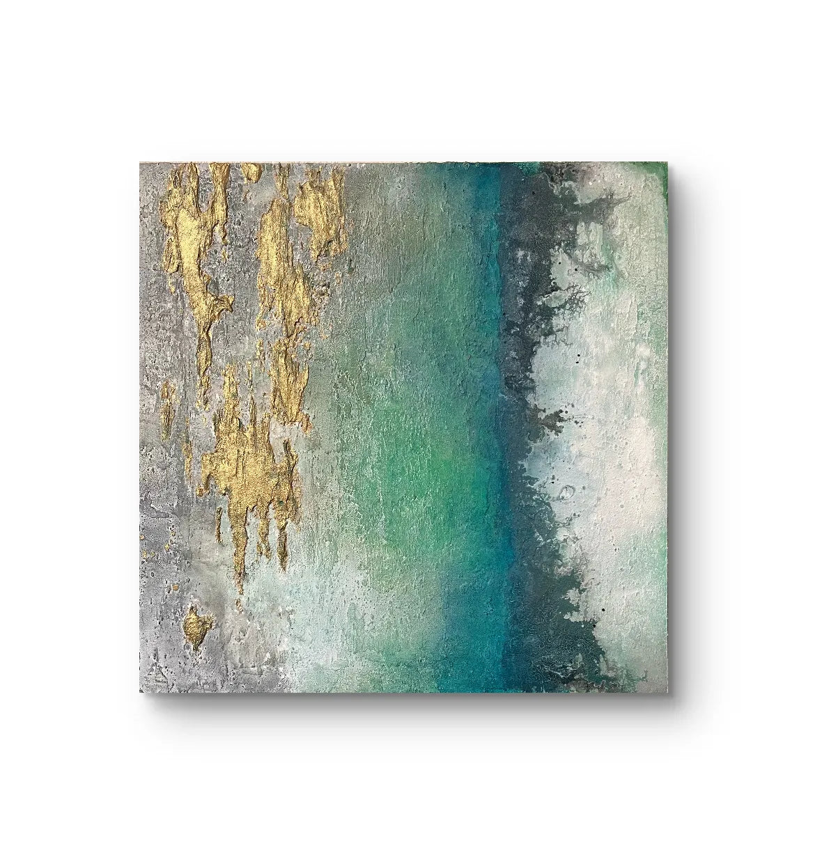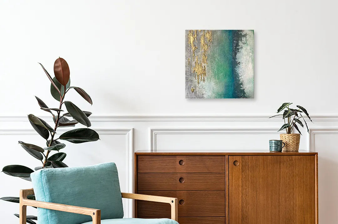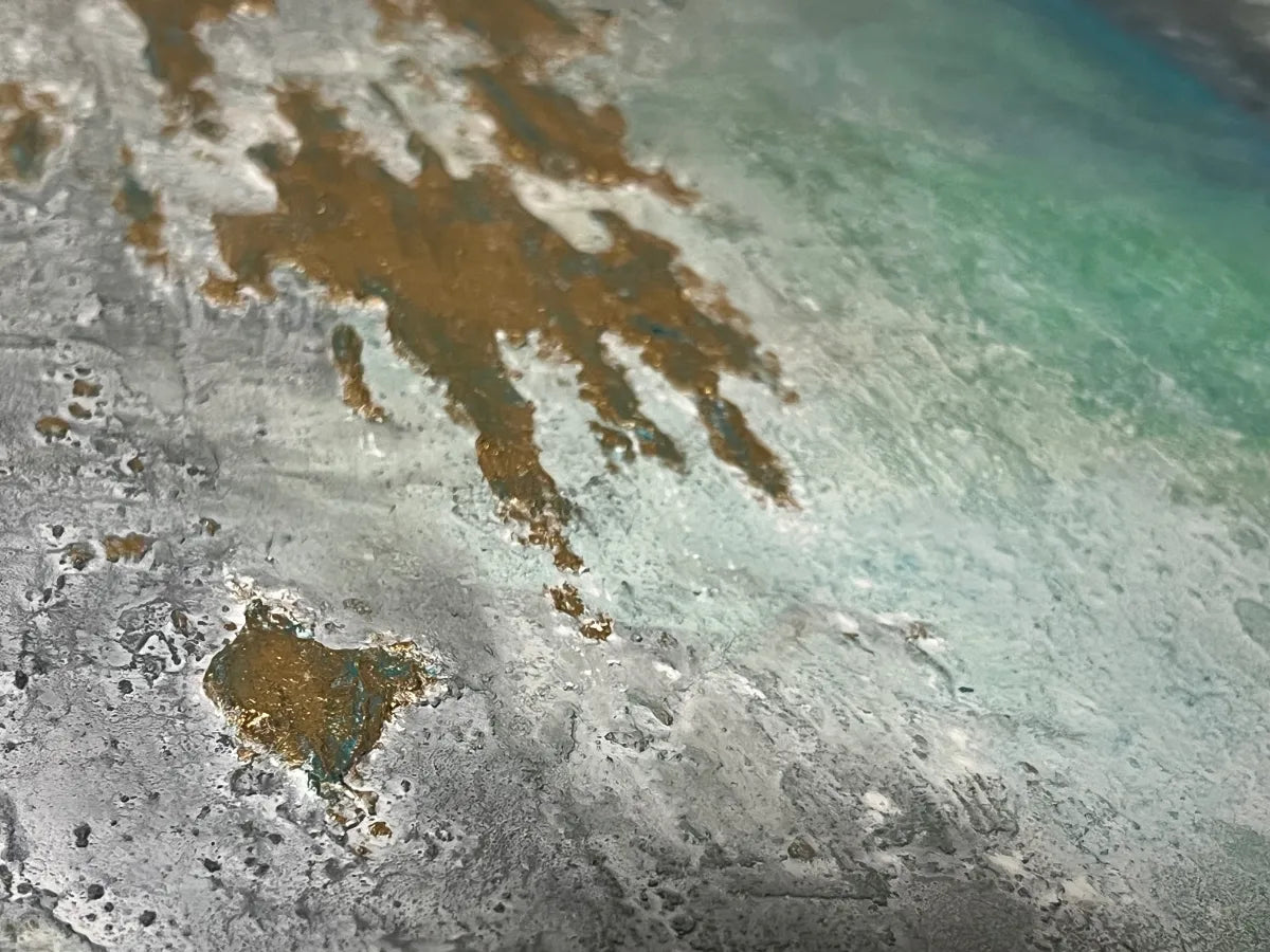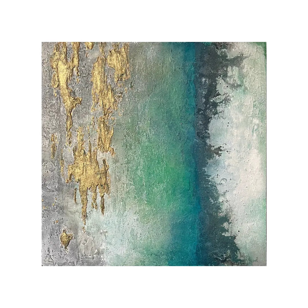 金のきらめきが岩肌のように浮かび、青と緑がゆるやかに溶け合う景色は、深海と空のあわいを思わせます。光が触れるたびに表情を変え、静かな奥行きをもたらす作品です。壁に掛けると、空間に柔らかな重なりと清らかな気流が生まれます。モダンなリビングや、自然素材を基調としたダイニングにも穏やかに馴染みます。