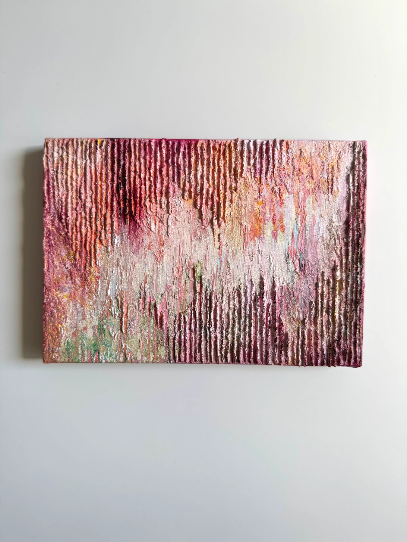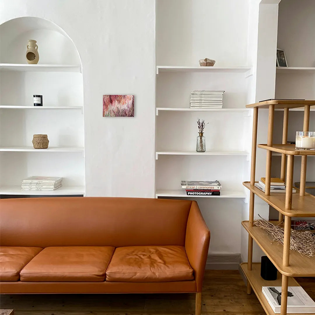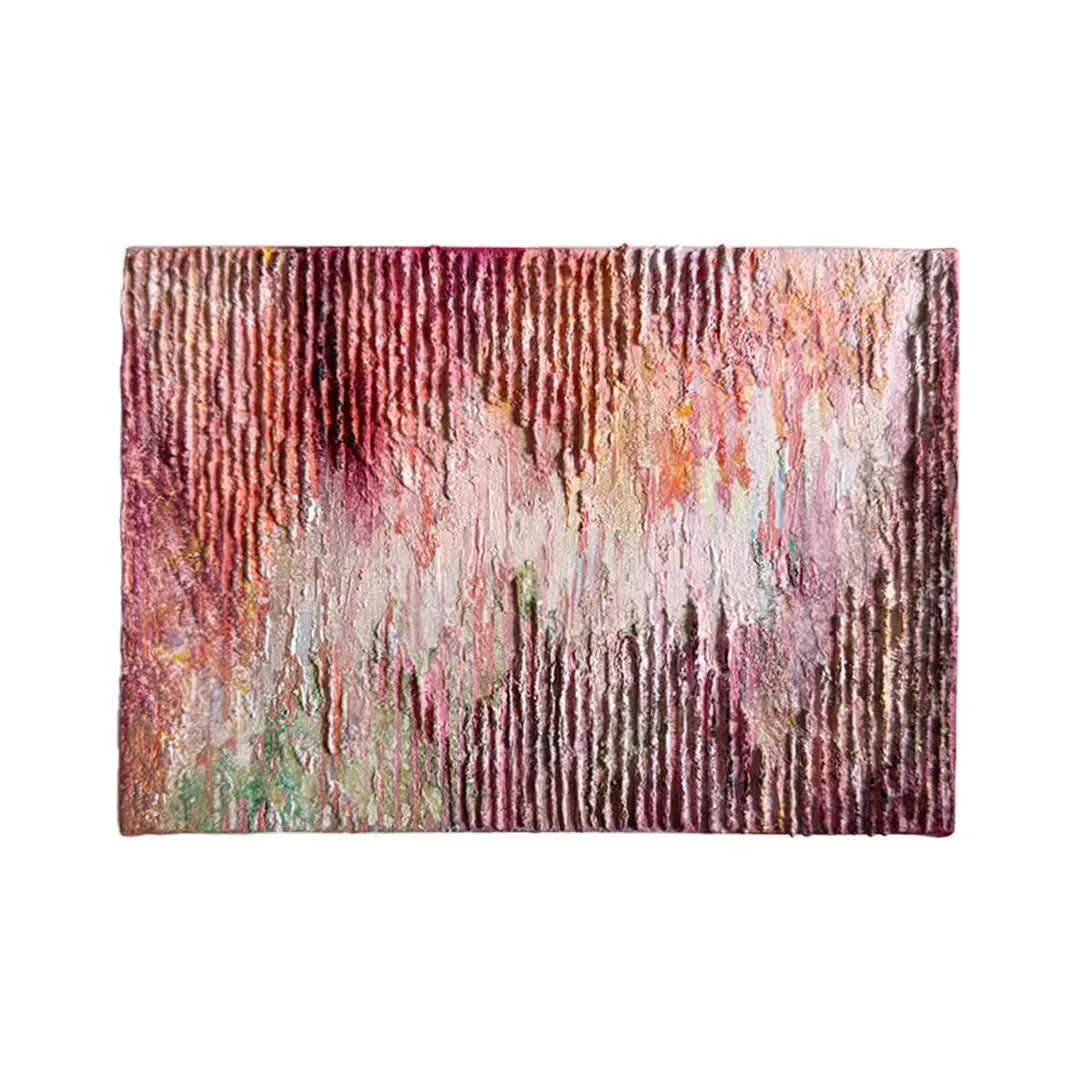 柔らかな桃色が、規則正しい凹凸の層に溶け合い、夕暮れ時の穏やかな波打ち際を想起させます。垂直に刻まれた独自の質感は、光の角度で表情を変え、眺めるほどに時間の堆積がもたらす豊かさを感じさせてくれるでしょう。この深みのある一作を飾ることで、壁面に温かな生命力が宿り、空間を心地よい緊張感で満たします。リビングや廊下に、質感の豊かな石材や織物と設えるのが最適です。