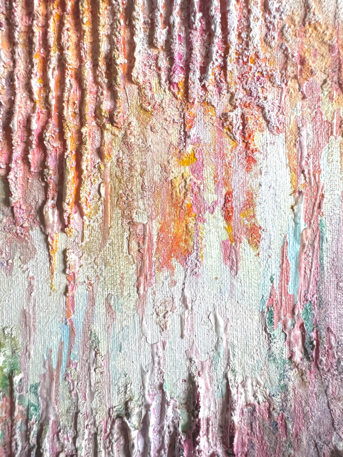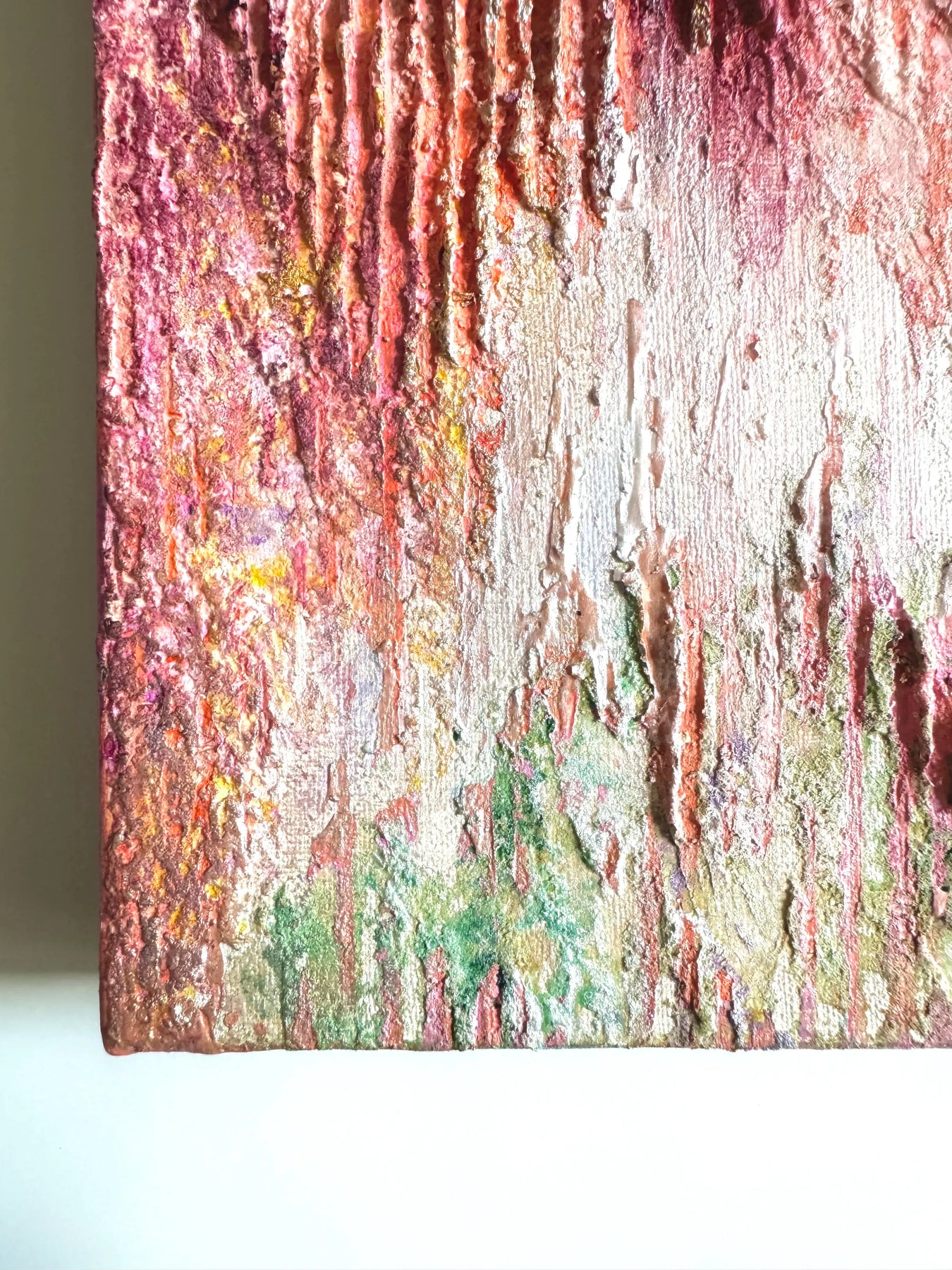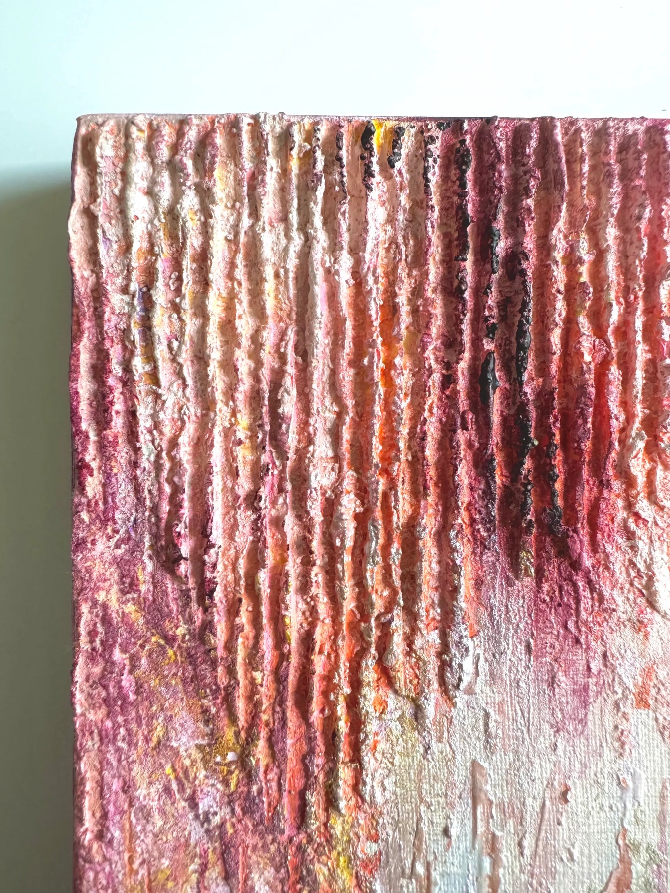 柔らかな桃色が、規則正しい凹凸の層に溶け合い、夕暮れ時の穏やかな波打ち際を想起させます。垂直に刻まれた独自の質感は、光の角度で表情を変え、眺めるほどに時間の堆積がもたらす豊かさを感じさせてくれるでしょう。この深みのある一作を飾ることで、壁面に温かな生命力が宿り、空間を心地よい緊張感で満たします。リビングや廊下に、質感の豊かな石材や織物と設えるのが最適です。