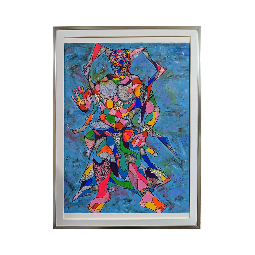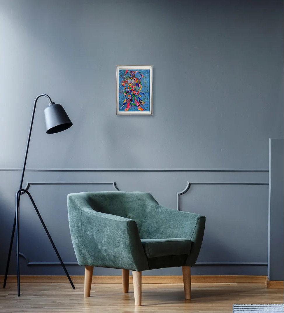 鮮やかな色と複雑な形が絡み合い、力強くも幻想的な印象を与える作品です。人物の姿を囲む色彩は、まるでその動きや感情を解き放つように広がり、視覚的なリズムを生み出します。壁に飾ることで、空間に活気をもたらし、見るたびに異なる表情を見せます。モダンなインテリアや個性を重視した空間にも調和し、目を引く存在となるでしょう。