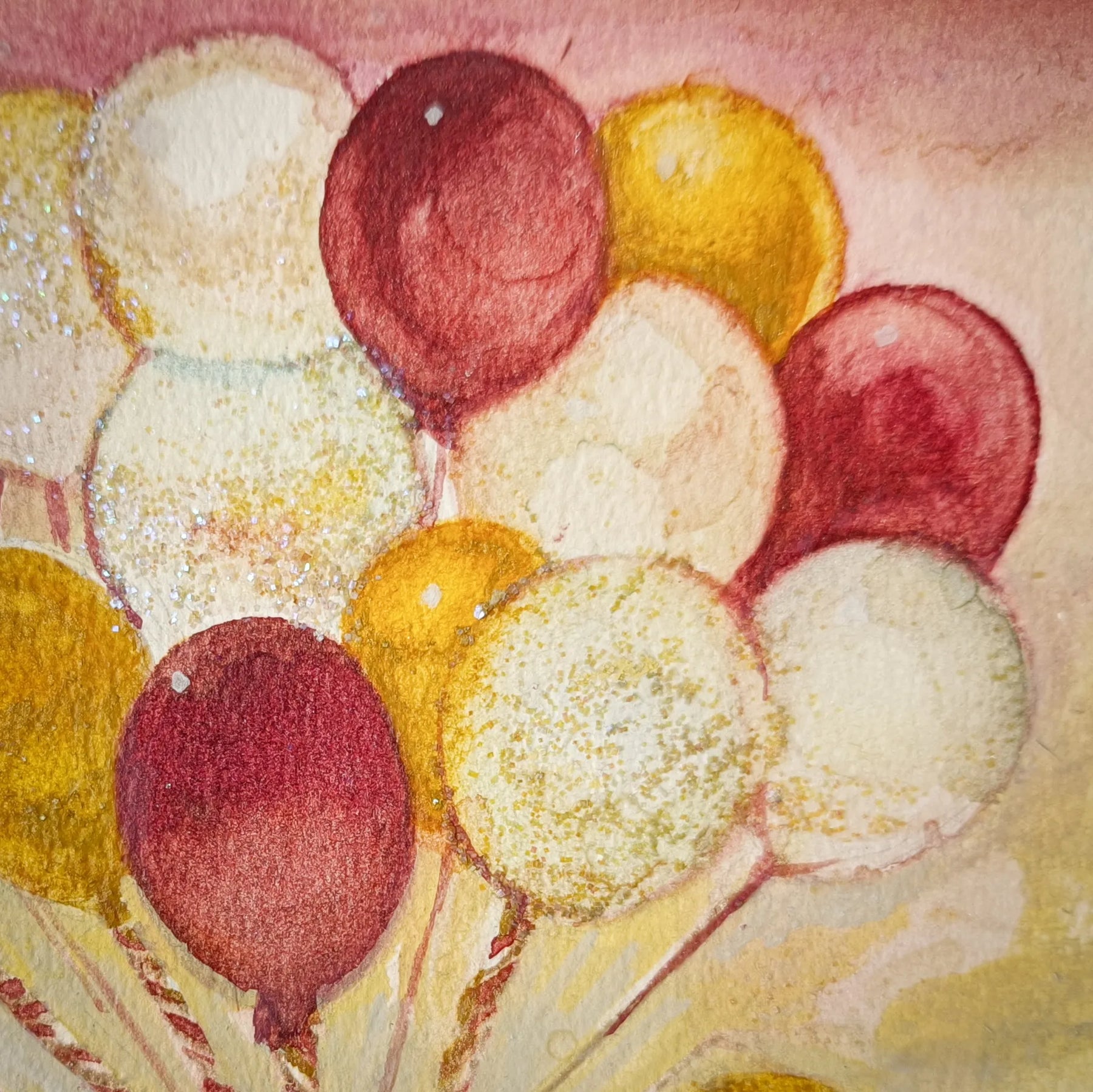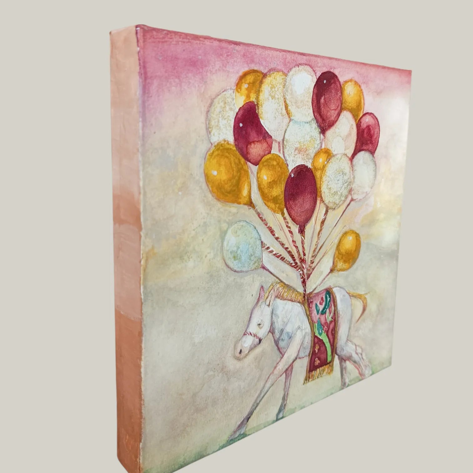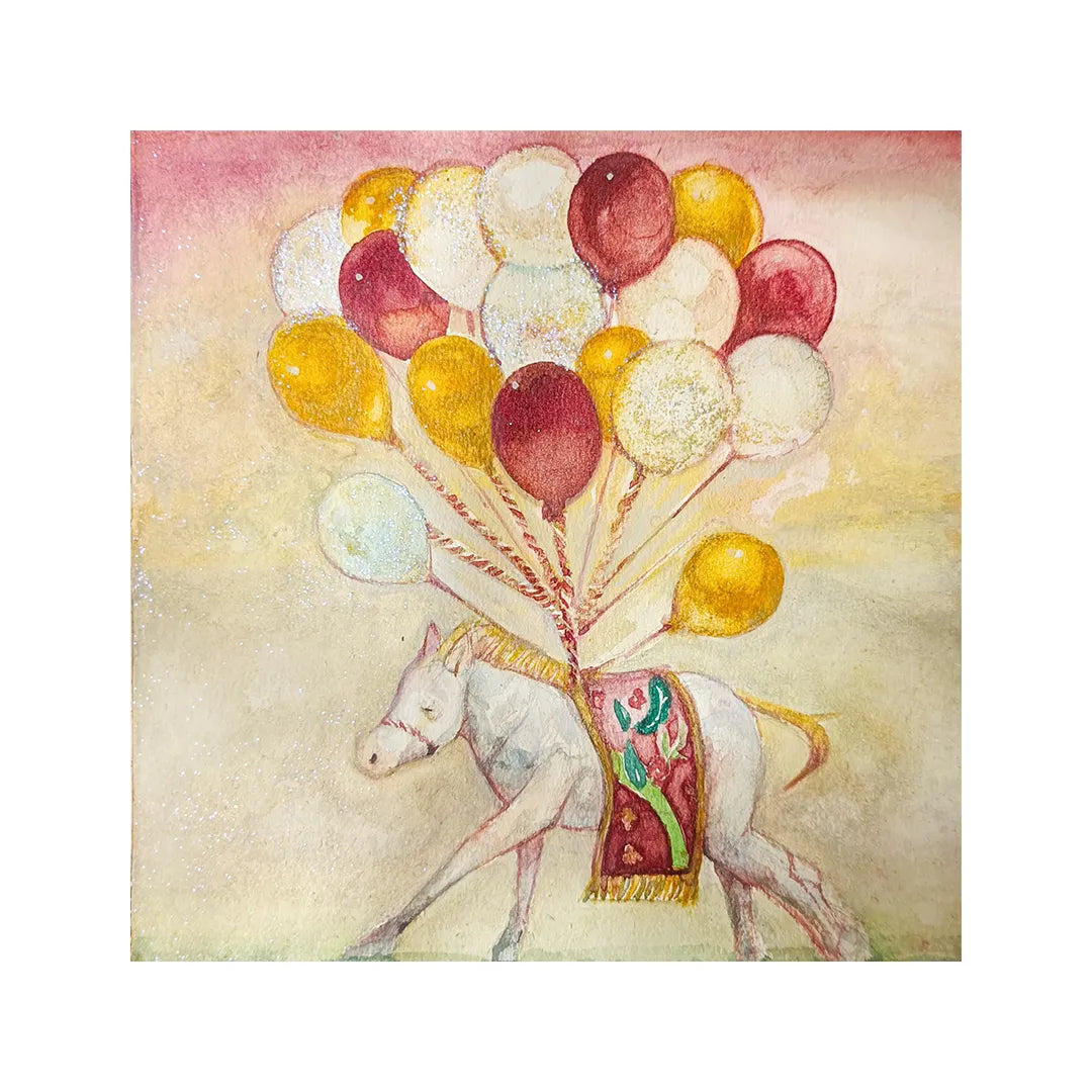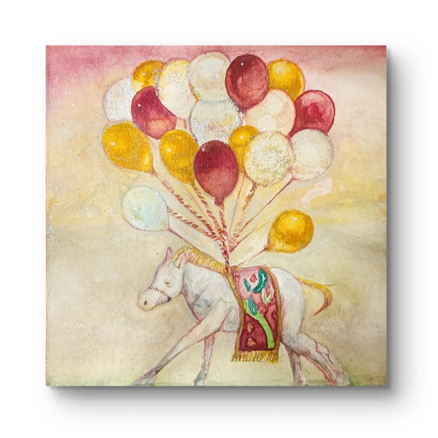 光をまとい、色とりどりの風船が空へ引き上げます。粒子のきらめきが時間を止め、温度のある色調が安心感を残します。白馬の歩みは軽やかで、童話の一場面が壁に現れたかのようです。飾ると視線が上へ誘われ、部屋に祝福の空気が広がります。玄関や子ども部屋、木目の家具や柔らかな布と合わせると、日常に微笑みが宿ります。