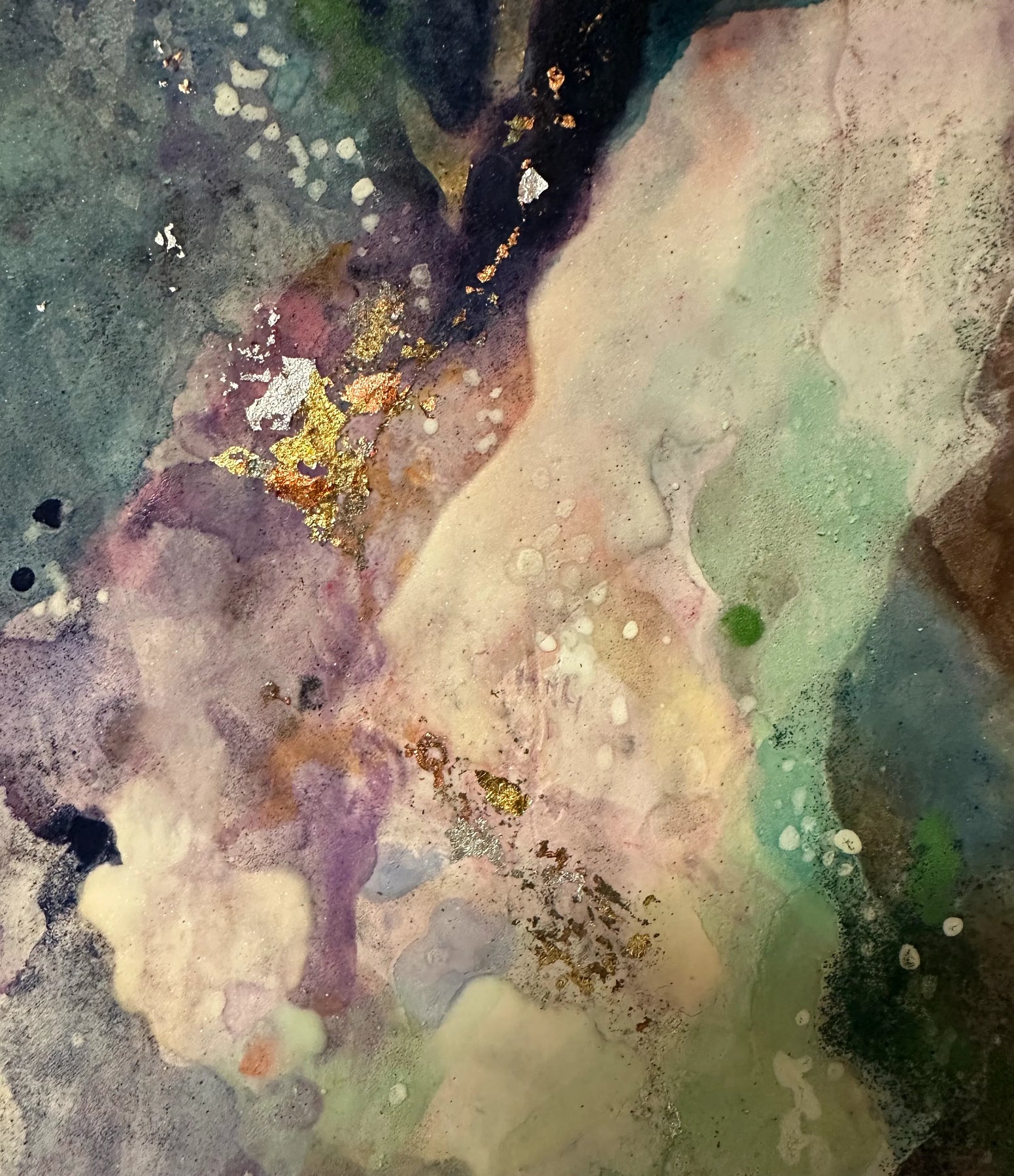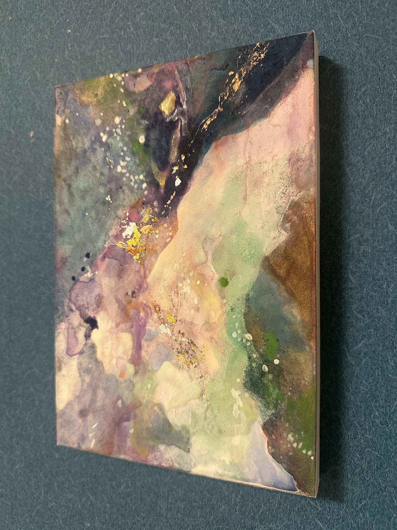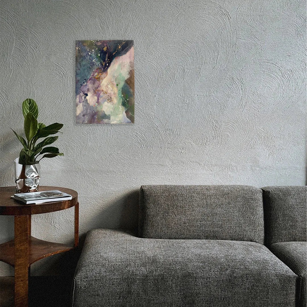 深い群青から淡い紫へと広がる色の重なりが、夜空に揺らぐ星雲のような奥行きを描きます。ところどころに散る金のひらめきが静かな光となり、視線をやさしく導いてくれる一枚です。眺めるほどに、夜の空気がほどけていくような静寂が広がり、壁面に落ち着いた深さを添えてくれます。ニュアンスのあるインテリアや、照明を落としたリビング・寝室にも自然に馴染む作品です。