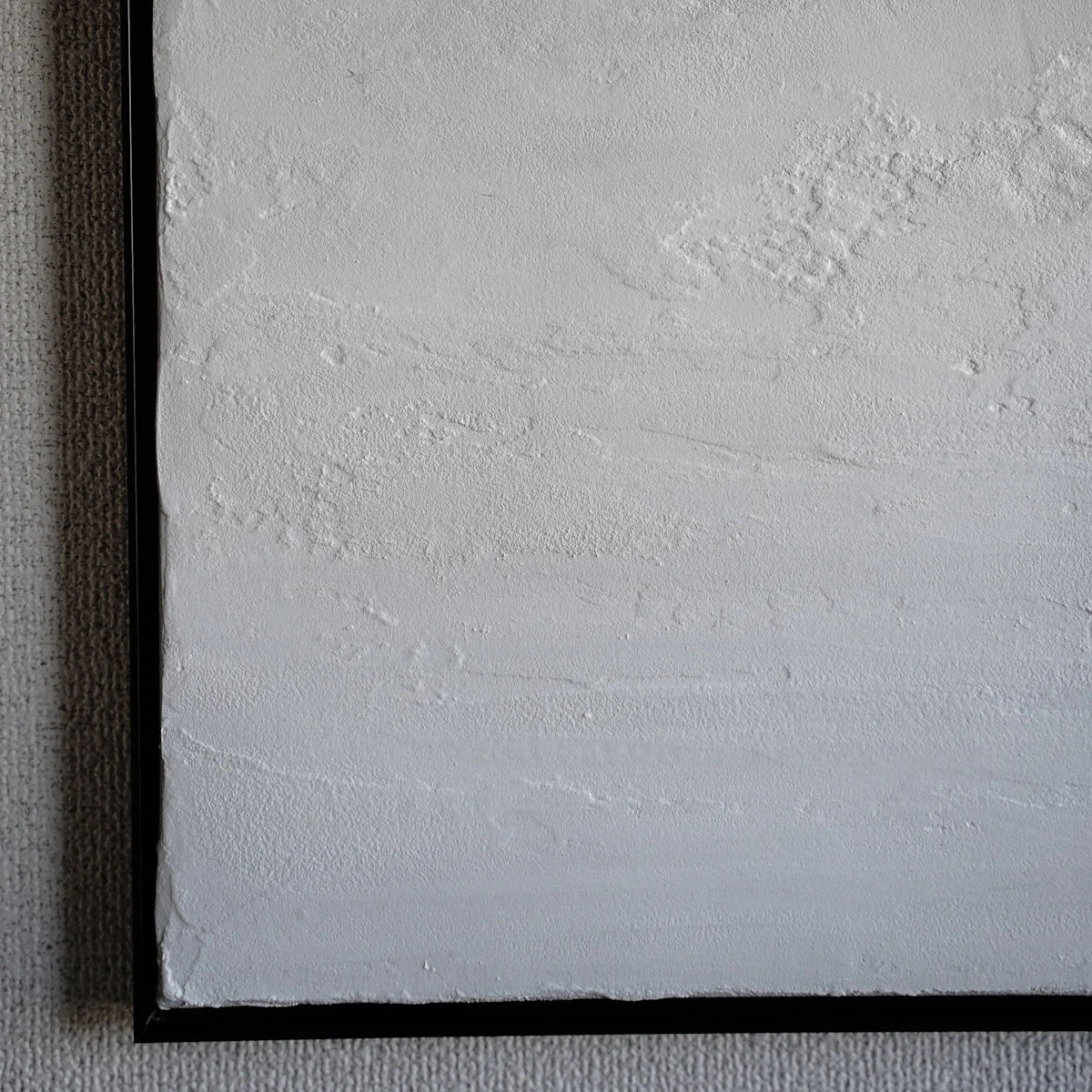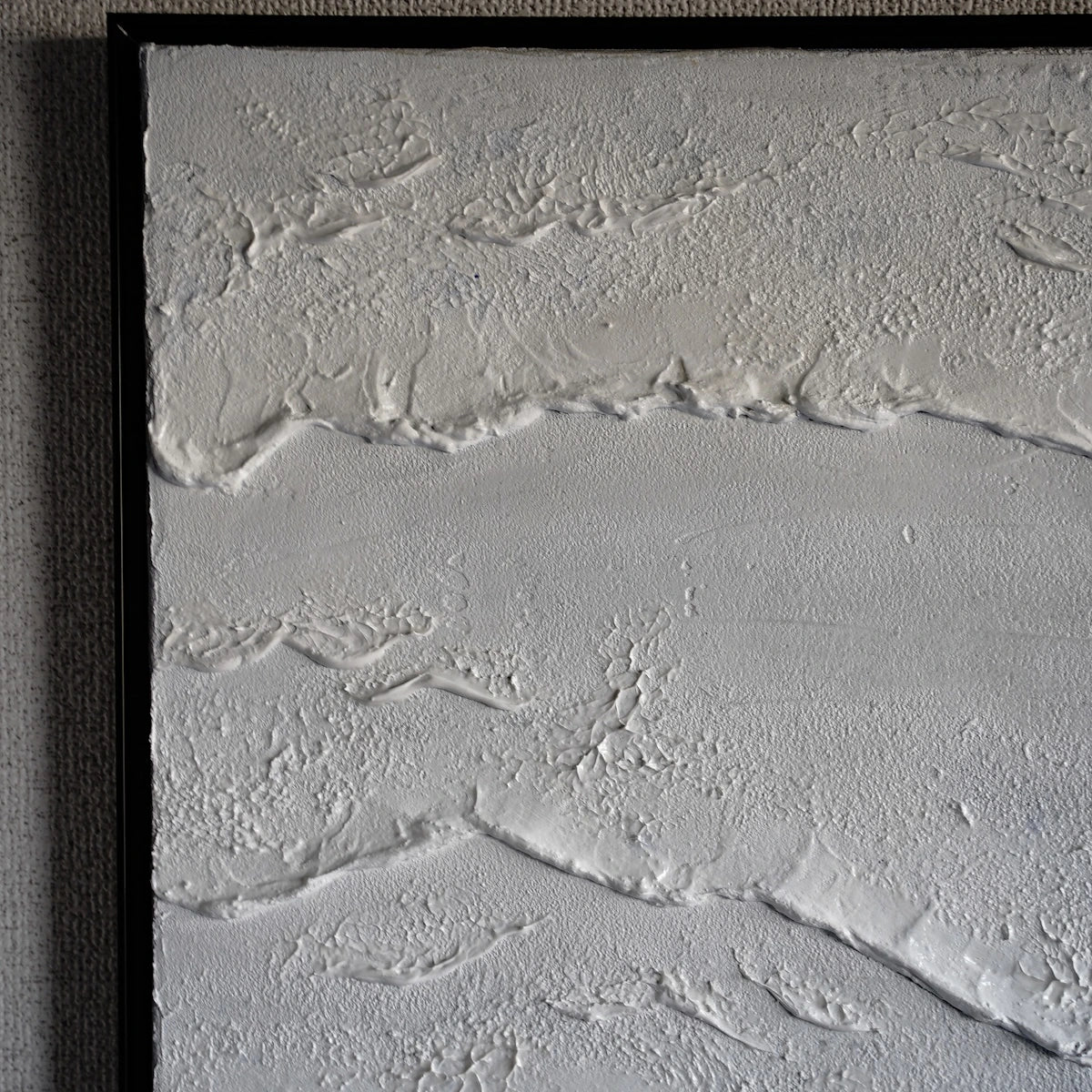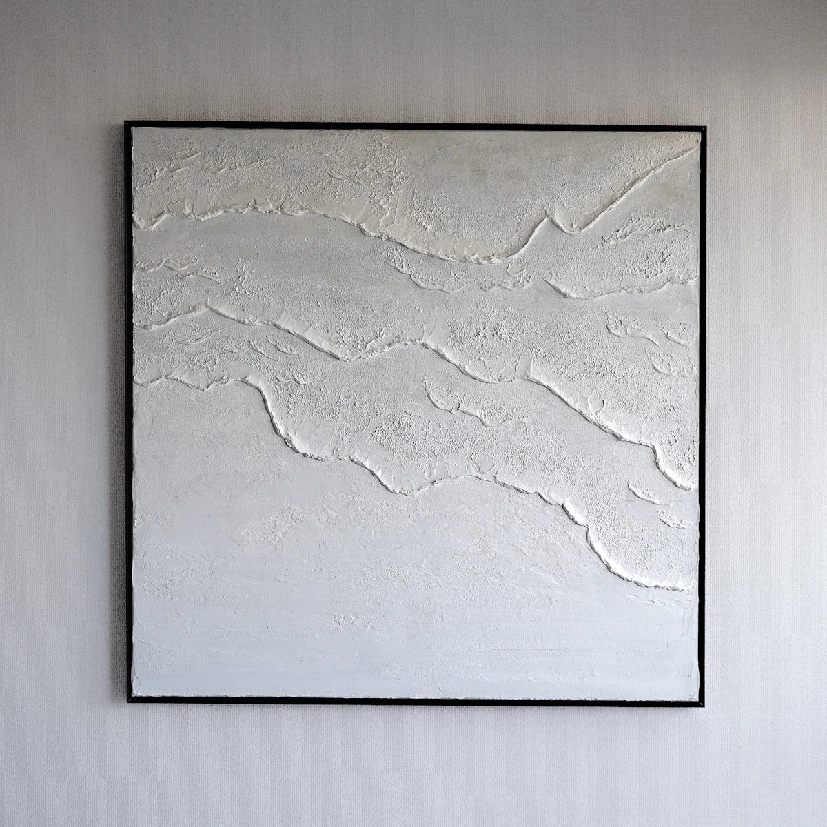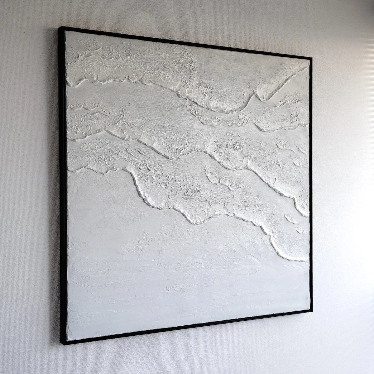 寄せ返す波のような重厚な凹凸が、幾重にも重なり合い、心地よい静動の響きを奏でます。混じり気のない白の濃淡は、見つめるほどに心の雑音を消し去り、凪いだ海辺に立つような深い安らぎを届けてくれるでしょう。この一枚を壁に飾ることで、空間に澄んだ空気感が満ち、日々の喧騒を忘れさせる特別な休息の場へと変わります。リビングのメインの壁面や玄関に、ミニマルな空間のアクセントとして気高く馴染みます。
