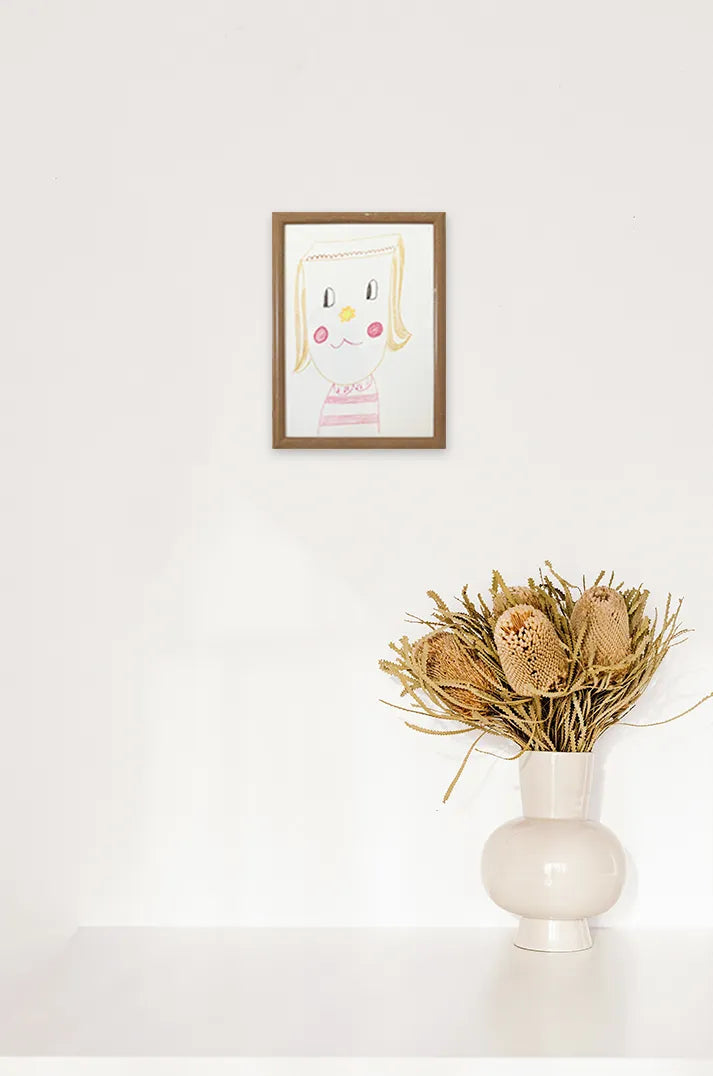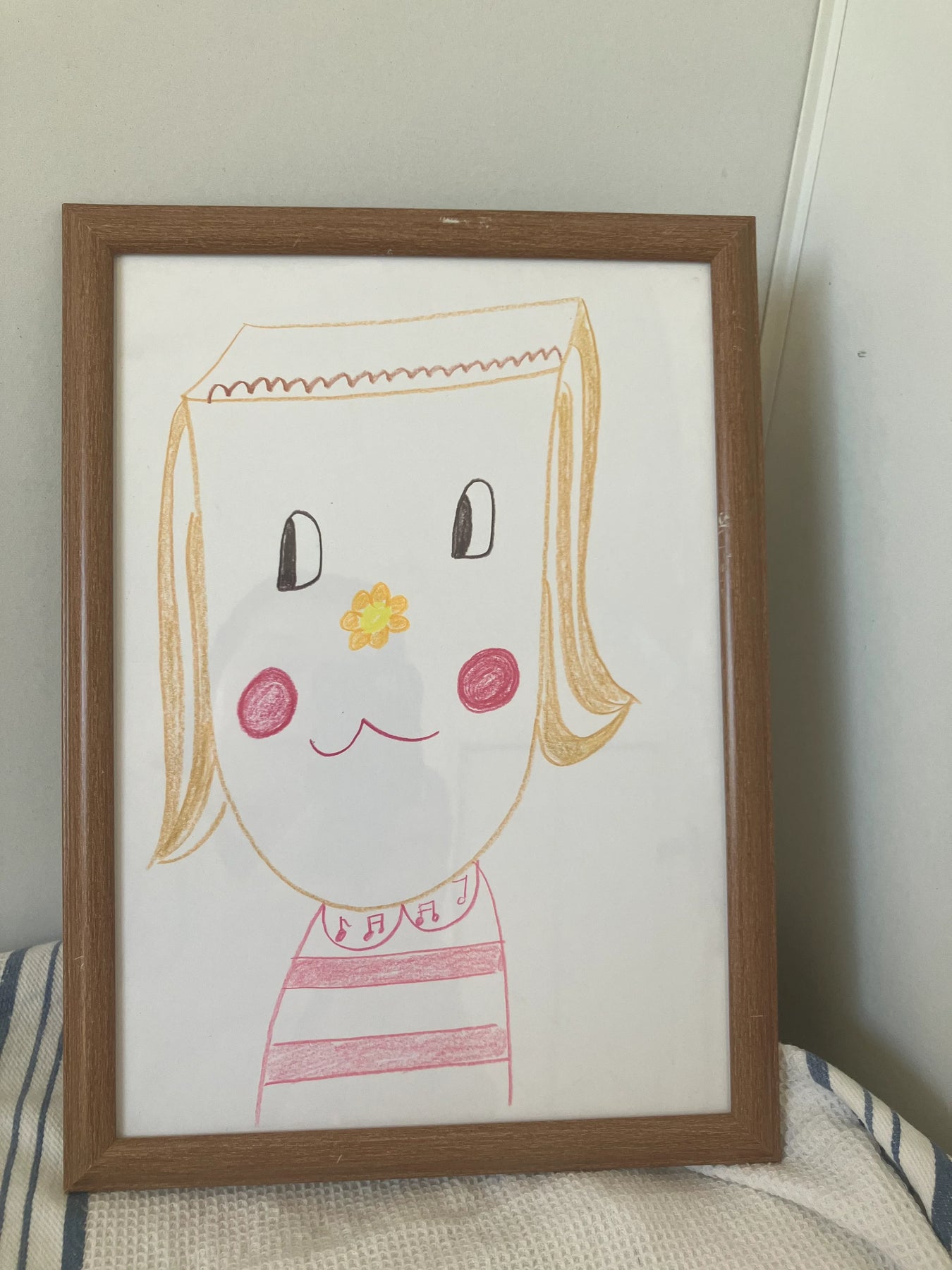 色鉛筆の柔らかなタッチで描かれた、紙袋を被ったような愛らしいキャラクターが、見る人を思わず笑顔にする温かな作品です。頬を染めて歌を口ずさむような表情は、何気ない日常の中に潜む、小さくて大切な幸せを思い出させてくれるでしょう。お部屋に飾ることで、空間の空気がふんわりと和らぎ、家族が集う場所をより明るく賑やかな雰囲気へと変えてくれます。お子様のお部屋や、木製のフォトフレームを並べた棚に飾るのがよく似合います。