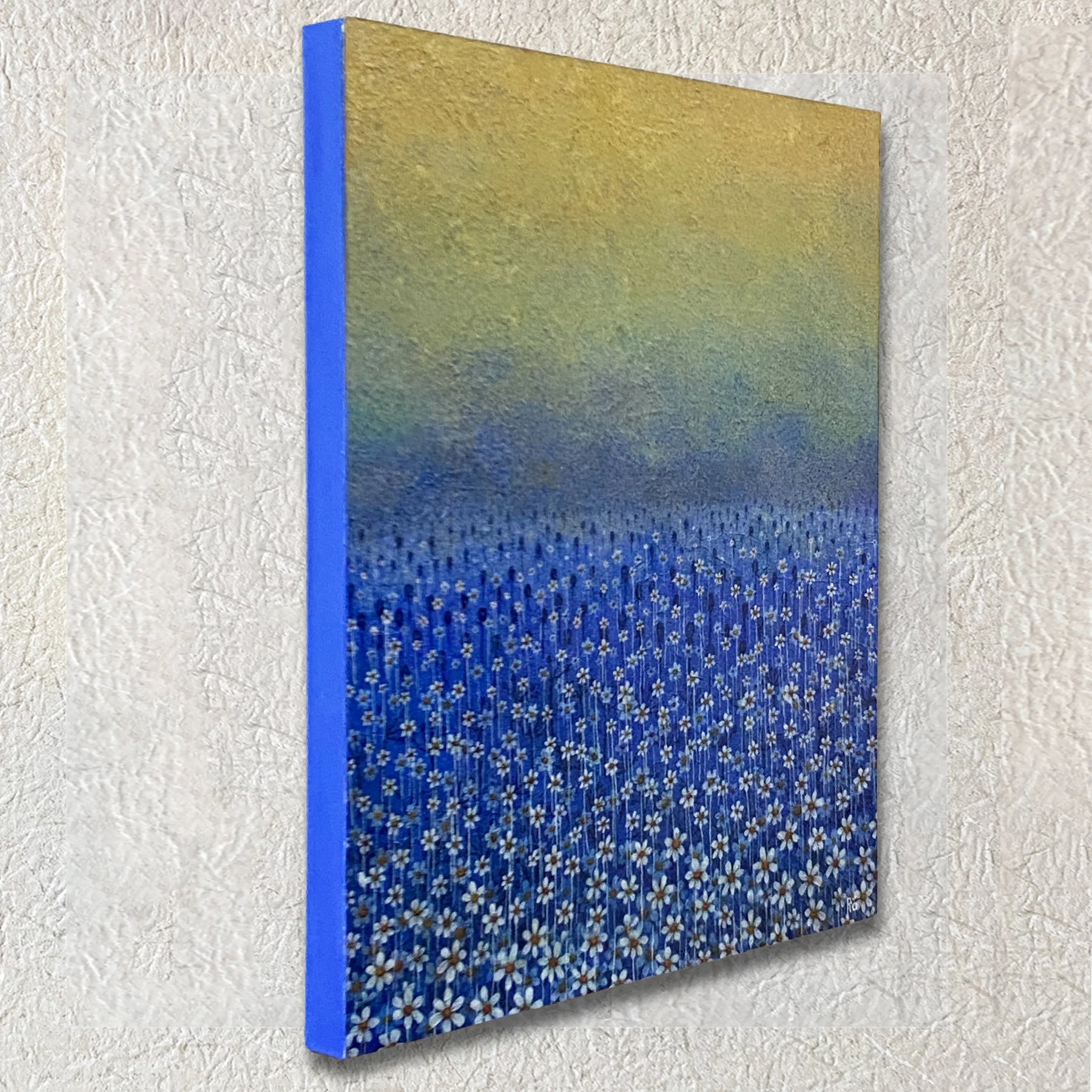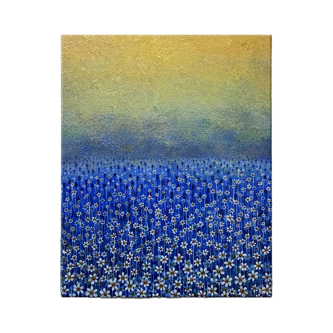 黄金色の空から降り注ぐ光が、一面に広がる青い花々を優しく包み込み、生命の輝きを謳歌しているような情景です。細密に描かれた花びらの一枚ずつが、心地よい微風に揺れる野原の香りを、見る人のもとへ運んでくれるでしょう。お部屋に飾ることで、壁面に瑞々しい窓が生まれたかのように、日々の暮らしへ前向きな活力を添えてくれます。温かみのある北欧家具や、白い壁が印象的な明るいリビングにも美しく馴染みます。