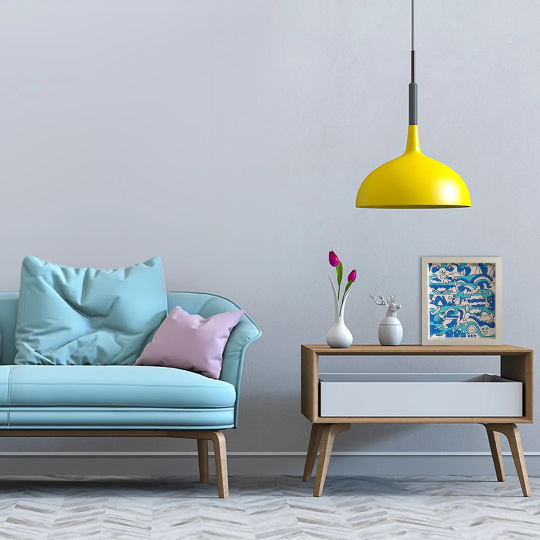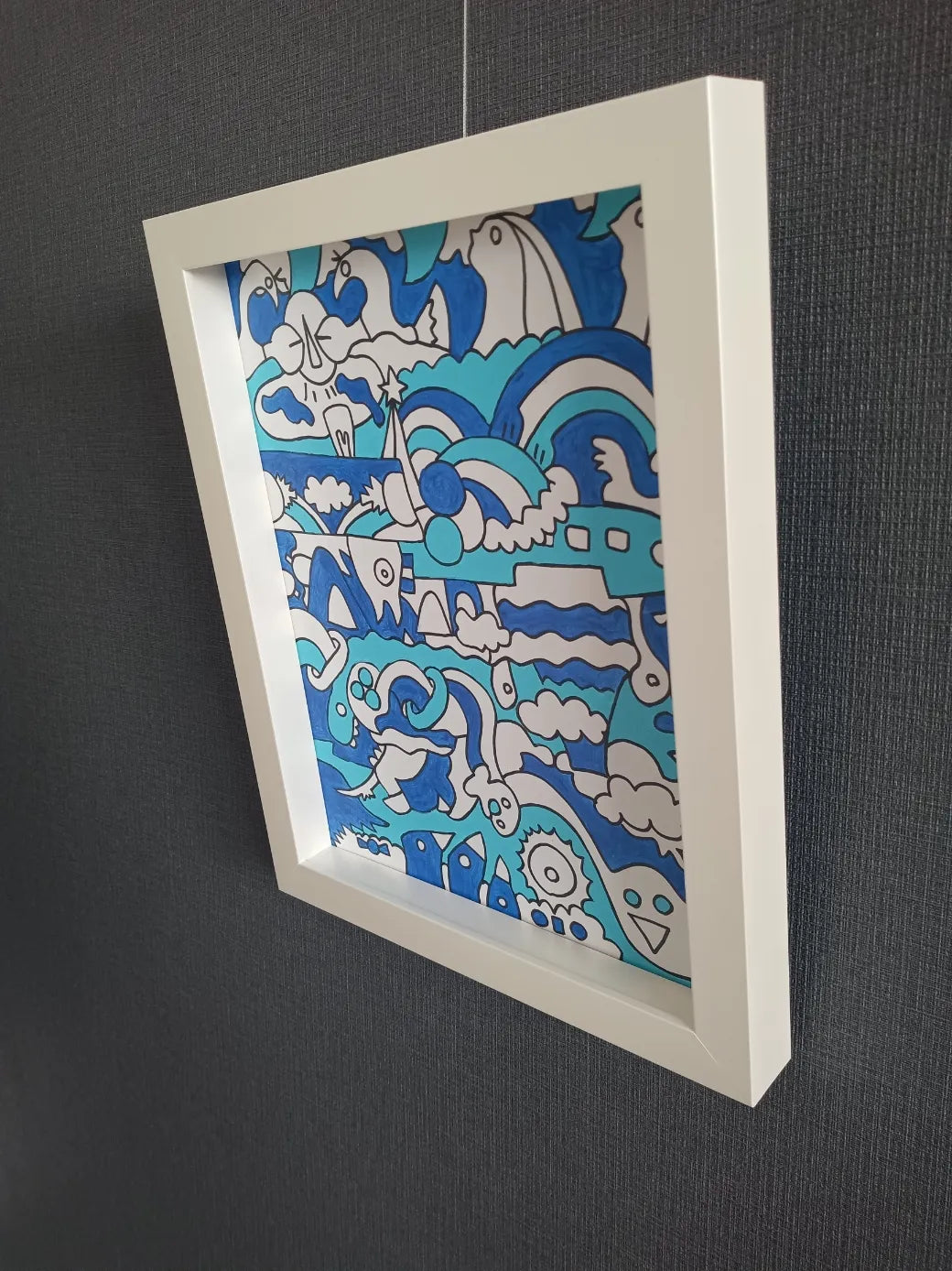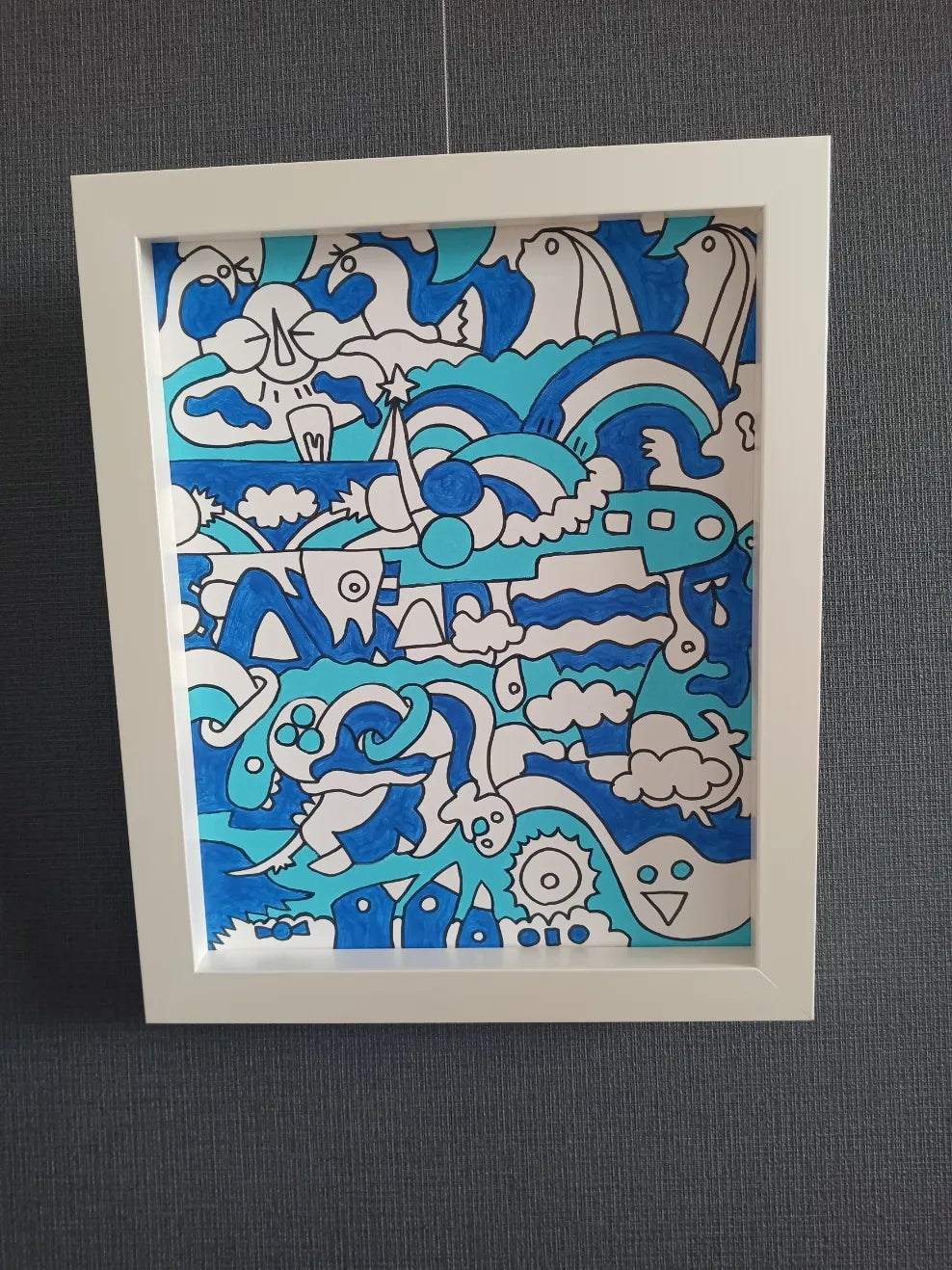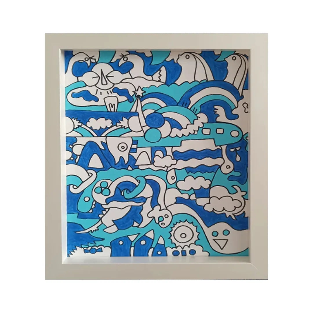 線と青のグラデーションが複雑に絡み合い、まるで夢の中の世界を覗いているかのような作品です。愛らしいキャラクターや建物、雲が、見る人の想像力を掻き立て、楽しい物語を紡ぎ出してくれます。遊び心あふれるタッチは、子供の頃の無邪気な気持ちを思い出させてくれるでしょう。リビングや子供部屋、玄関など、家族が集まる場所に飾ると、空間に明るく楽しい雰囲気が広がります。ポップなインテリアやナチュラルスタイルにもよく馴染む一枚です。空と海と飛行機と