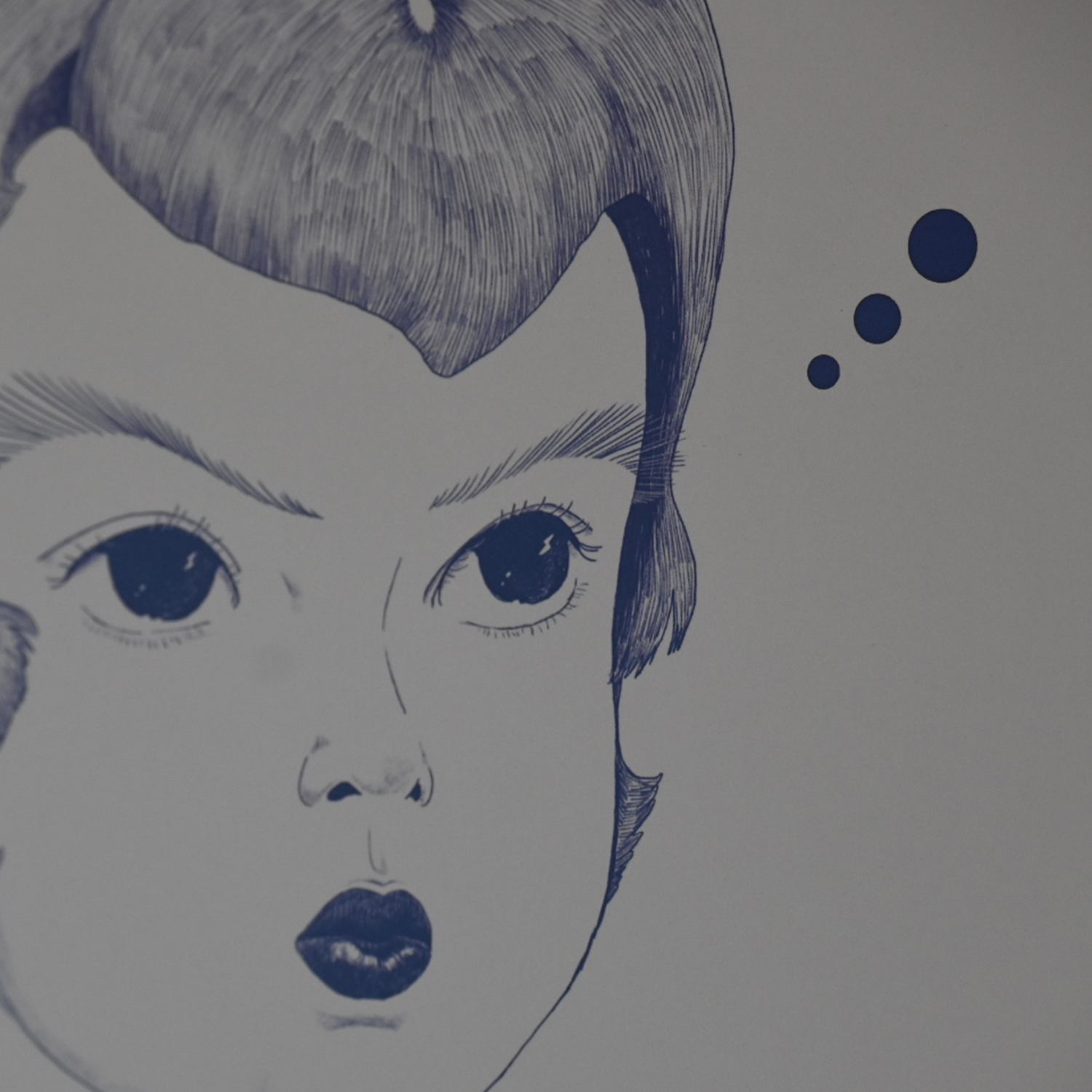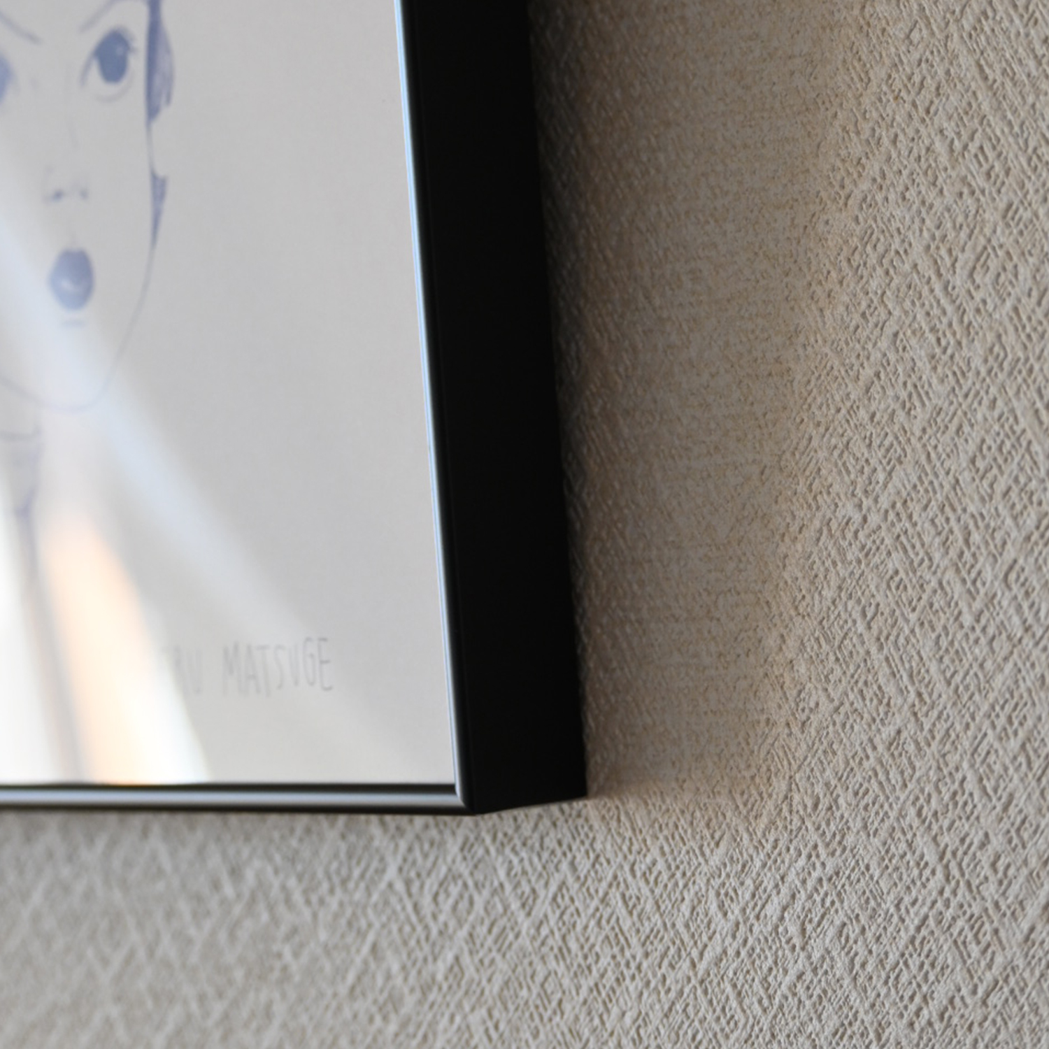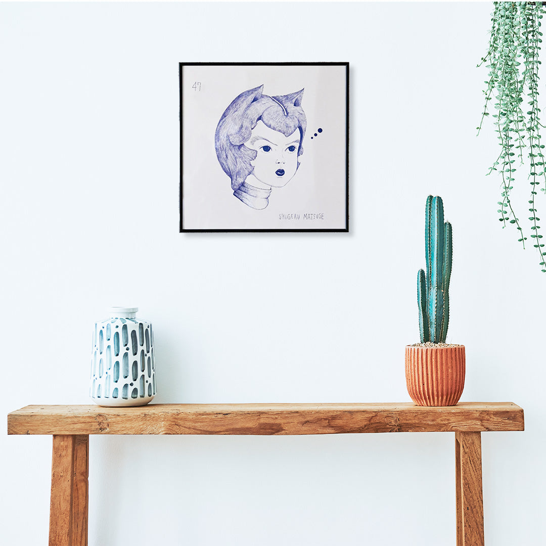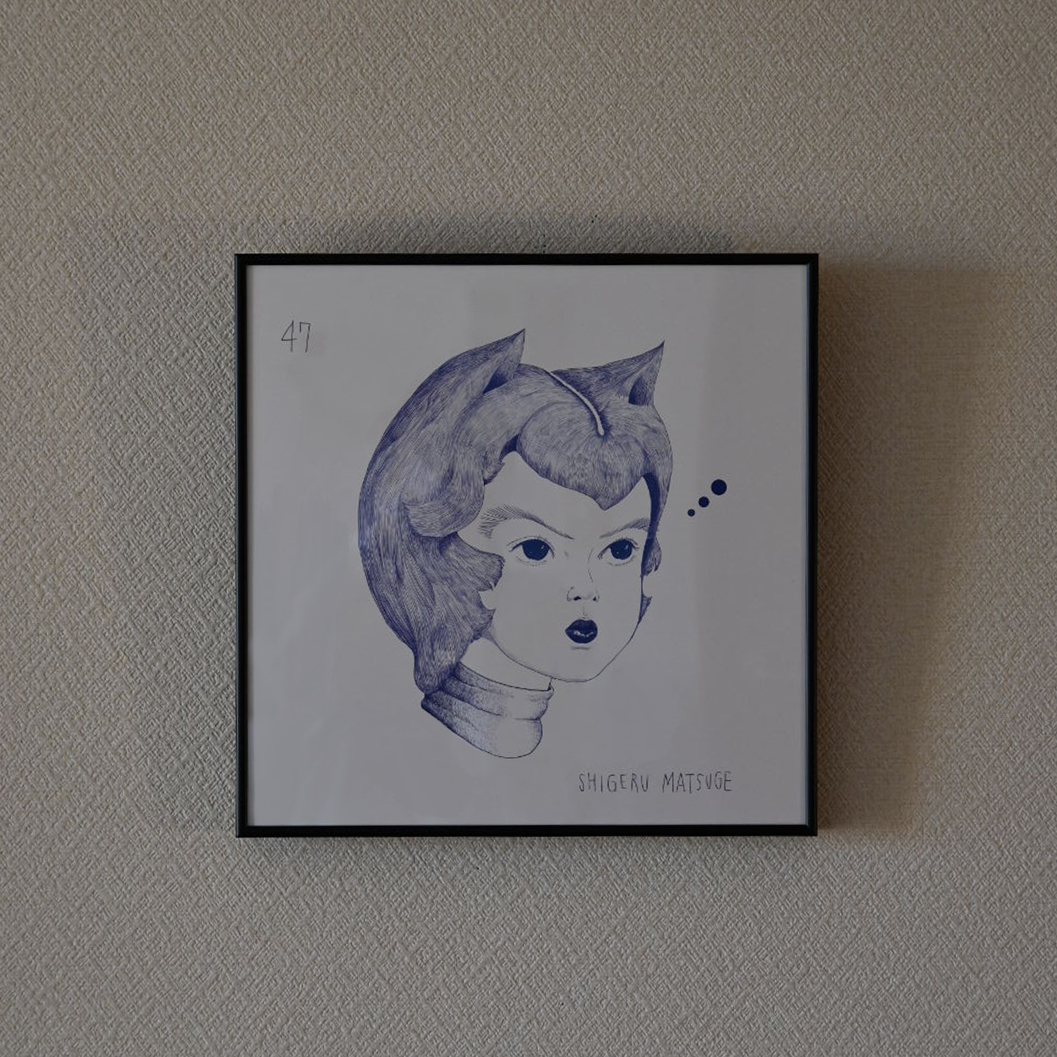 ボールペンの細密な線が織りなす陰影によって、凛とした少女の眼差しが幻想的に描き出されています。単色が生み出す深い静寂と、猫耳を模したような遊び心ある造形は、見るたびに知的な好奇心を刺激し、心に静かな波紋を広げてくれるでしょう。この作品を飾ることで、お部屋の空気がキリリと引き締まり、自分自身と向き合うための高潔な時間をもたらしてくれます。