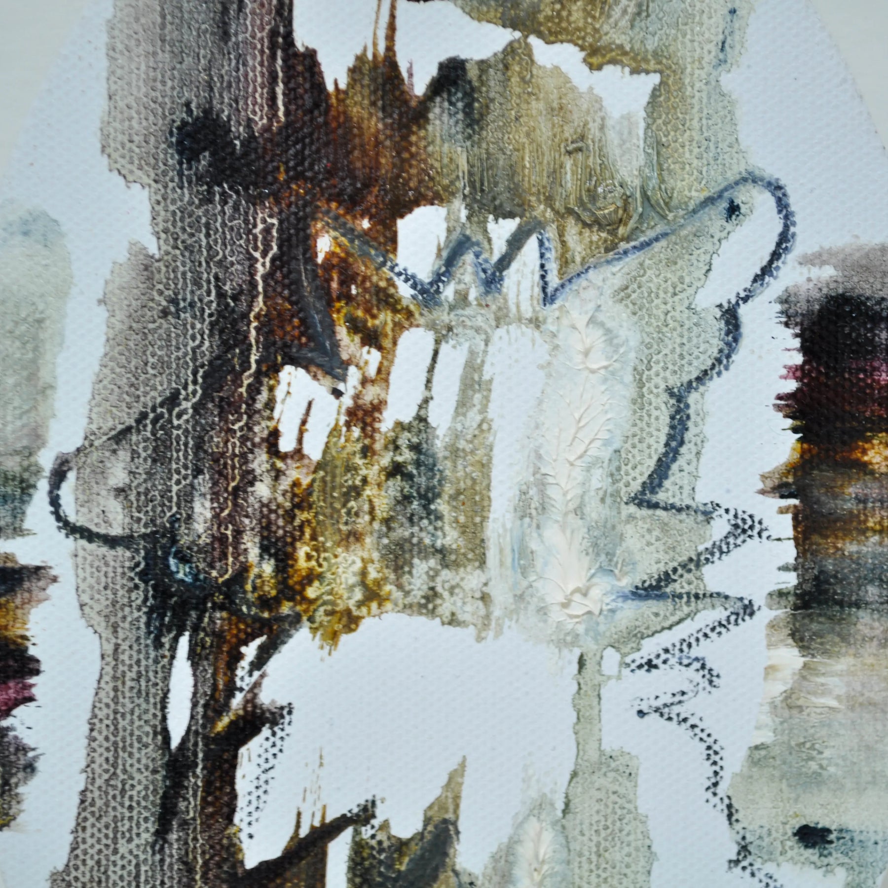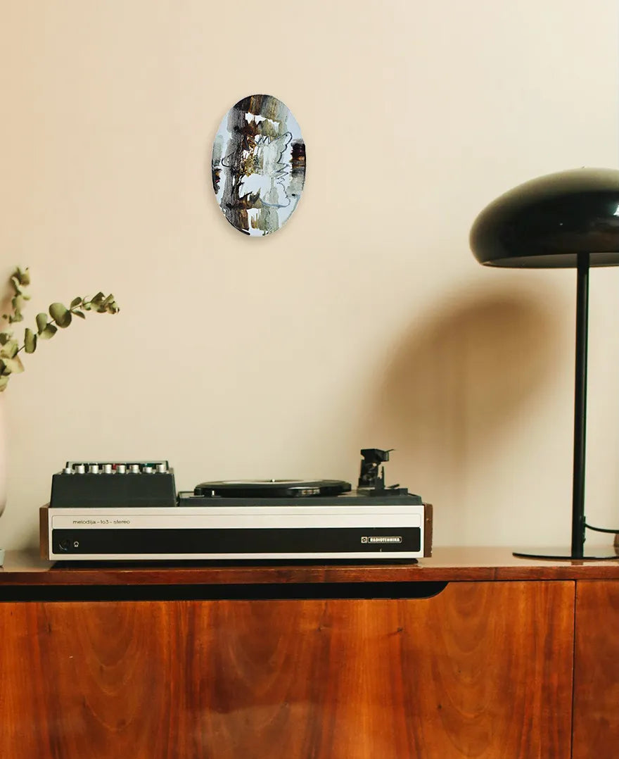 楕円の中に、白く抜けた層と濃淡の土色が滲み合い、掠れた線が遠景の地図のように揺れます。絵肌に残る痕跡は、風雨に晒された壁を撫でる感触を呼び起こします。飾ることで視線が奥へと導かれ、部屋に思考の深度が加わります。リビングの一角や廊下に置けば、石やリネンを用いた落ち着いた空間ともよく溶け合います。