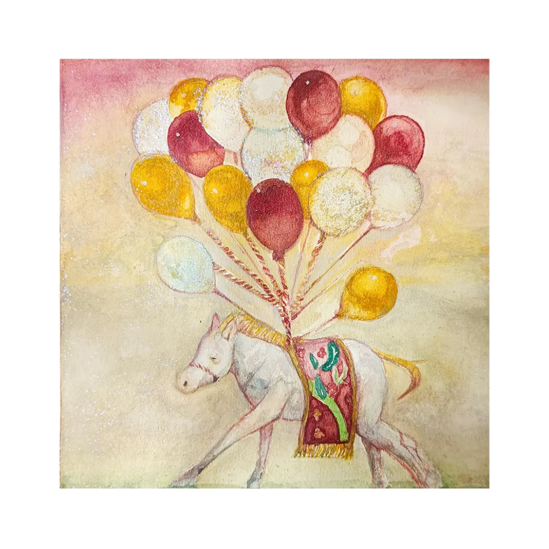 光をまとい、色とりどりの風船が空へ引き上げます。粒子のきらめきが時間を止め、温度のある色調が安心感を残します。白馬の歩みは軽やかで、童話の一場面が壁に現れたかのようです。飾ると視線が上へ誘われ、部屋に祝福の空気が広がります。玄関や子ども部屋、木目の家具や柔らかな布と合わせると、日常に微笑みが宿ります。