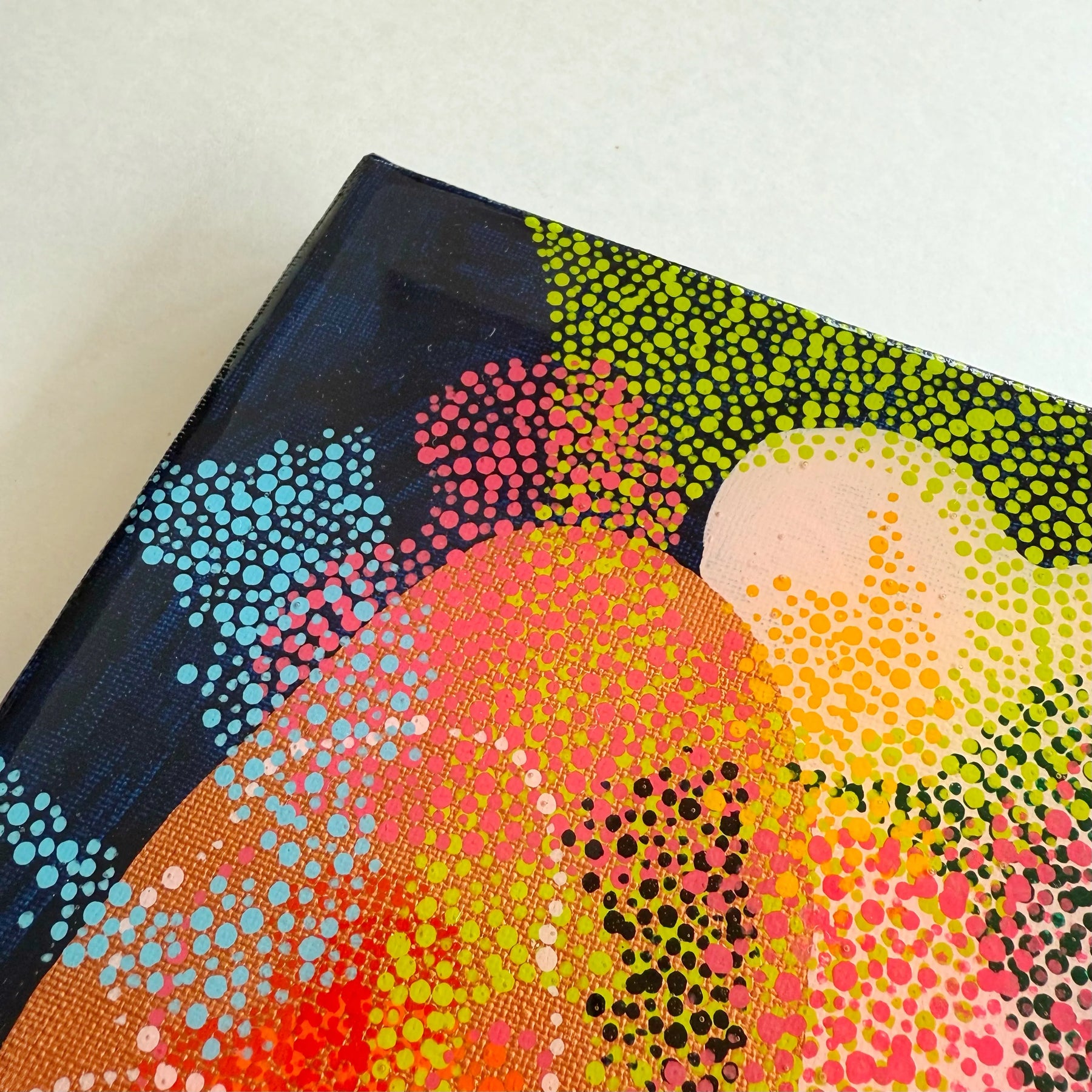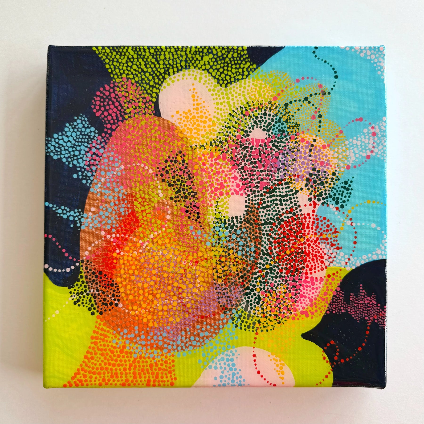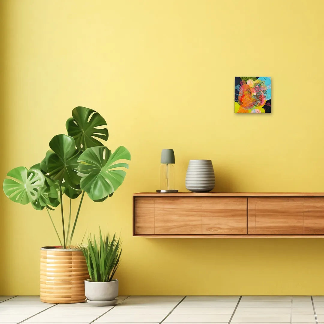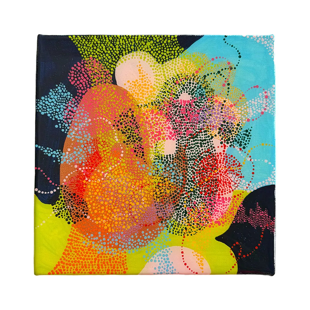 鮮やかなライムや水色の背景に、無数の色彩の粒が重なり合い、まるで光の粒子が躍動しているようです。緻密な点描が描く有機的な曲線は、新しい生命が芽吹く瞬間のエネルギーを湛え、見る人の心に晴れやかな喜びを運んでくれるでしょう。この一枚を壁に添えるだけで、空間全体に瑞々しい潤いが広がり、日々の暮らしを明るい希望で満たしてくれます。リビングの特等席や玄関に、カジュアルな家具とも美しく映えます。