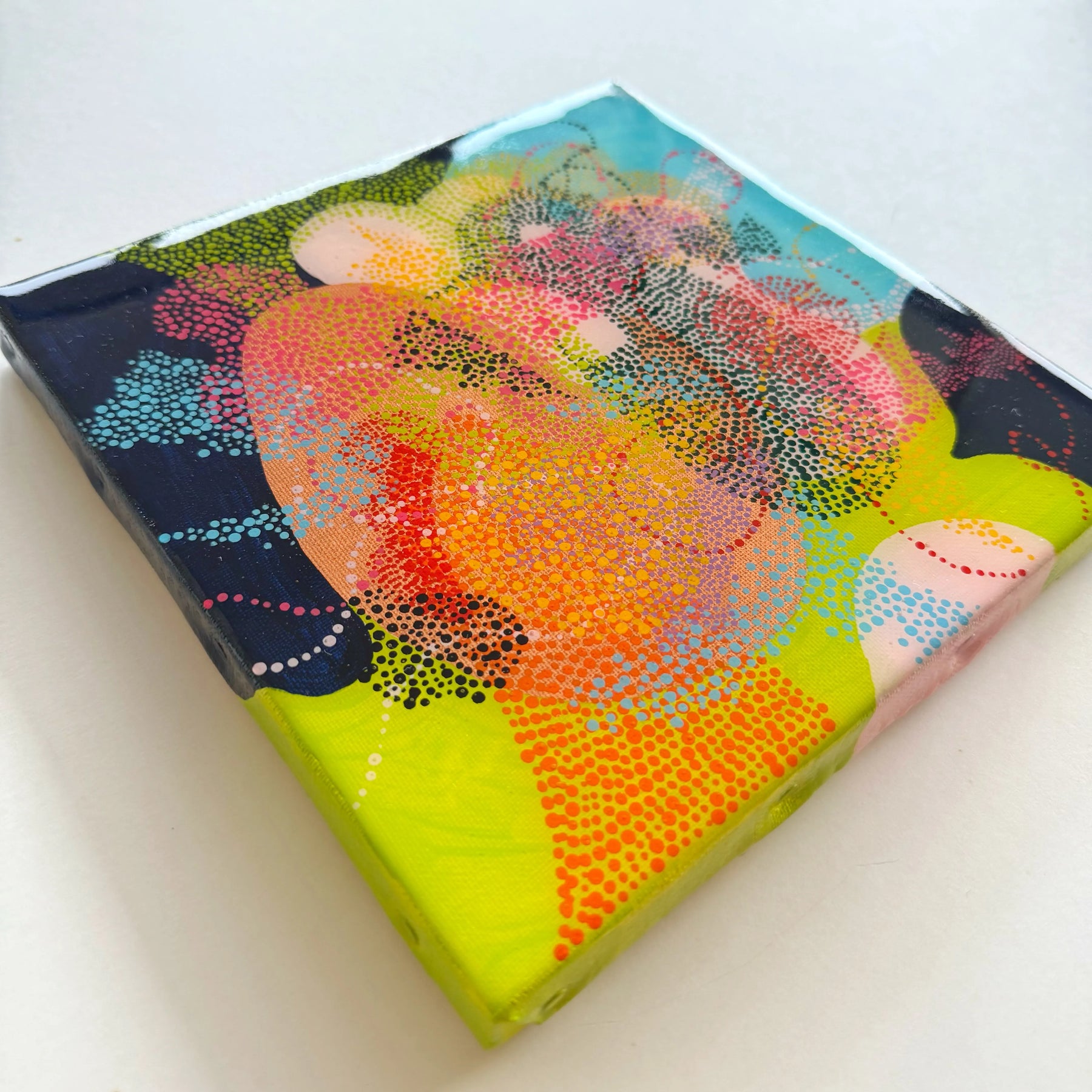 - ※写真ではわかりづらいですが、レジンコーティングしているので、とても光沢があります。絵の側面には滴り落ちるレジンがそのまま固まって残っているので、面白いです。
