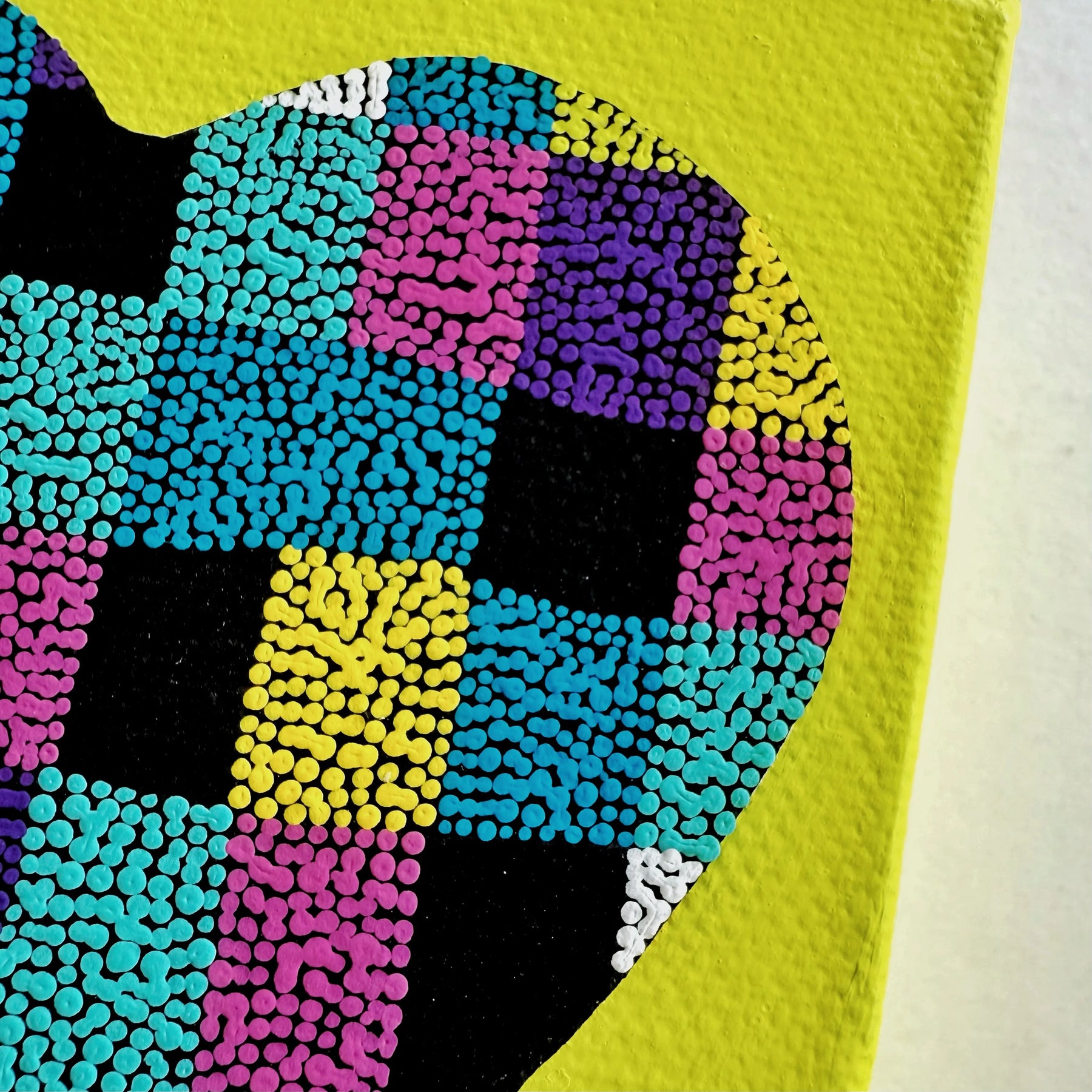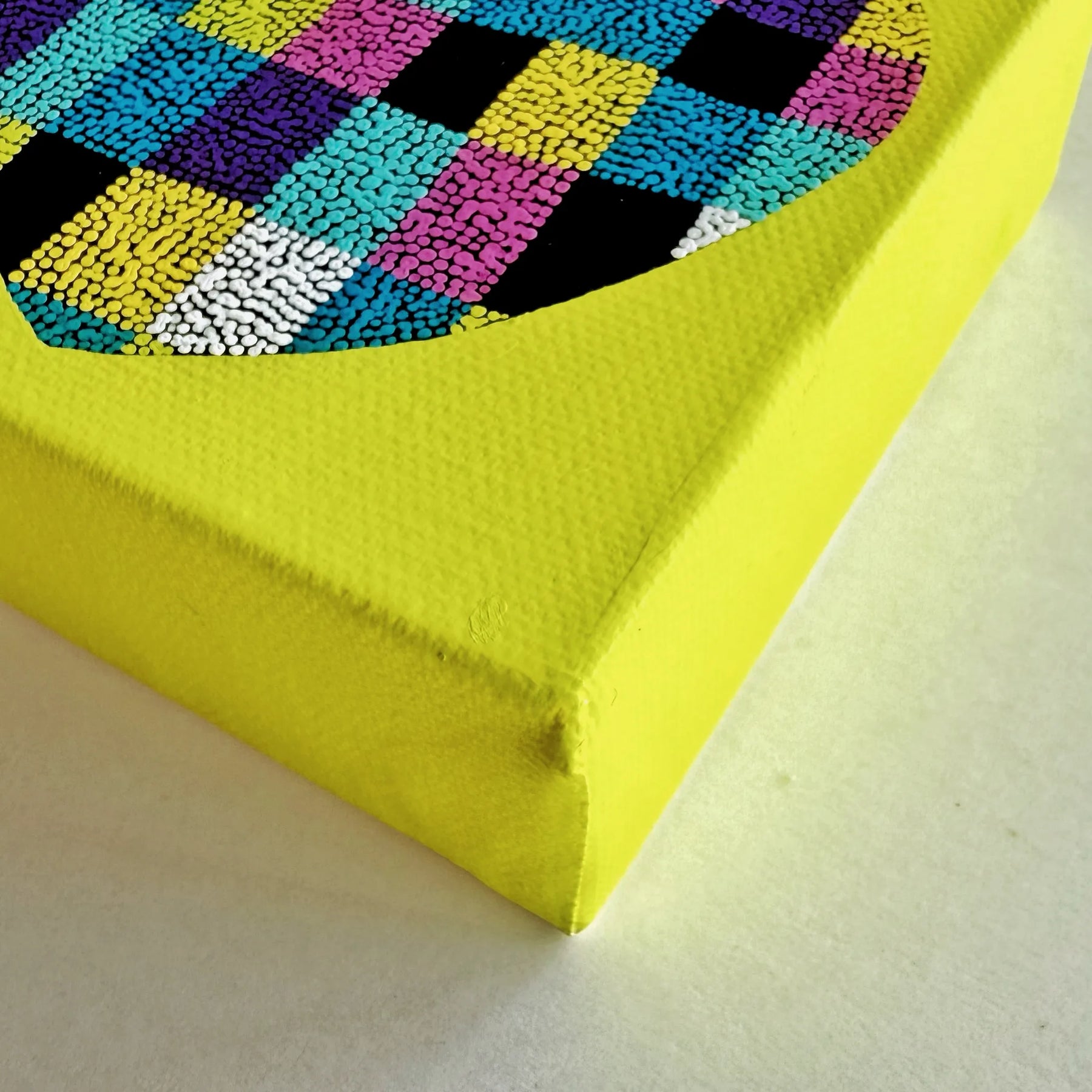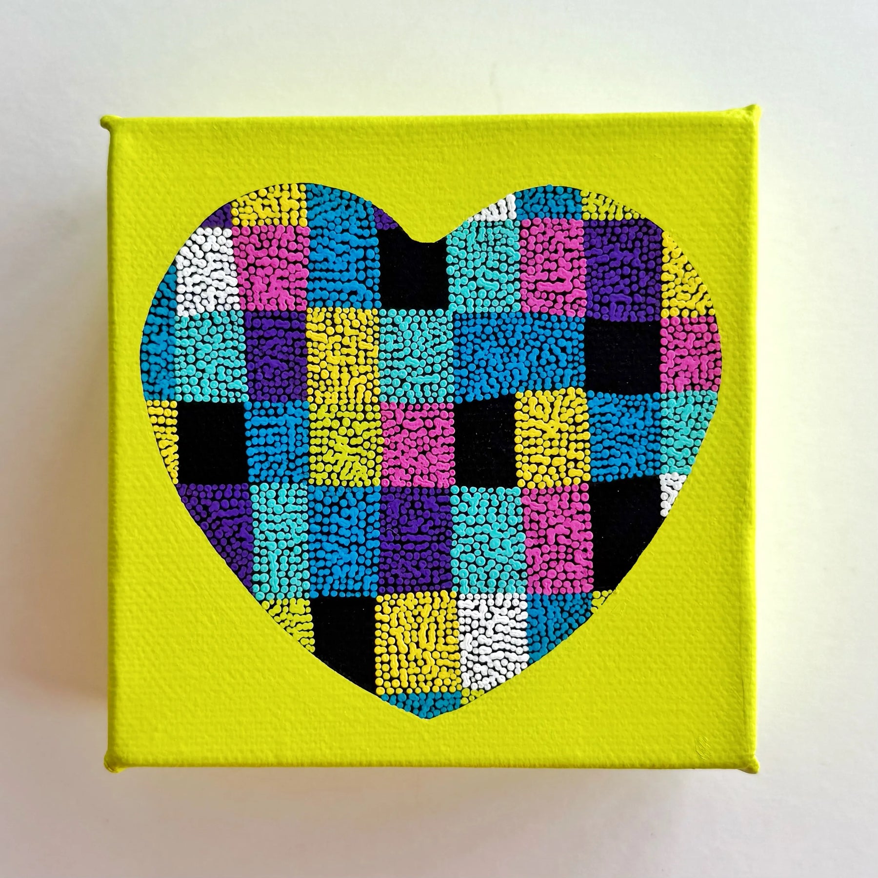 ライムカラーの背景に浮かぶハートの中に、緻密なドットが織りなす極彩色の格子模様が、弾むような喜びを奏でています。一粒ずつ丁寧に置かれた色彩の粒は、大切な人への想いや日々のときめきが結晶したかのようで、見つめるたびに心の内側から元気が湧いてくるでしょう。この作品を一点飾ることで、お部屋の雰囲気がぱっと明るく塗り替えられ、空間全体に前向きで愛おしい空気感が満ちていきます。玄関や廊下など、白い壁のワンポイントとしてモダンな調度品と合わせるのもお洒落です。
