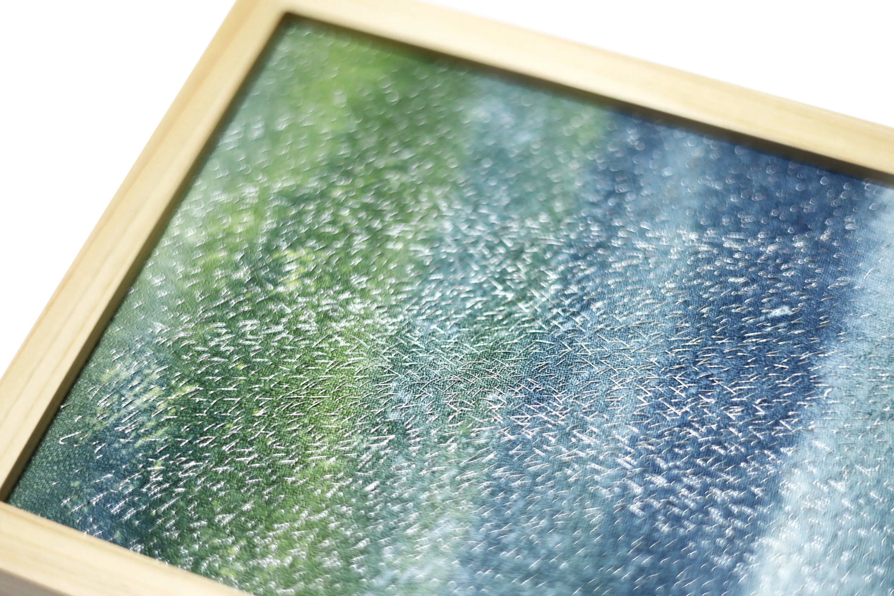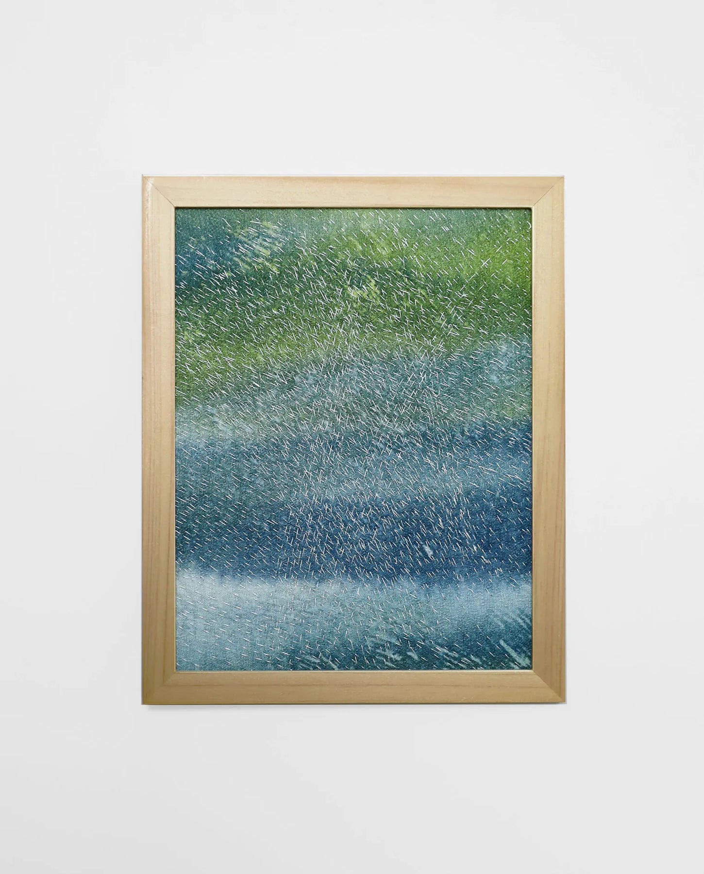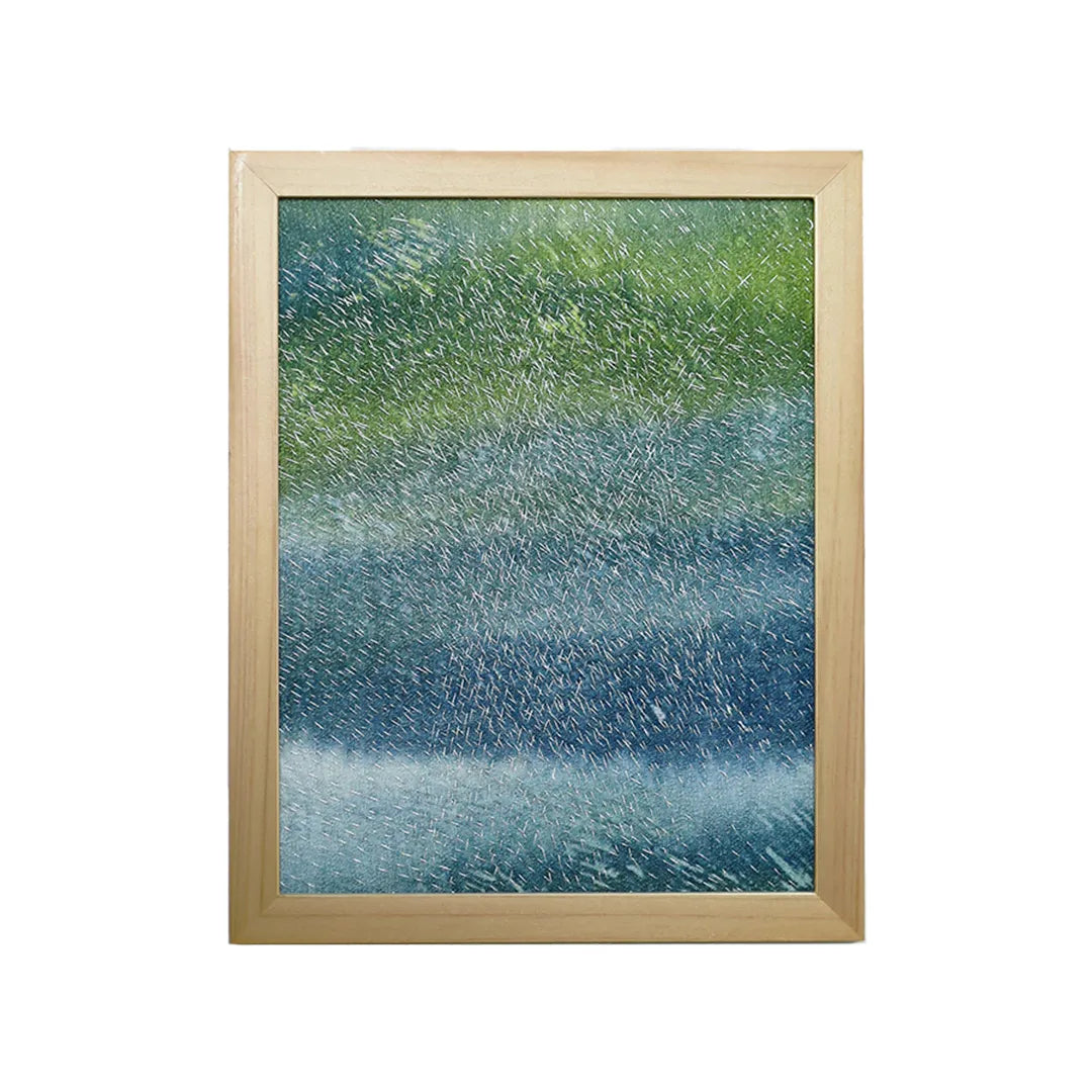 静かな雨の気配が広がるように、青と緑の層がゆるやかに混じり合い、無数の白い光がさざめいています。視線を預けるたびに、遠くの水面を覗き込むような心地よさが訪れます。壁に飾ると、空間に涼やかな揺らぎが生まれ、時間の流れが穏やかに整います。木の質感をもつ家具や、やわらかな照明のあるリビングにも静かに溶け込みます。