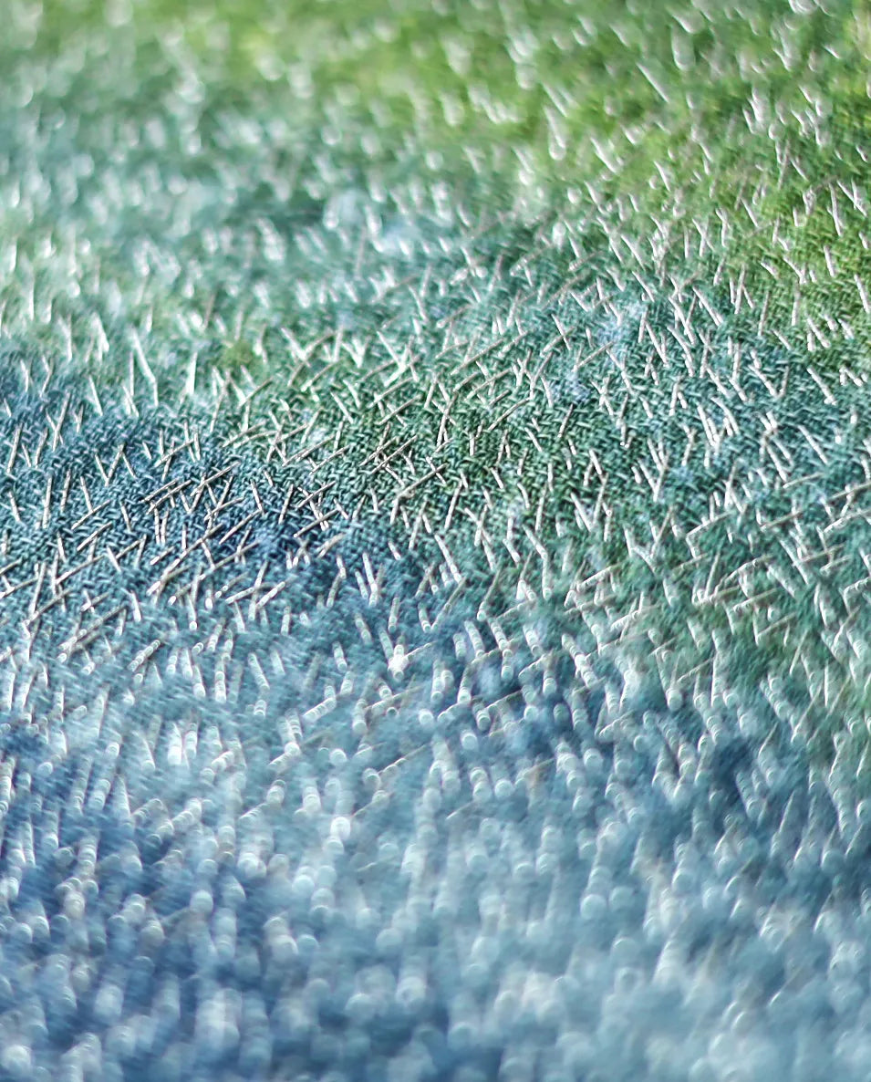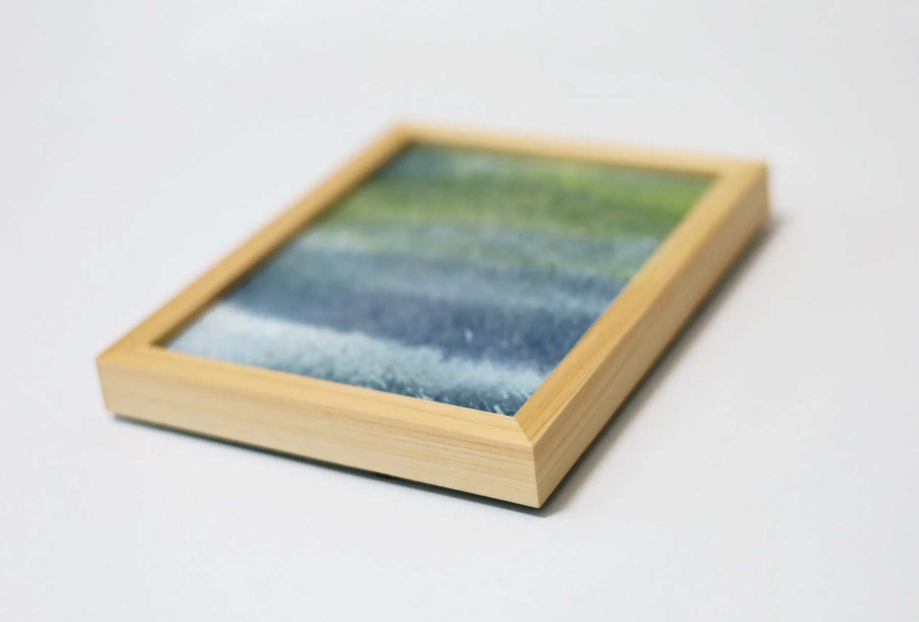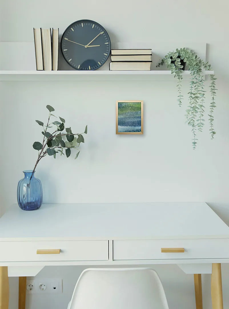 静かな雨の気配が広がるように、青と緑の層がゆるやかに混じり合い、無数の白い光がさざめいています。視線を預けるたびに、遠くの水面を覗き込むような心地よさが訪れます。壁に飾ると、空間に涼やかな揺らぎが生まれ、時間の流れが穏やかに整います。木の質感をもつ家具や、やわらかな照明のあるリビングにも静かに溶け込みます。