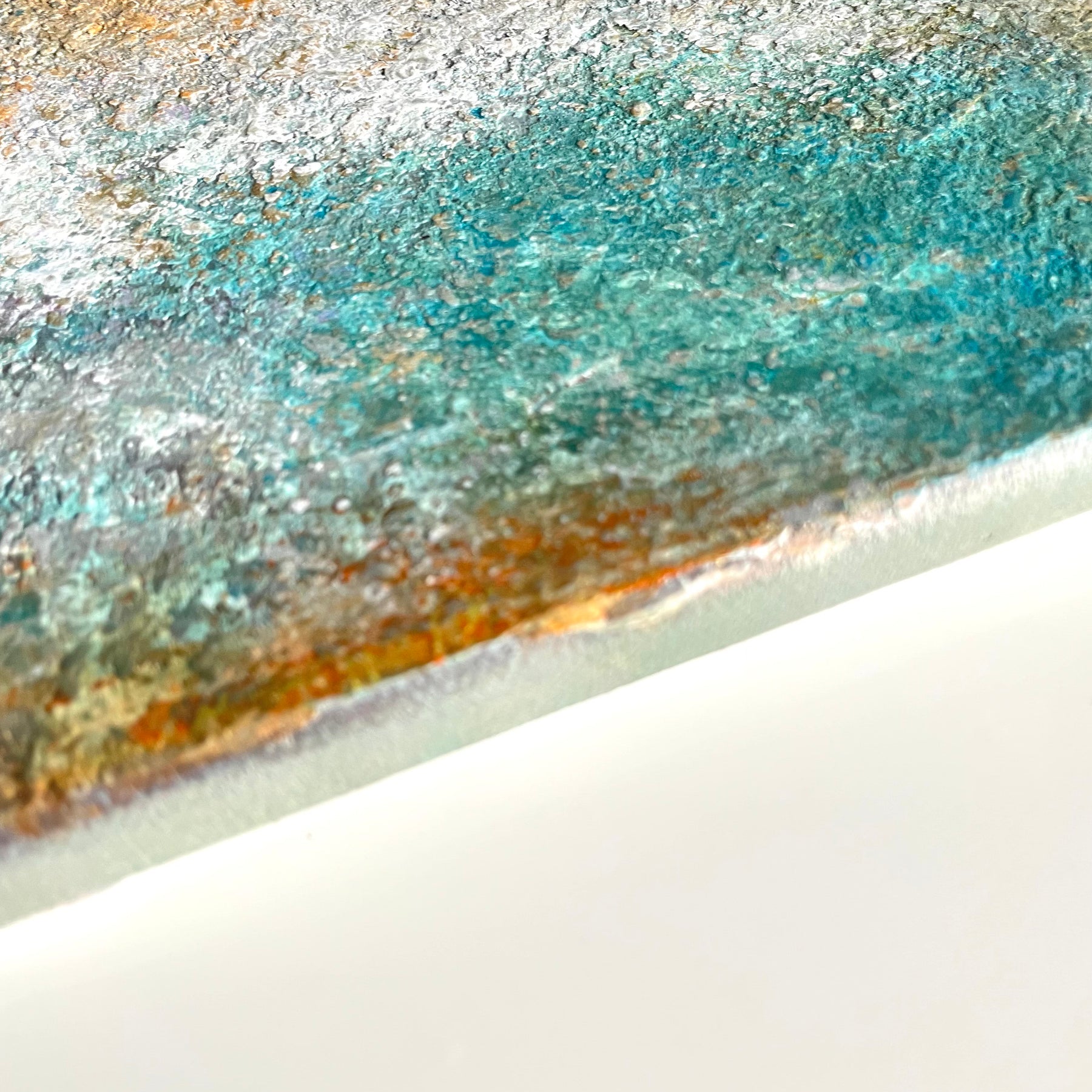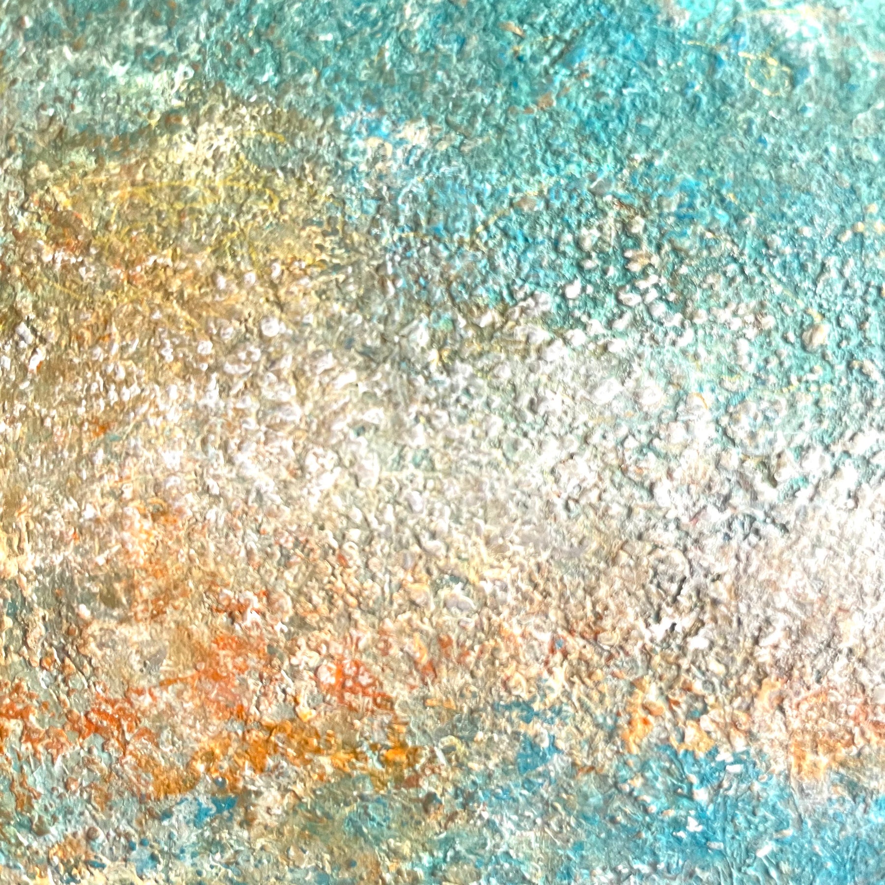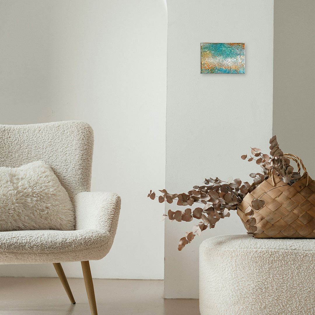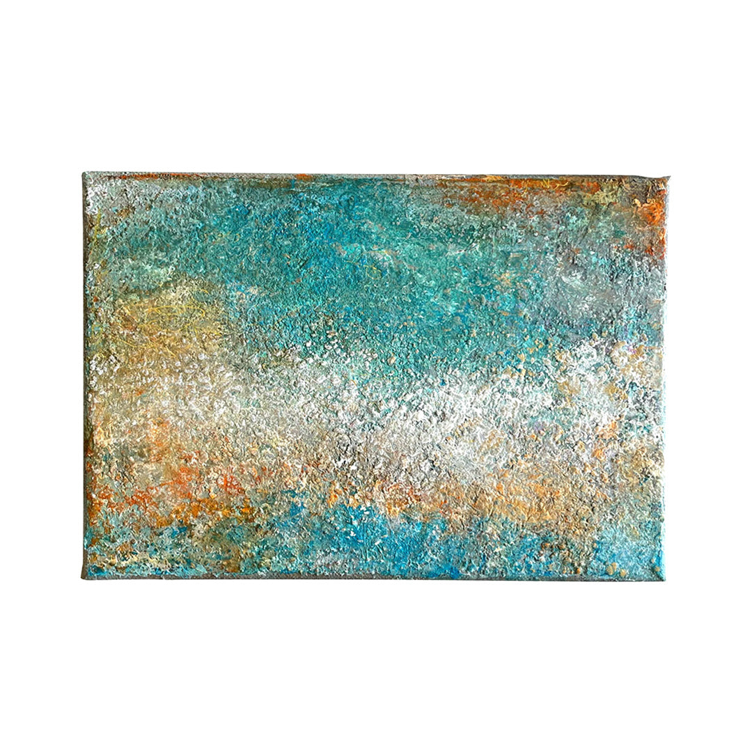鮮やかなターコイズブルーと、砂浜を思わせる暖色が混じり合い、波しぶきが太陽に輝く海岸線を彷彿とさせます。細かな凹凸が織りなす複雑なマチエールは、自然の力強さと、寄せては返す水の永遠の営みを肌で感じさせてくれるでしょう。この作品を一点飾ることで、室内に瑞々しい潤いと開放感が広がり、日常のひとときが爽やかな潮風に満たされます。リビングの特等席や玄関に、モダンな空間の彩りとして品よく馴染みます。