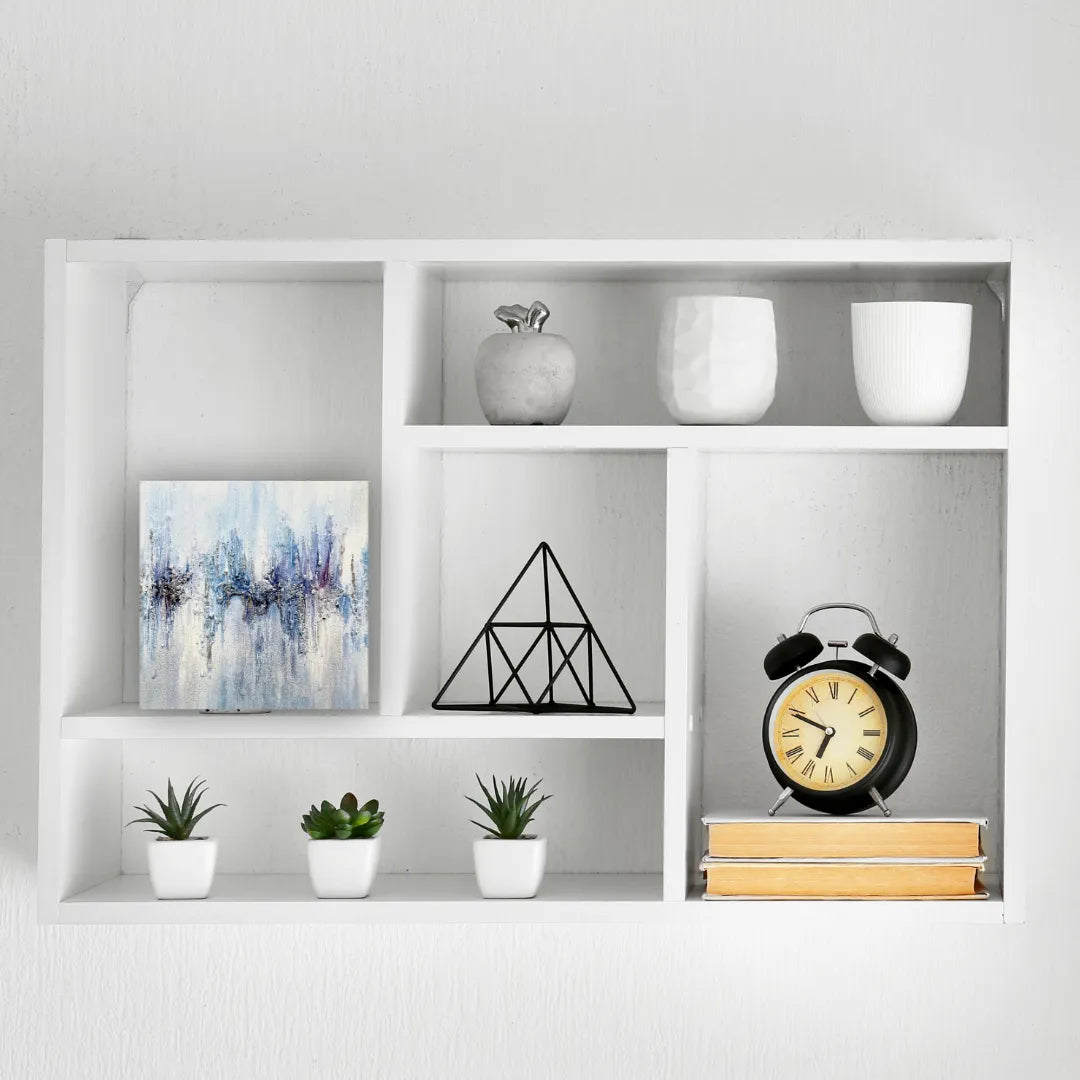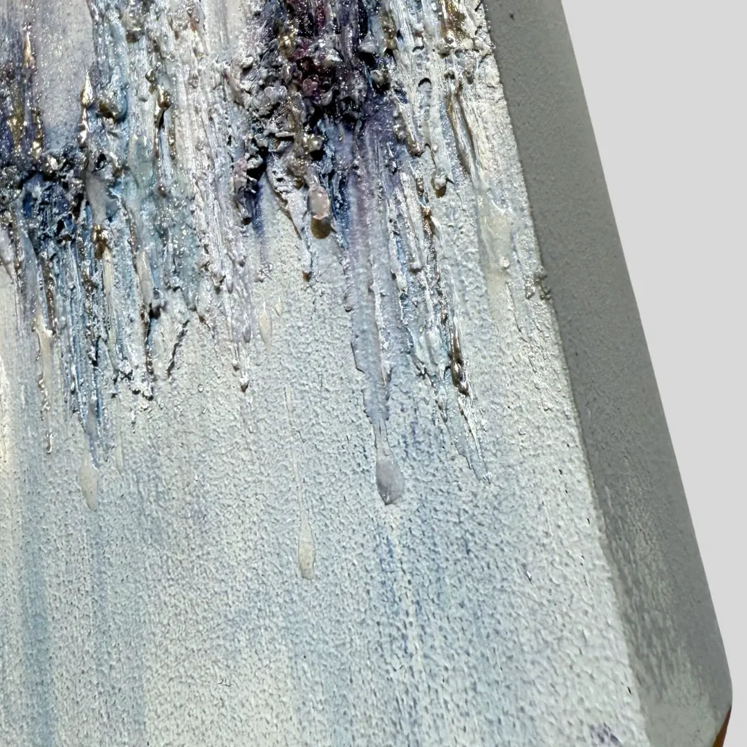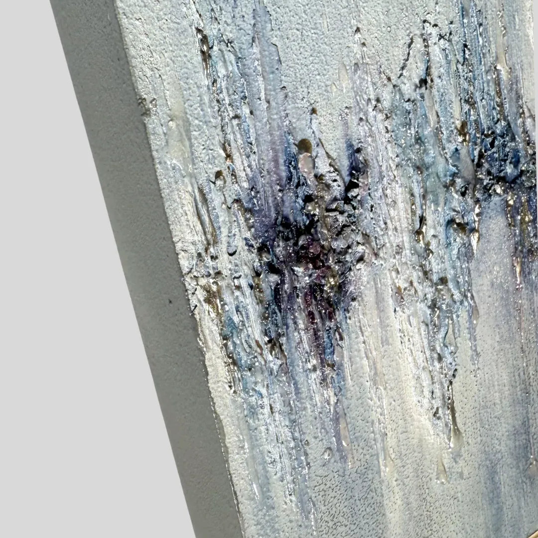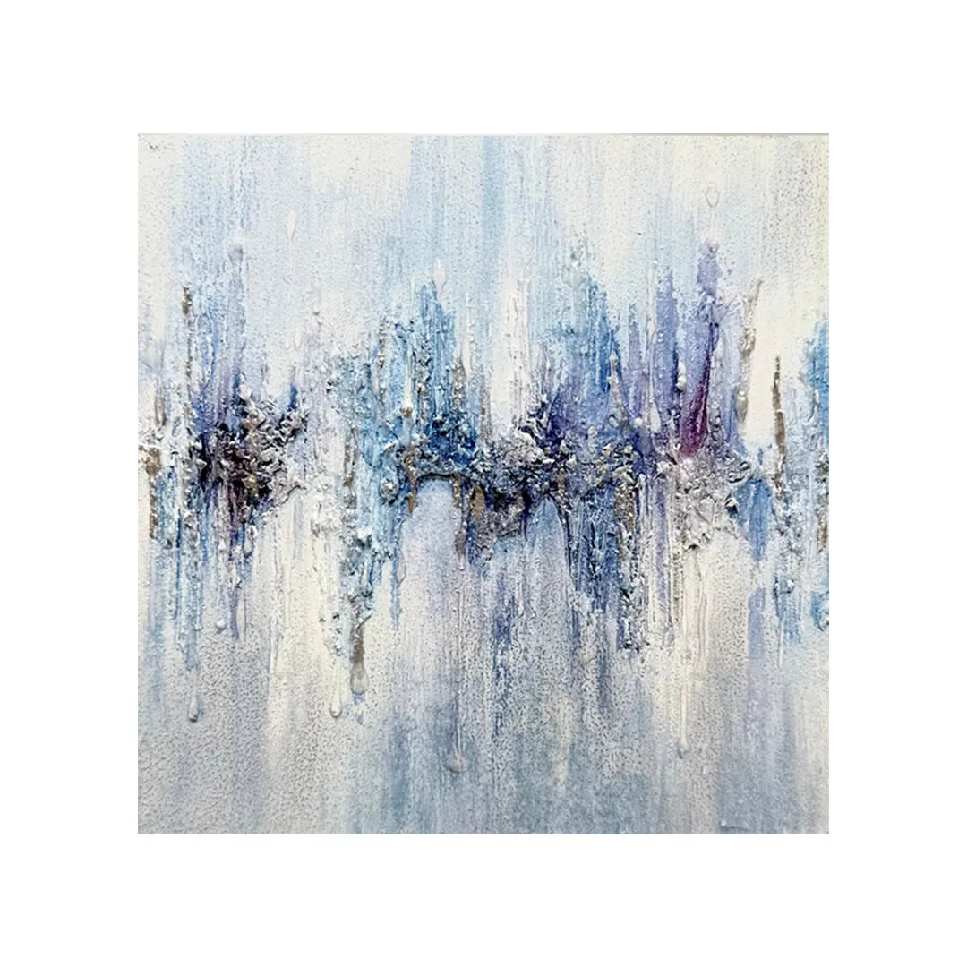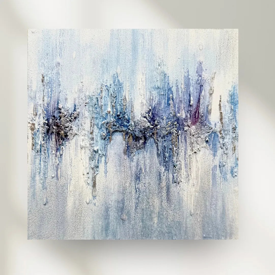 透きとおる青が滲み、氷の結晶のような質感が静かに広がっています。冷たさの中にほのかな温度が宿り、耳を澄ますと遠くで響く音の余韻が感じられます。壁に掛けると、空間に清らかな緊張感が生まれ、呼吸が整うような静けさが漂います。白を基調としたミニマルなリビングや、陽の光が差し込む寝室にも穏やかに調和します。