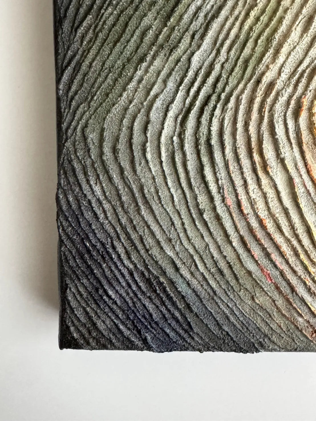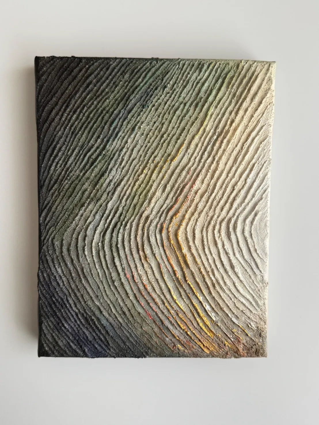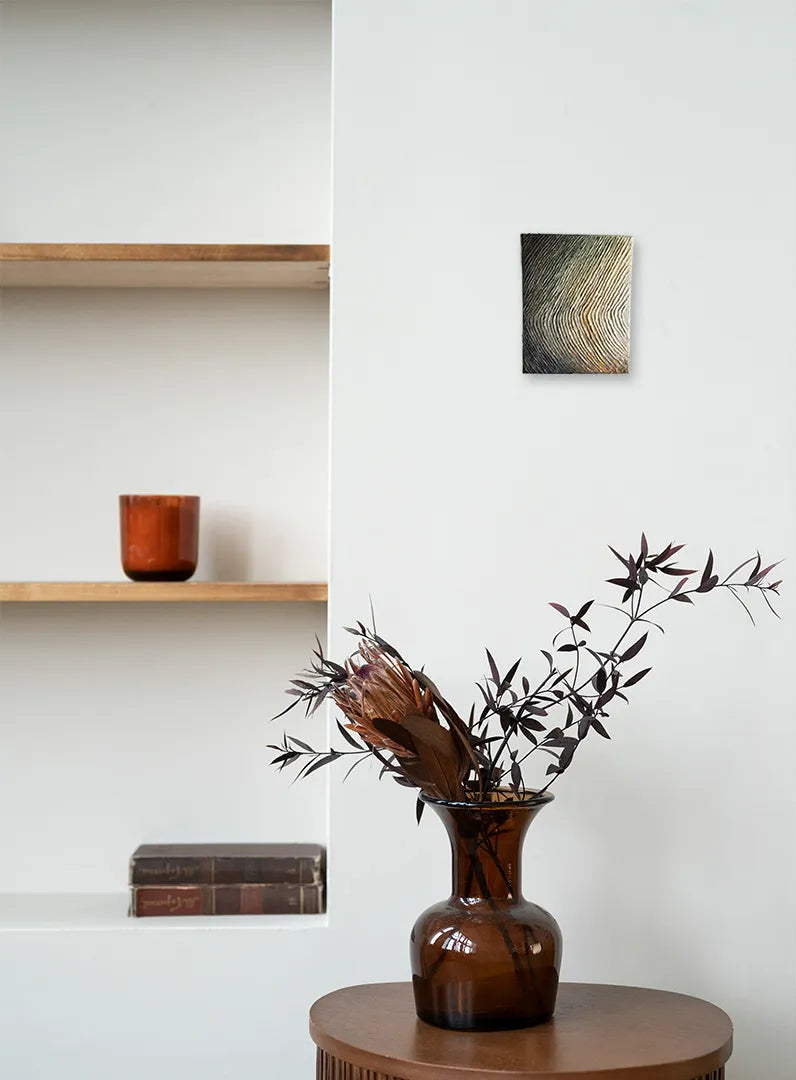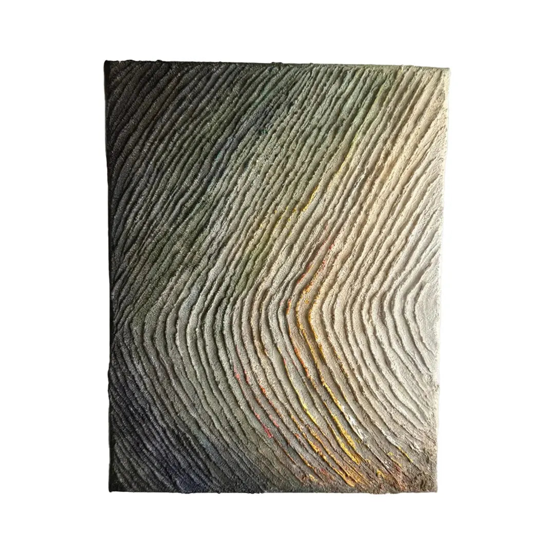 岩肌のような力強い隆起が幾重にも重なり、悠久の時を経て形作られた大地のうねりを感じさせます。深い陰影を伴う凹凸の表情は、光の角度によって刻々と変化し、見るたびに異なる情緒を呼び起こしてくれるでしょう。この作品を一点飾ることで、無機質な壁面に豊かな生命感と奥行きが加わり、自分自身を深く見つめるための静謐な場所へと変えてくれます。書斎や玄関の正面に、モダンな調度品と合わせるのも洗練された印象です。
