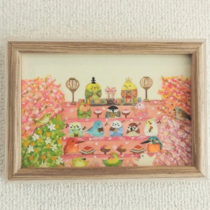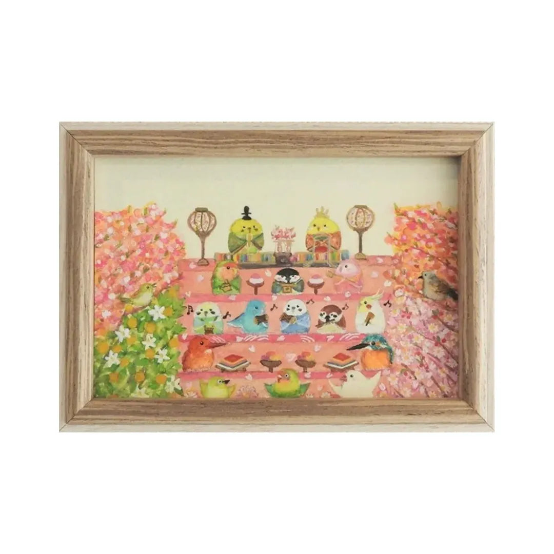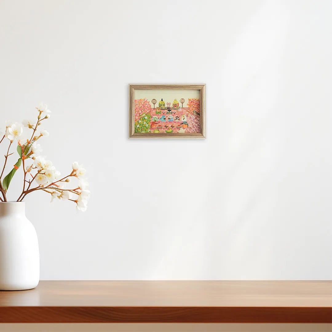 色とりどりの小鳥たちが並ぶ愛らしい雛飾りは、眺めているだけで心にぽっと灯がともるような温かさに満ちています。満開の桜と瑞々しい橘に囲まれた賑やかな風景は、春の訪れを告げる喜びの旋律が聞こえてくるかのようです。この作品を飾ることで、いつもの日常がふわりと軽やかになり、家の中に柔らかな陽だまりが生まれたような心地よさに包まれます。リビングの飾り棚や明るい玄関に置くと、ナチュラルな木の家具とも素敵に調和します。
