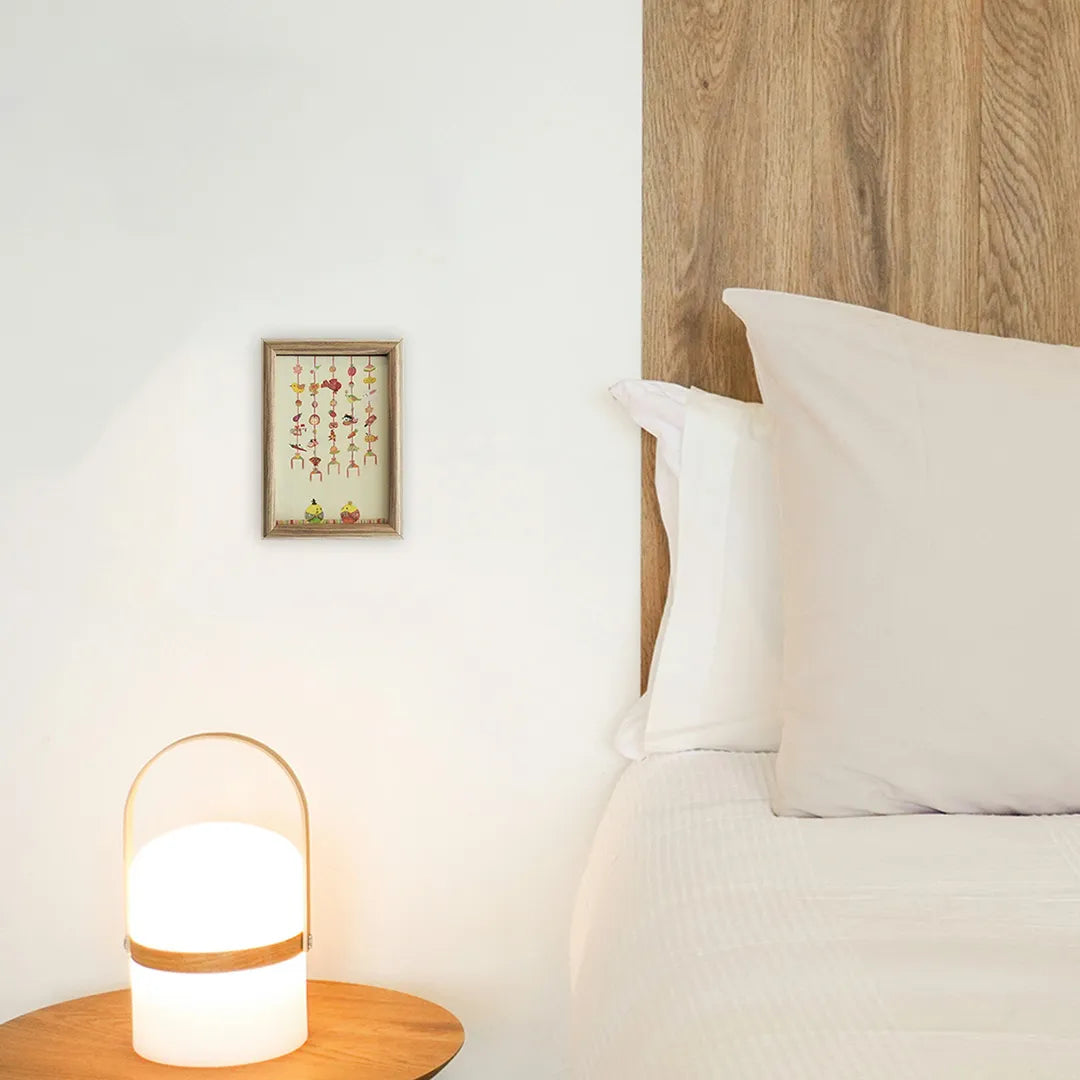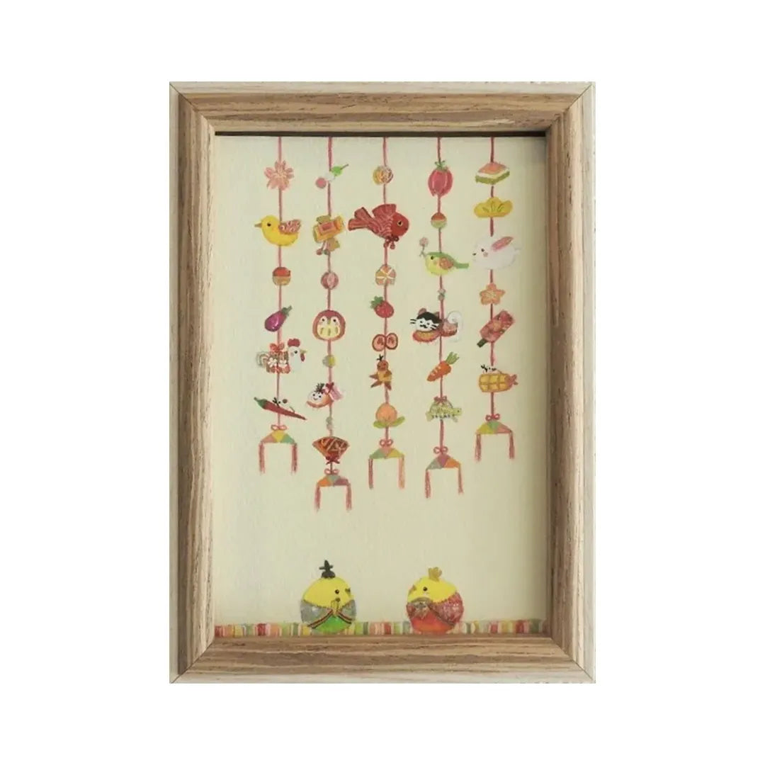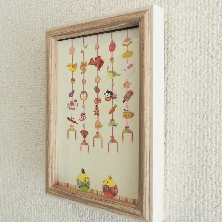 和菓子のように愛らしいモチーフが縦に並び、画面全体から朗らかな春の息吹が伝わってきます。ふっくらとした鳥や色とりどりの細工が揺れる様子は、古き良き伝統を現代的な感性で編み直したかのようです。この作品を壁に掛けるだけで、家族が集うリビングに晴れやかで温かな光が灯るでしょう。木目調のチェストの上や玄関に添えれば、ナチュラルな北欧家具とも和モダンな空間とも心地よく共鳴します。