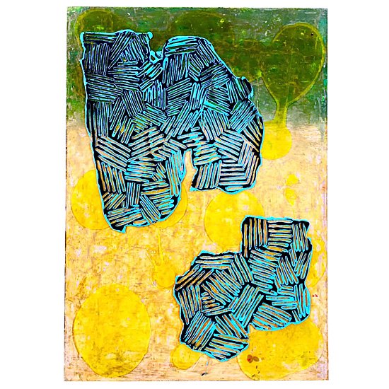 - ペンとアクリル絵具のドローイングの上に、アクリル板を重ねています。その上のドローイングを彫刻刀で削っています。 光の反射で様々な表情を見せてくれます。